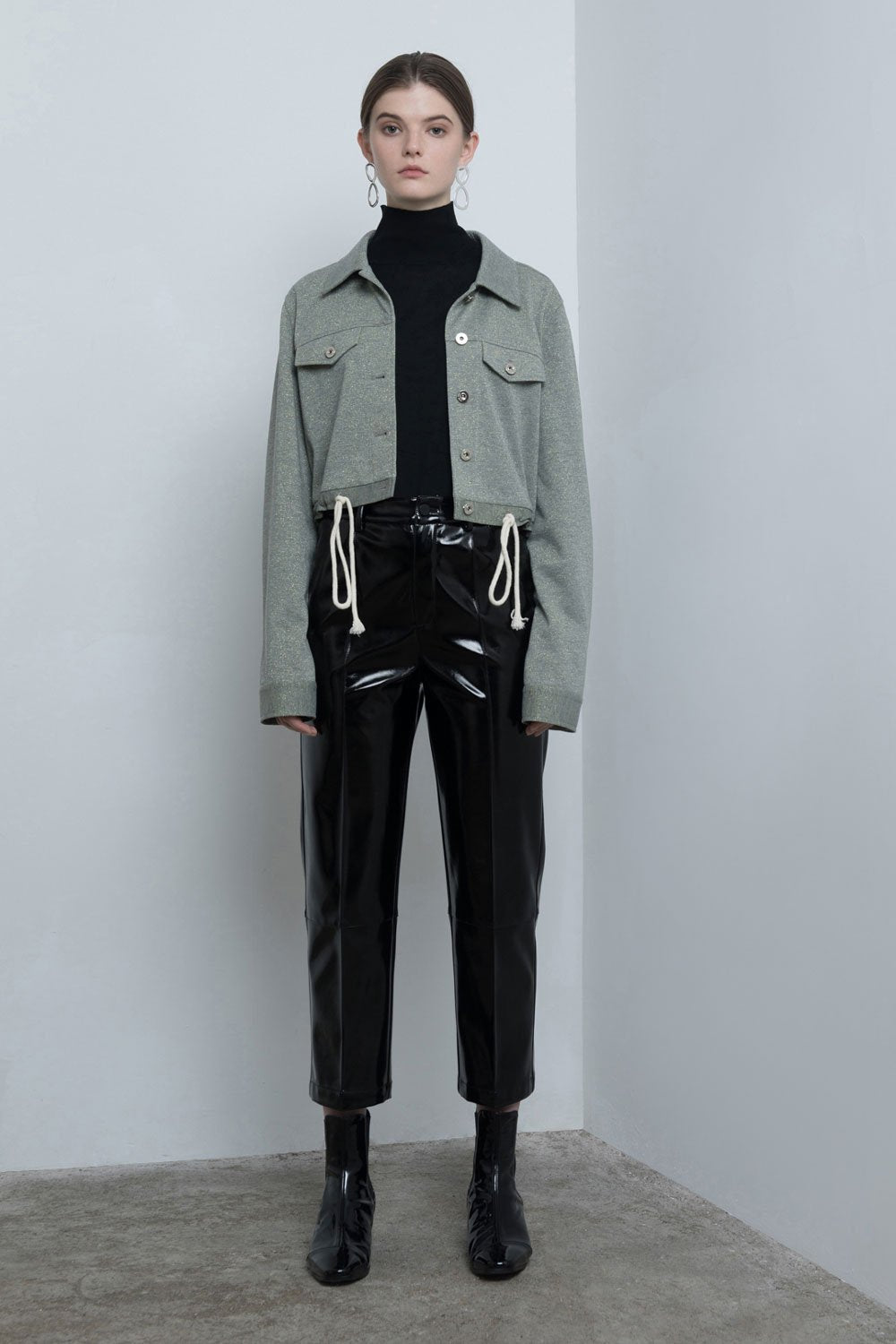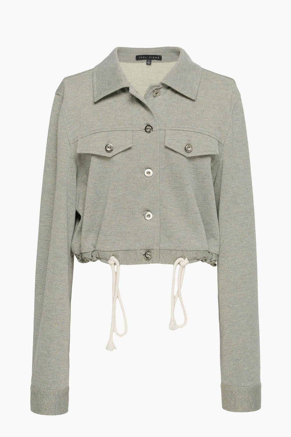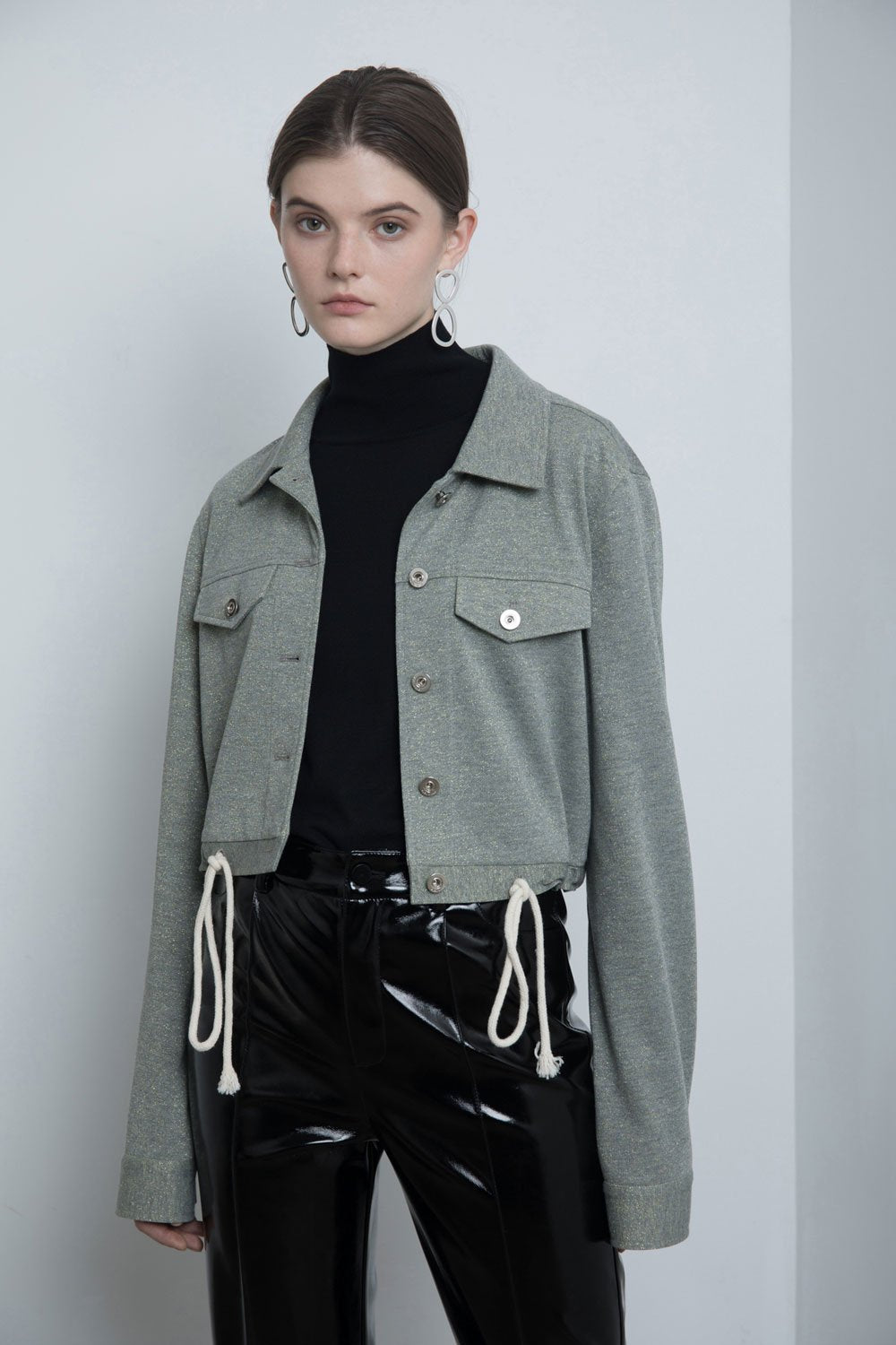 Yuel Xiang casual lightweight button-down shorts jacket features a shimmery gold thread throughout and drawstring at the waist for easy cinching.