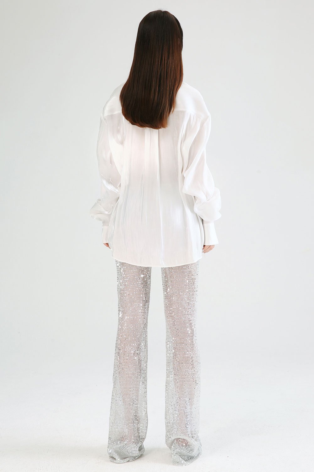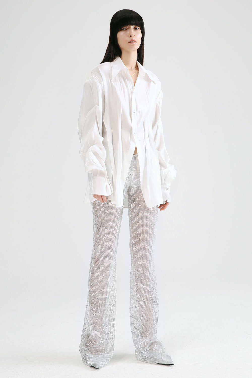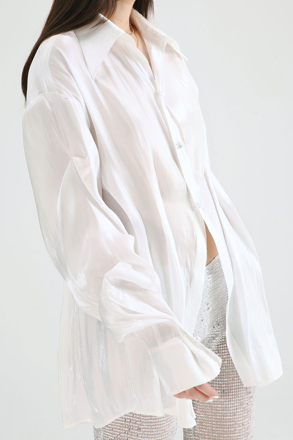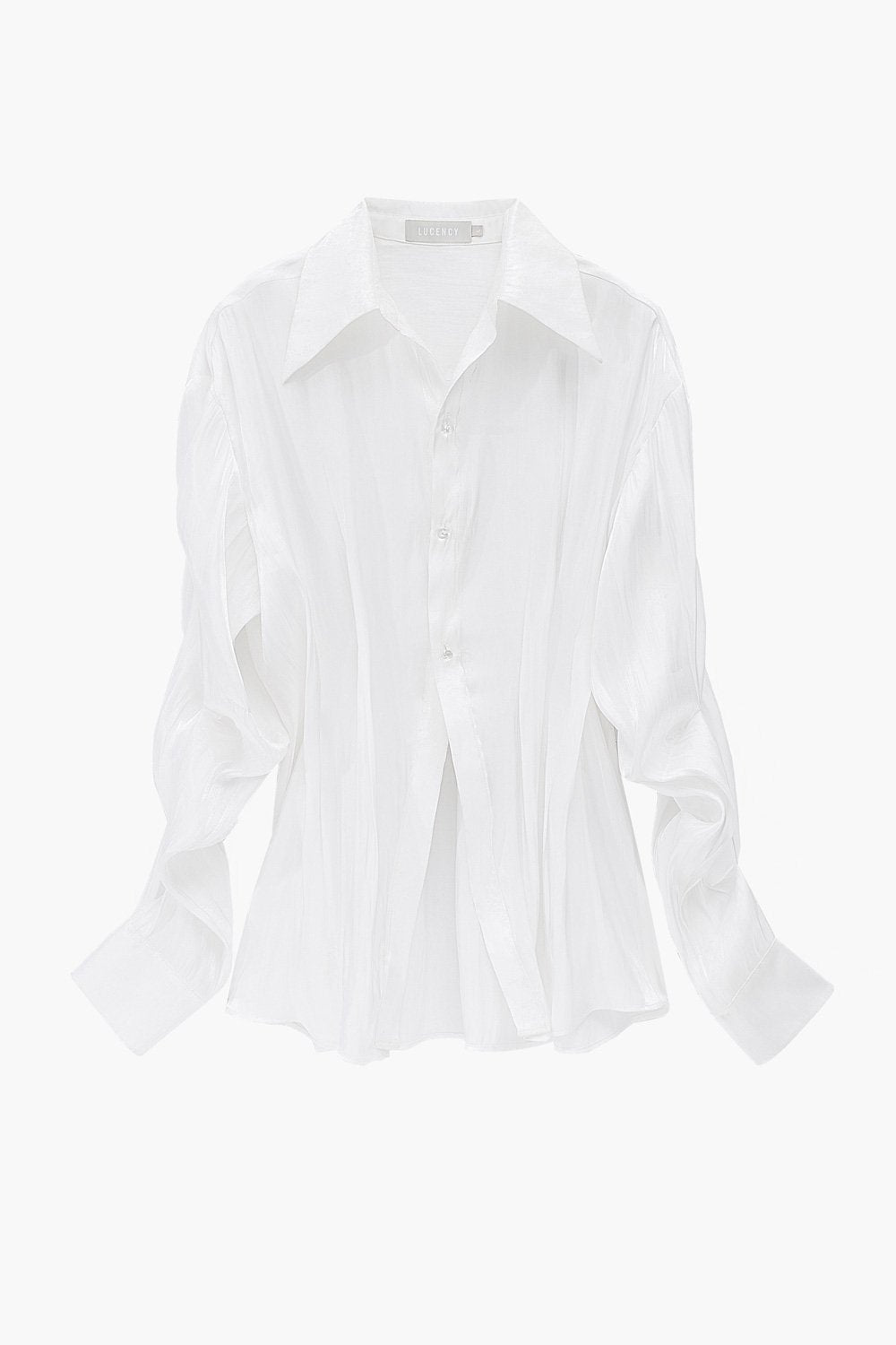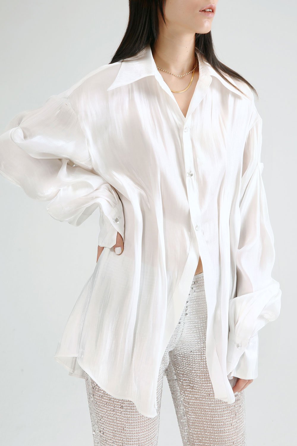 Lucency pleated sheer shirt features oversized sleeves, pleats deconstructed pleats throughout, three round clear buttons at front and soft sheen to finish.