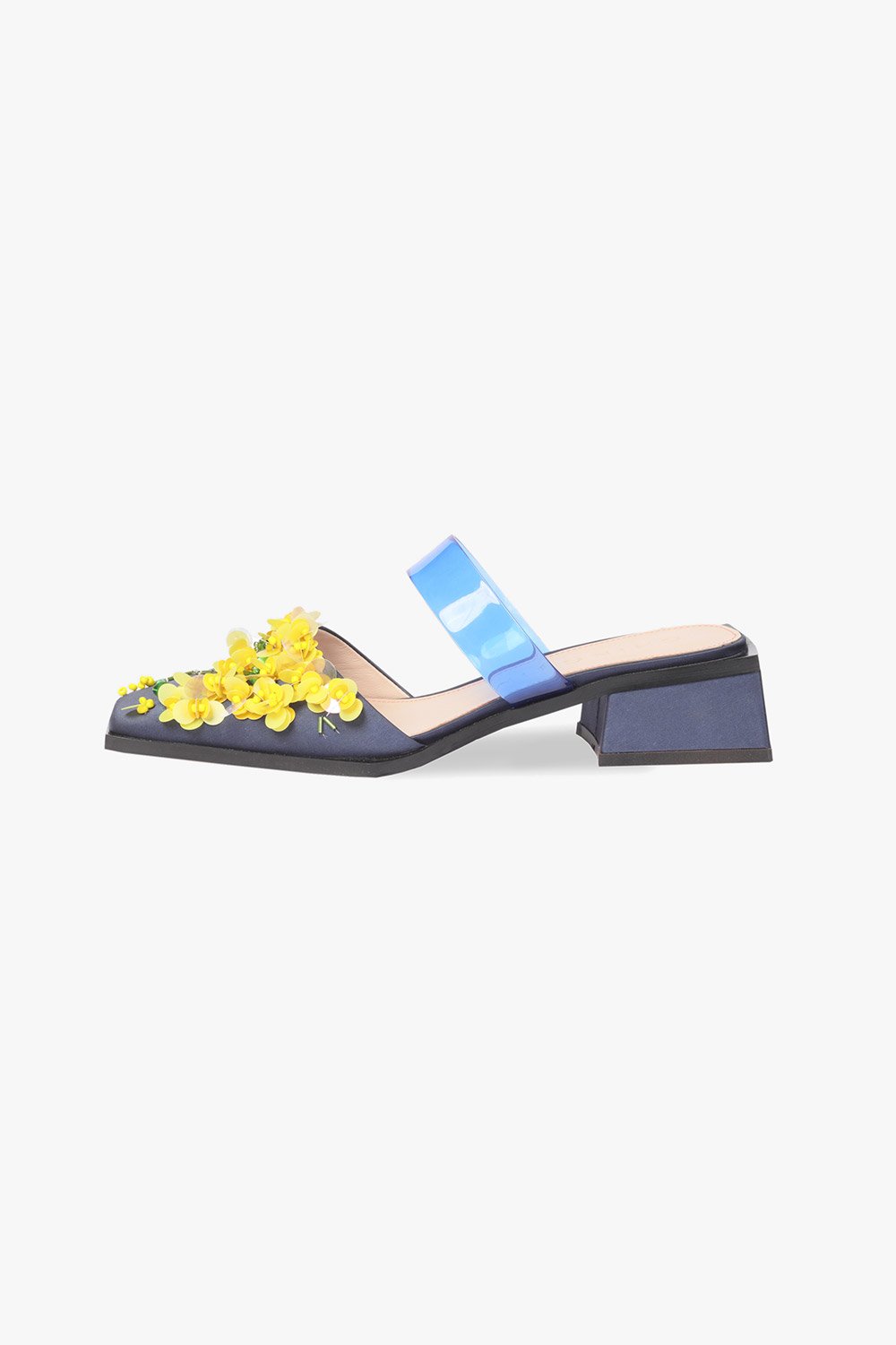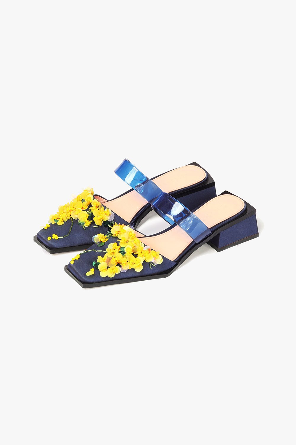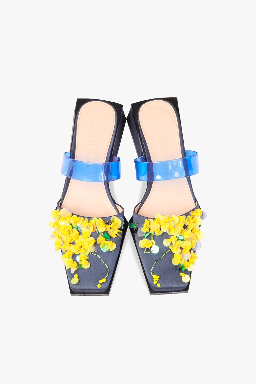 CHINCHIN floral sequins low heel mule sandals in blue.