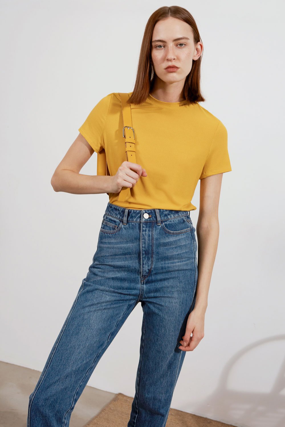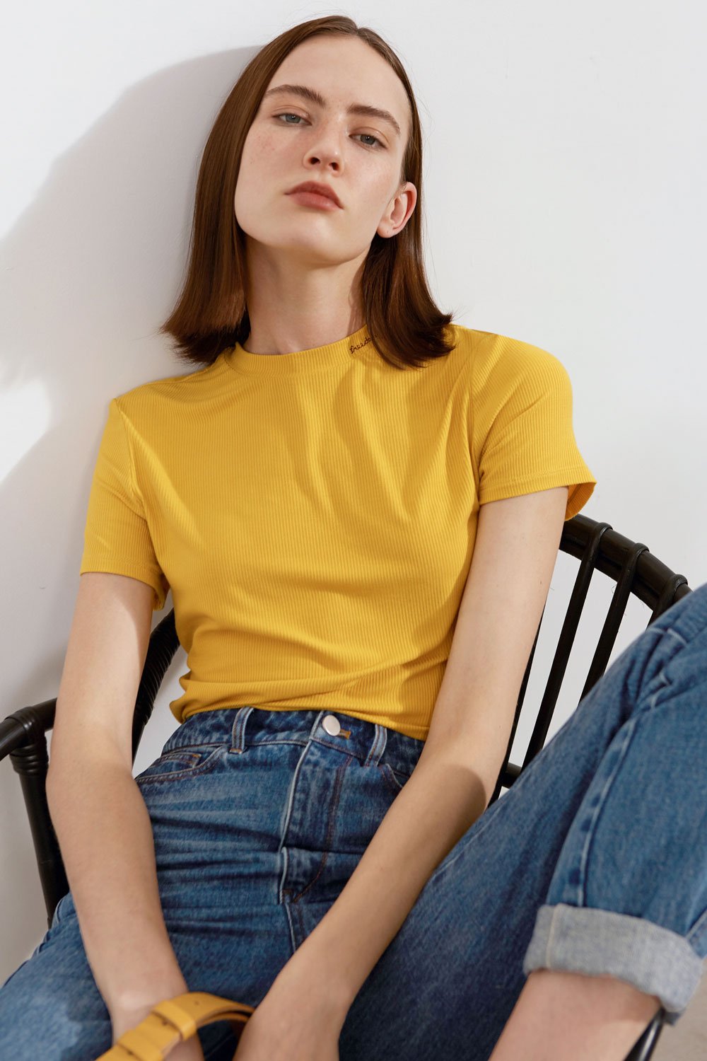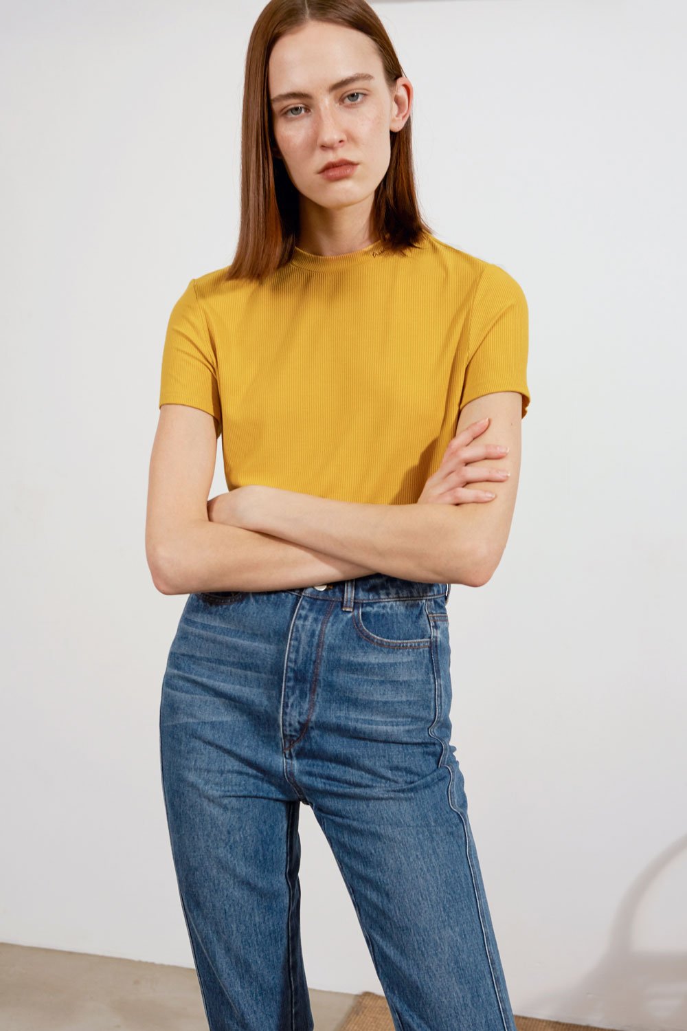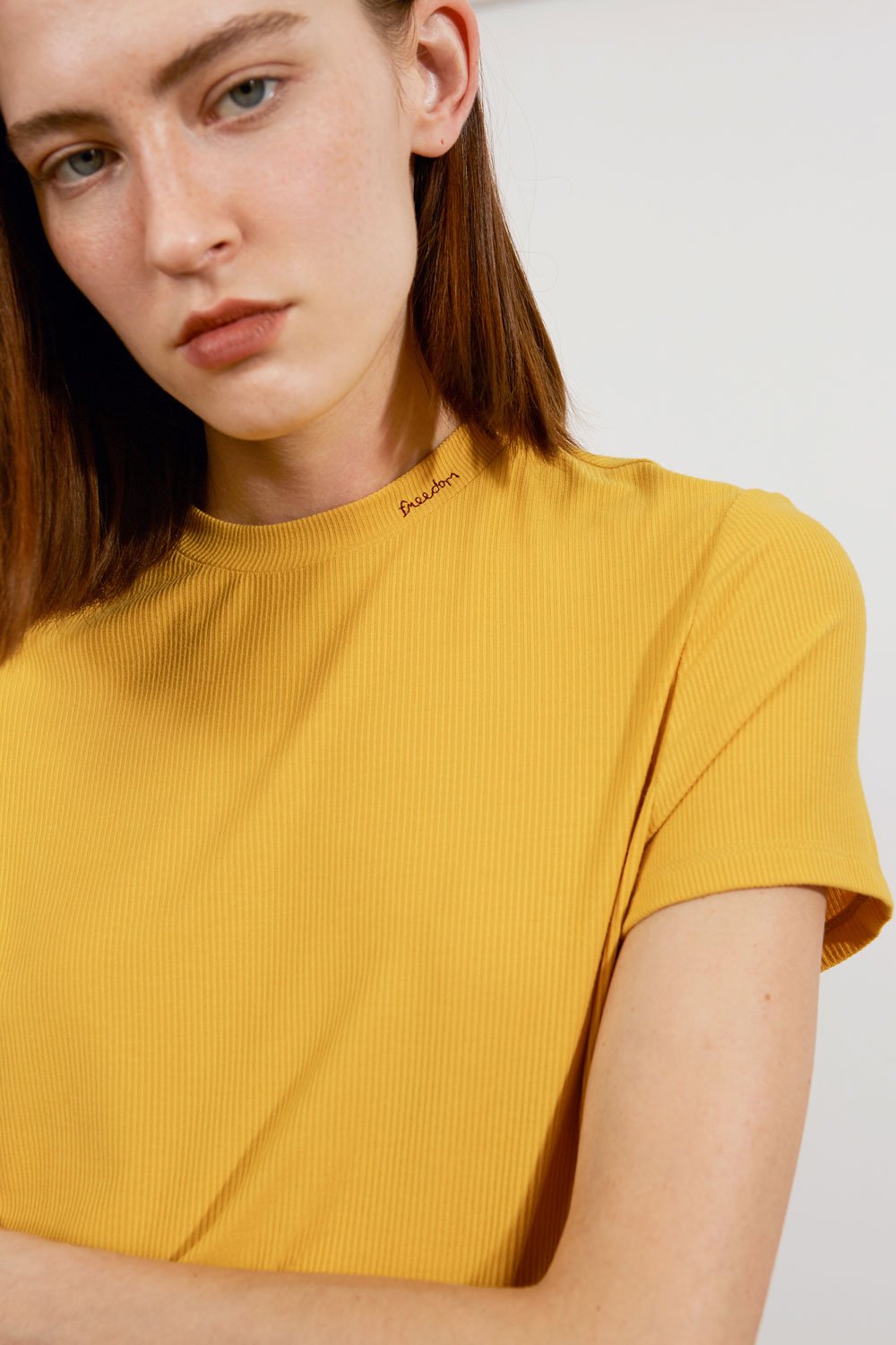 RLL studio thin ribbed t-shirt with embroidered Freedom logo on collar in mustard yellow.