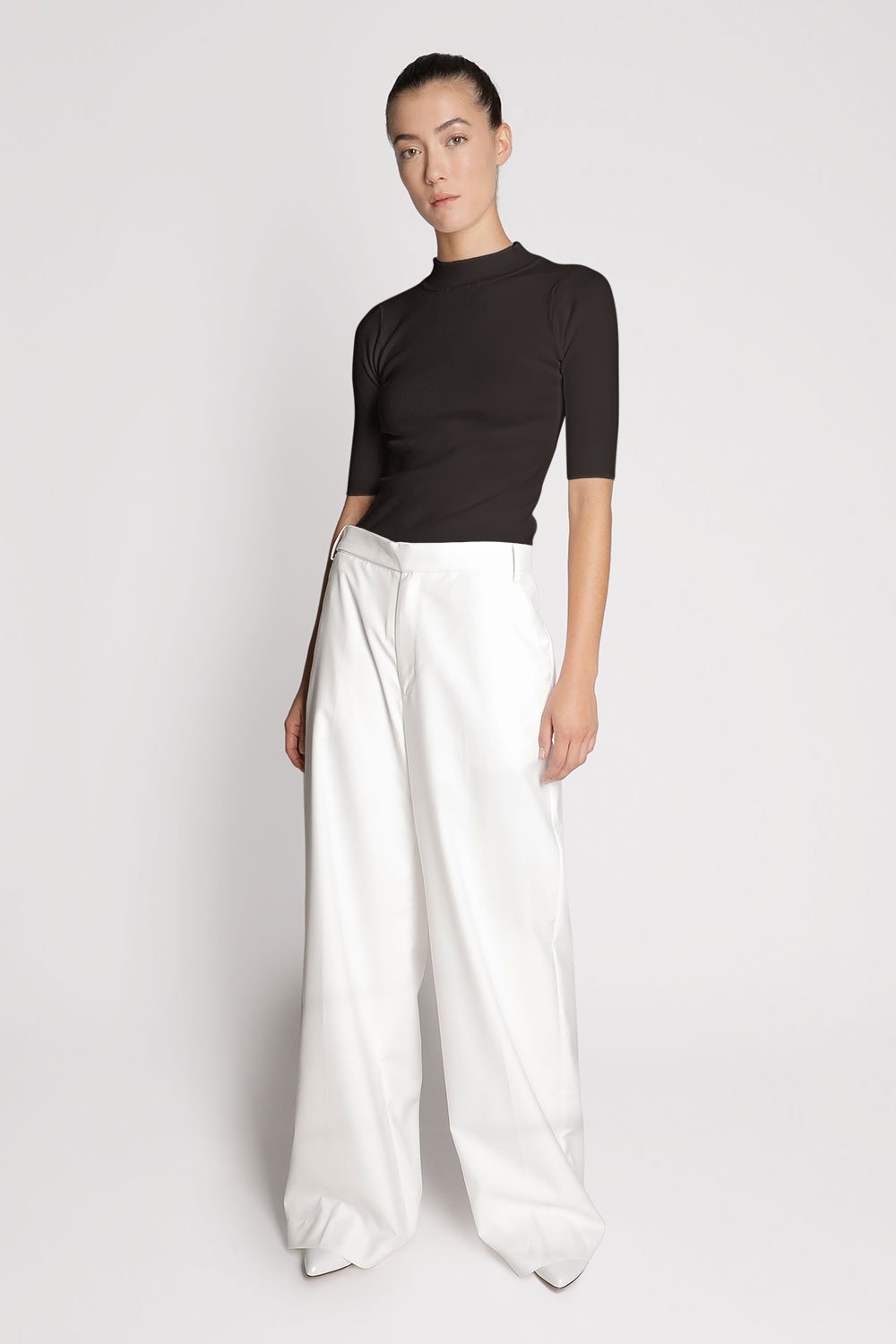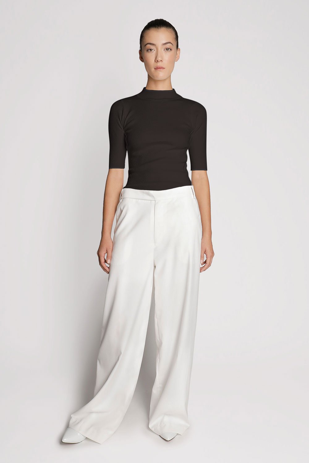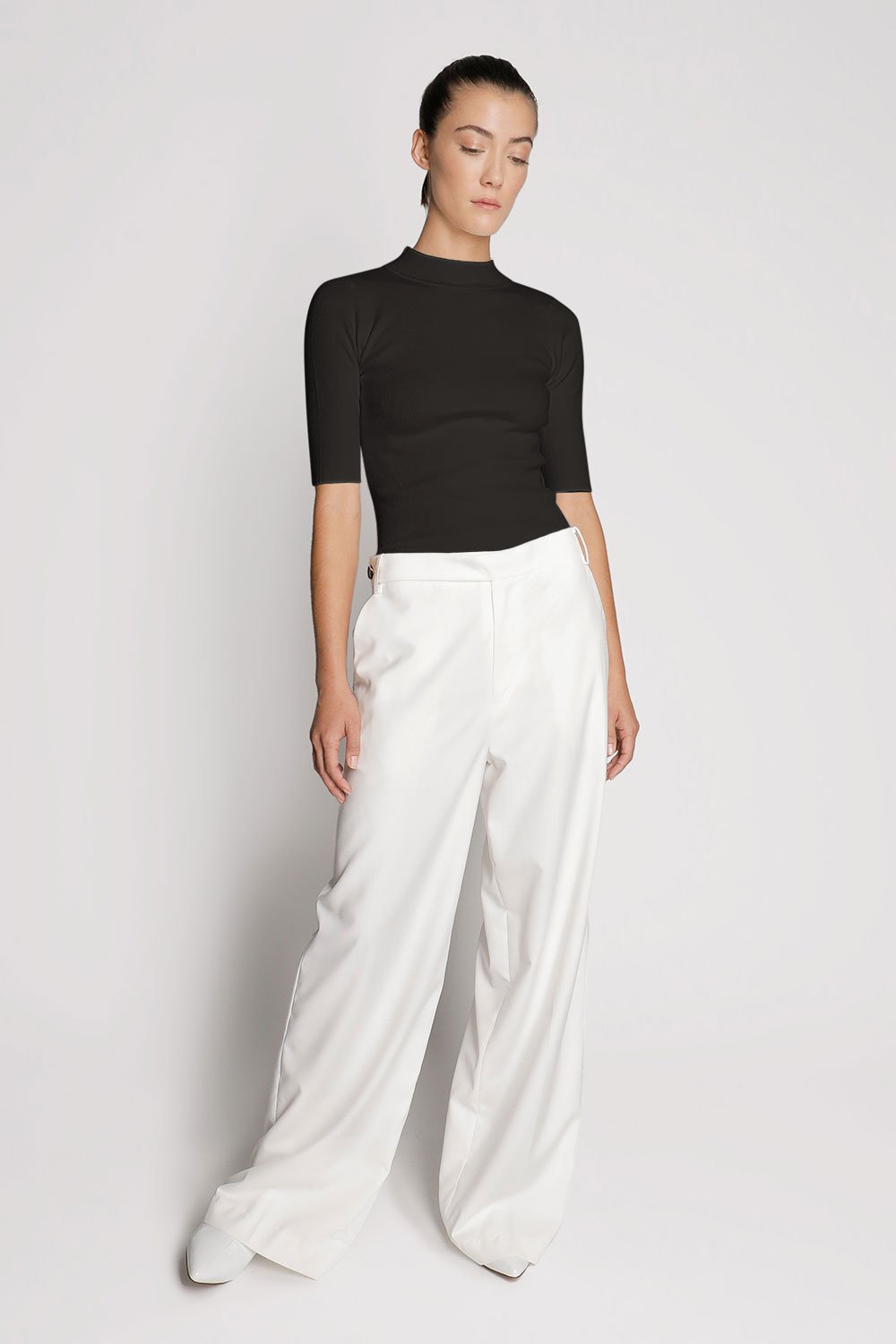 Half-sleeve knit shirt features high-neck in classic stretch-knit, soft cotton-viscose-spandex blend and fine ribbing throughout.