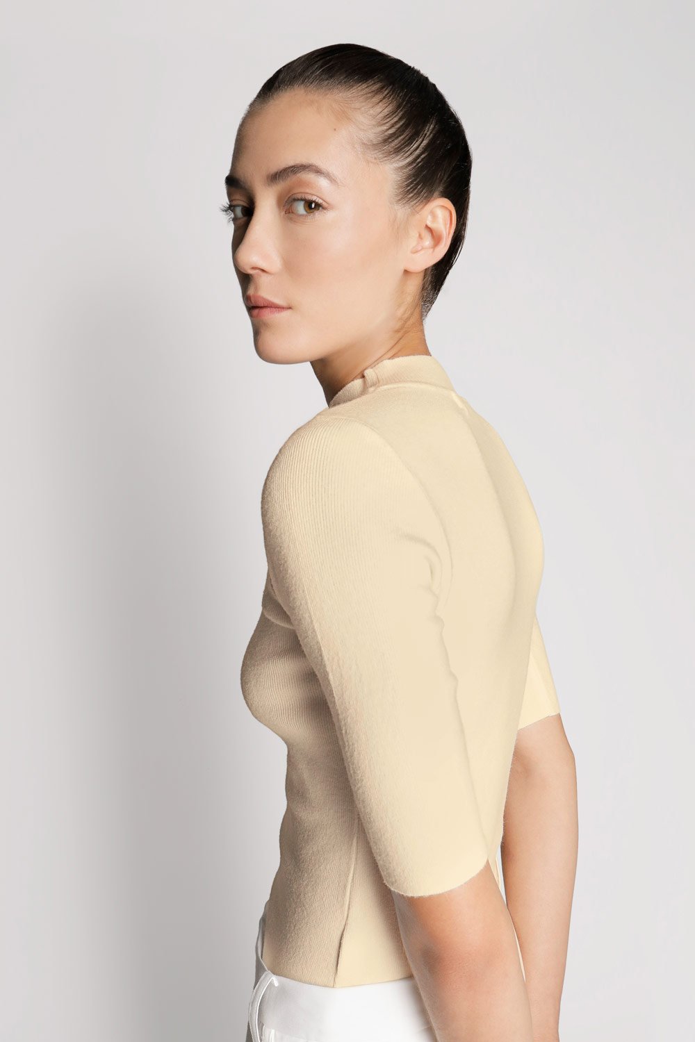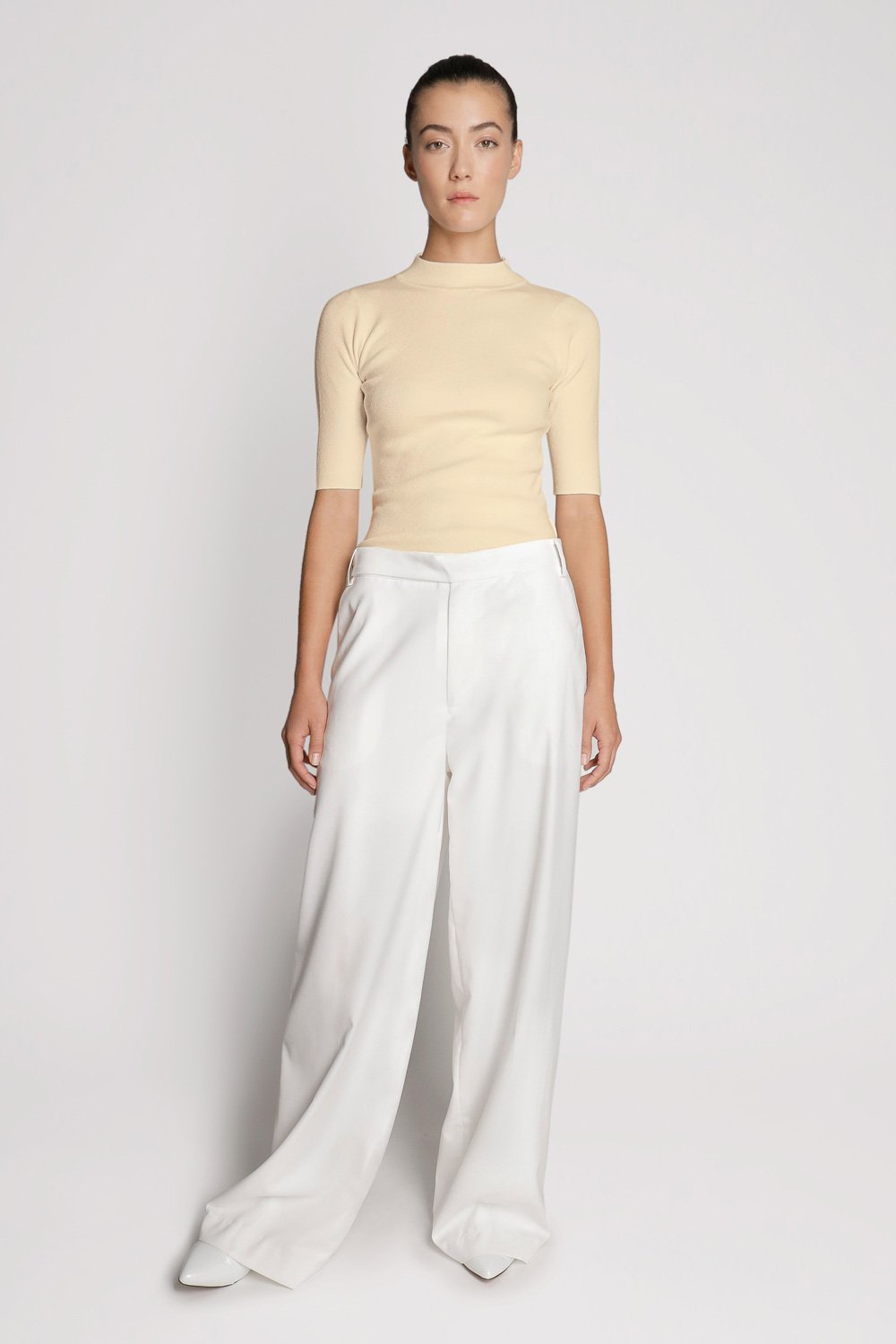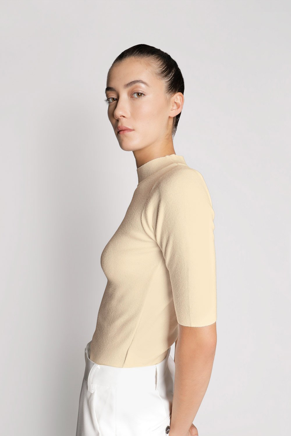 High neck short sleeve knit top in classic stretch-knit, soft cotton-viscose-spandex blend features high neck and fine ribbing throughout.