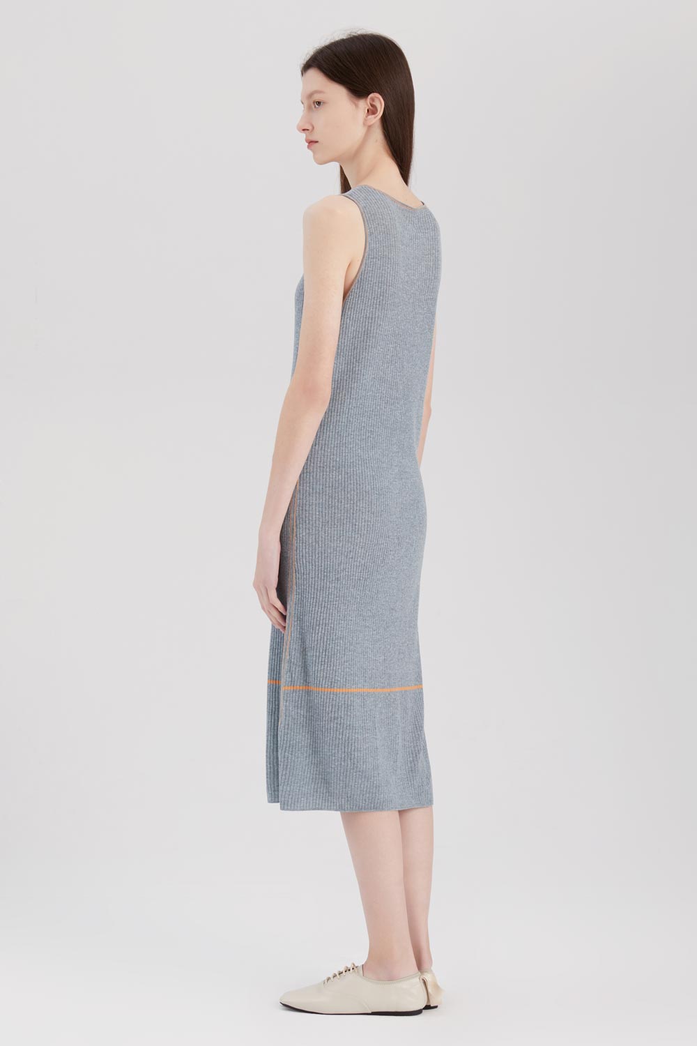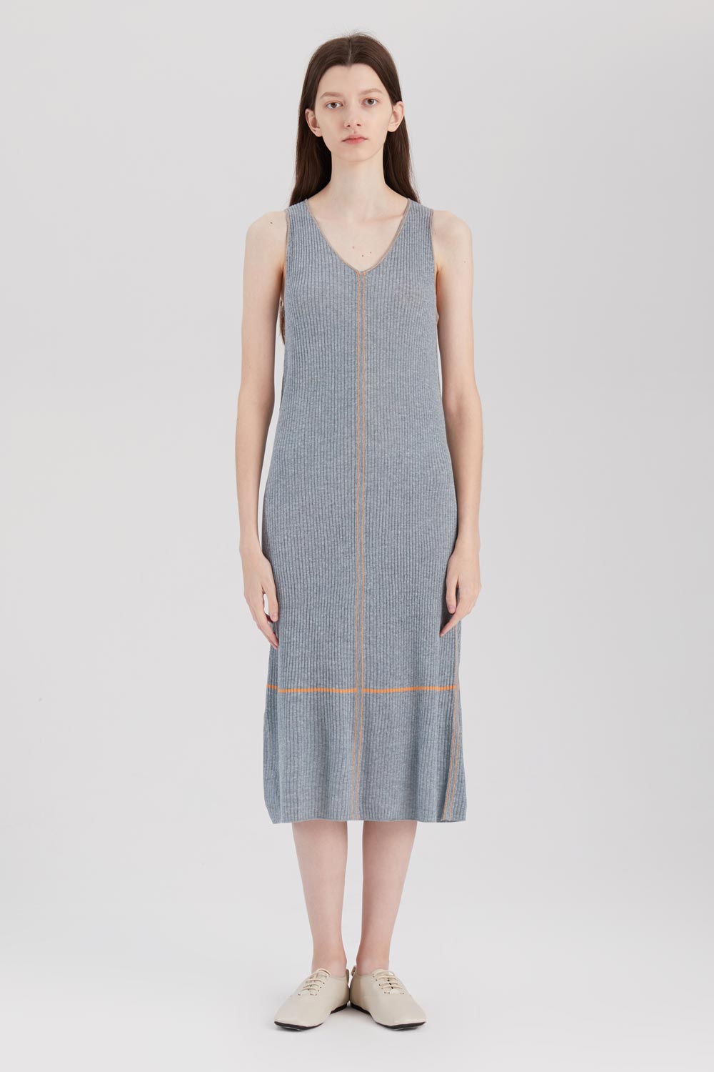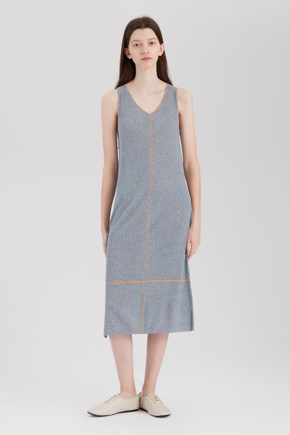 Insis Femme sleeveless stretch knit v-neck cotton and linen blend midi dress in smoky blue.