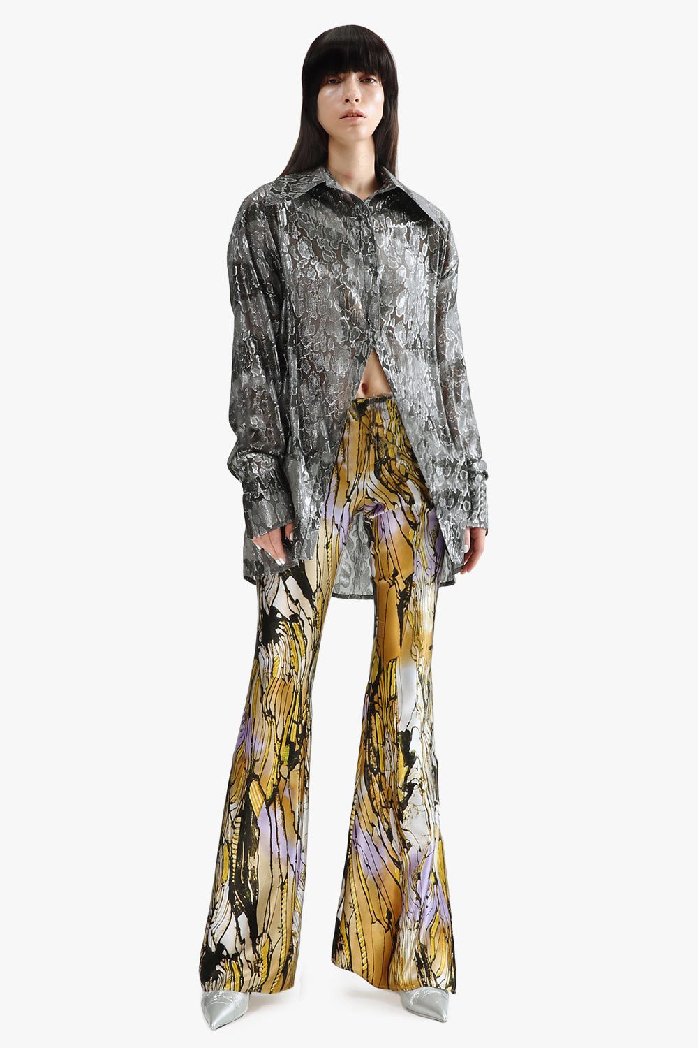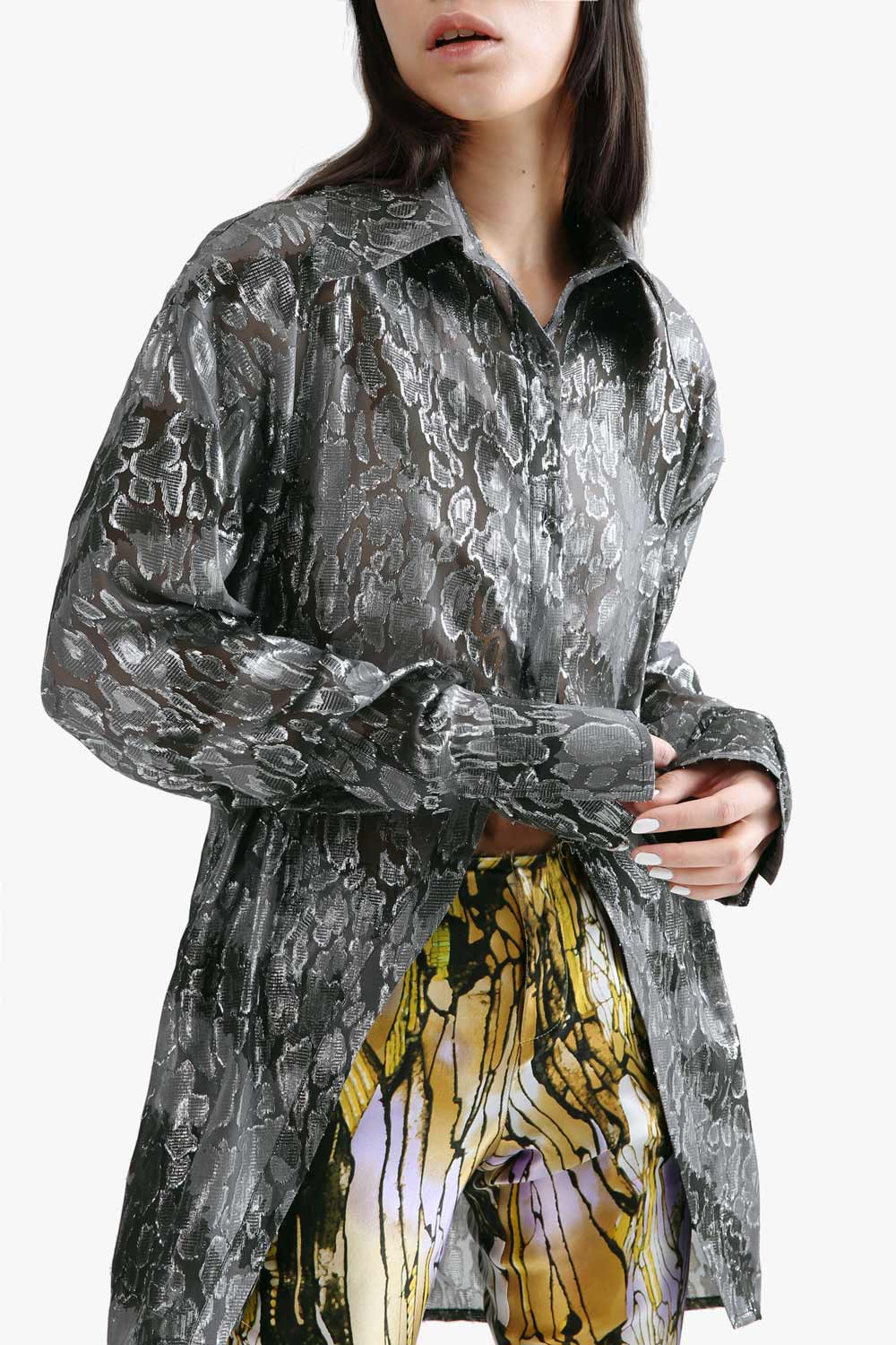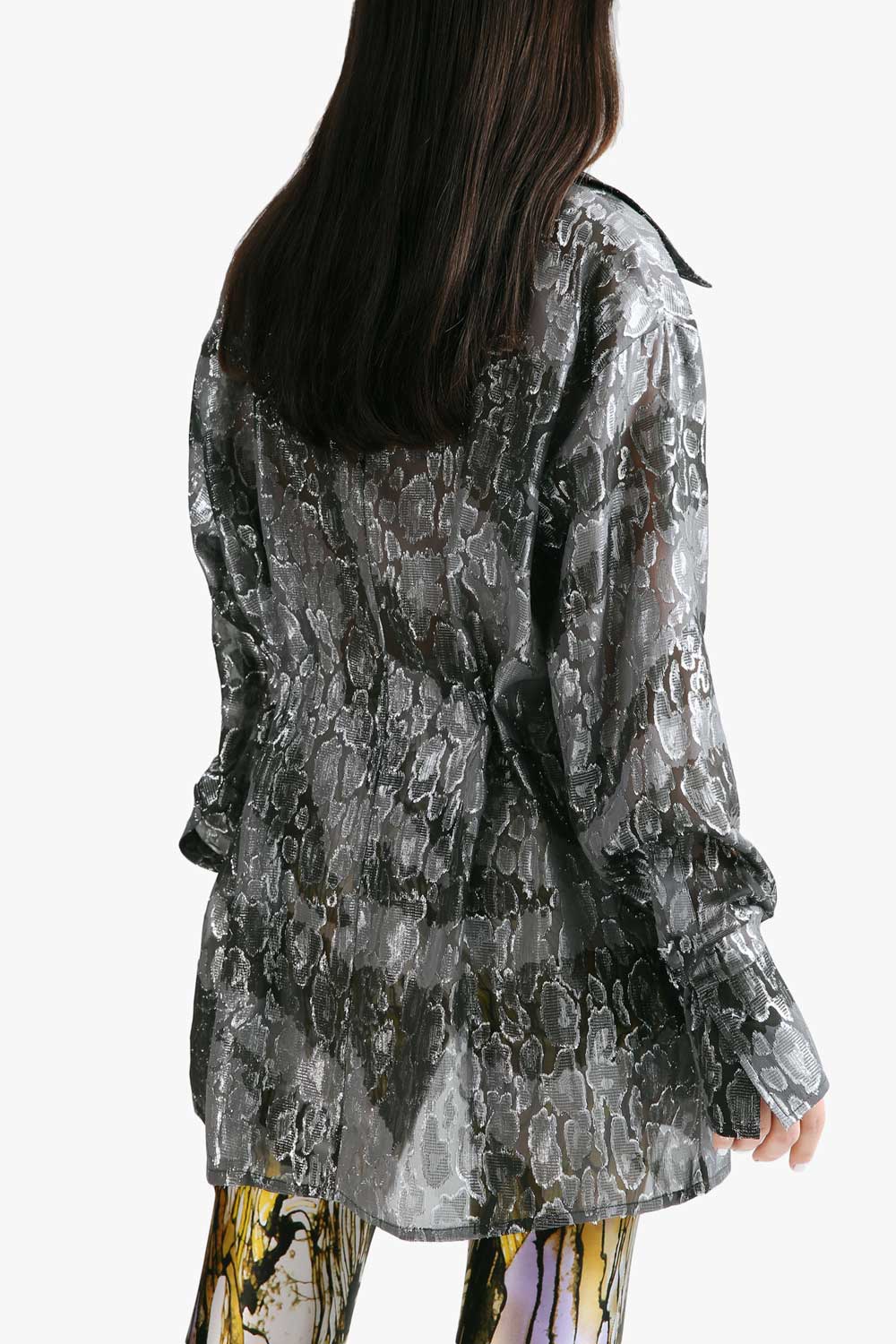 Lucency high-low leopard print sheer shirt in black silver.