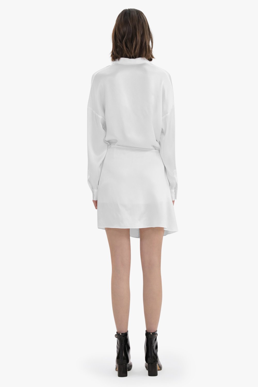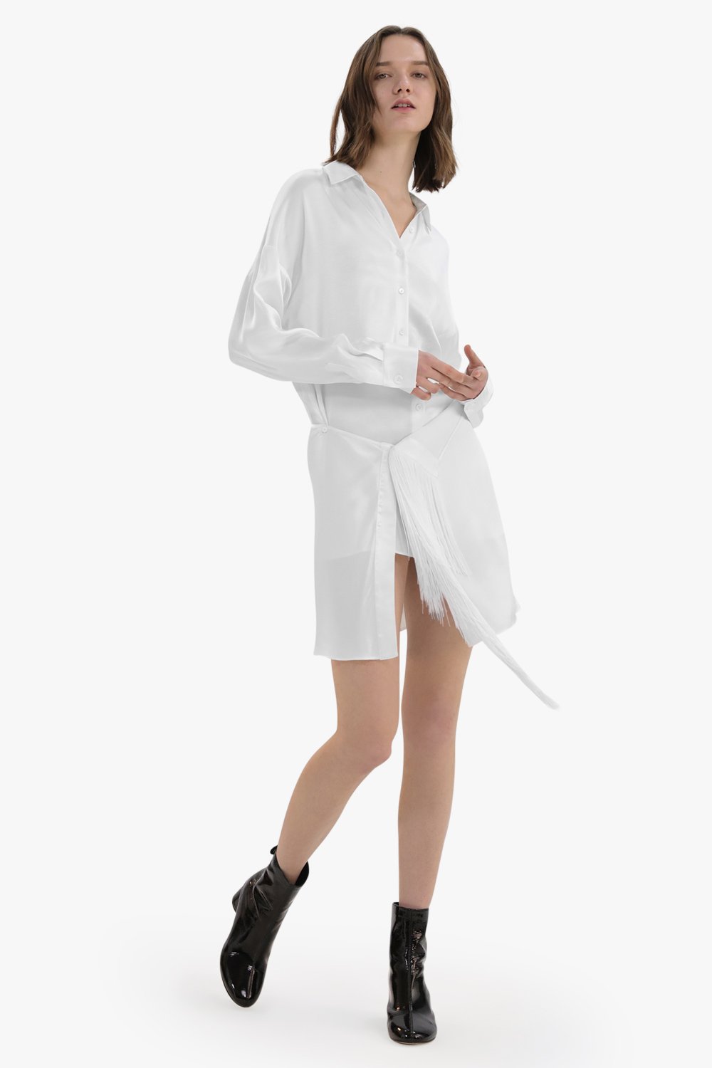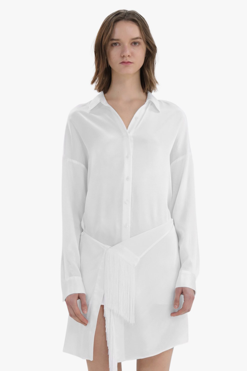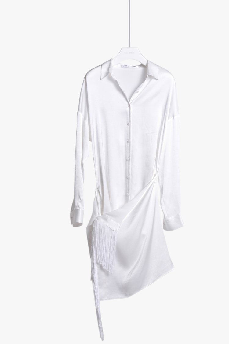 Yuel Xiang long button-down deconstructed shirt dress with tassel in white.