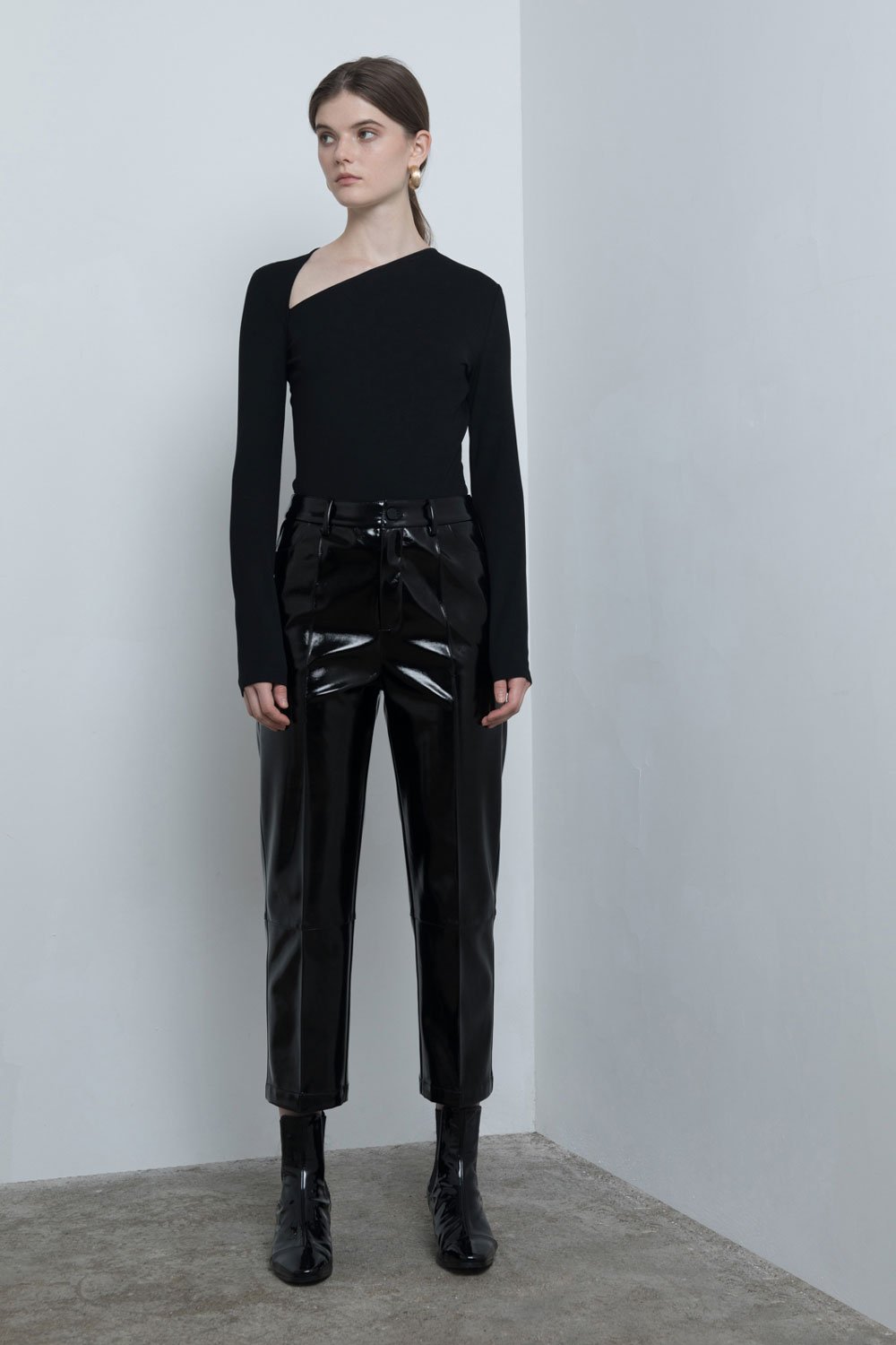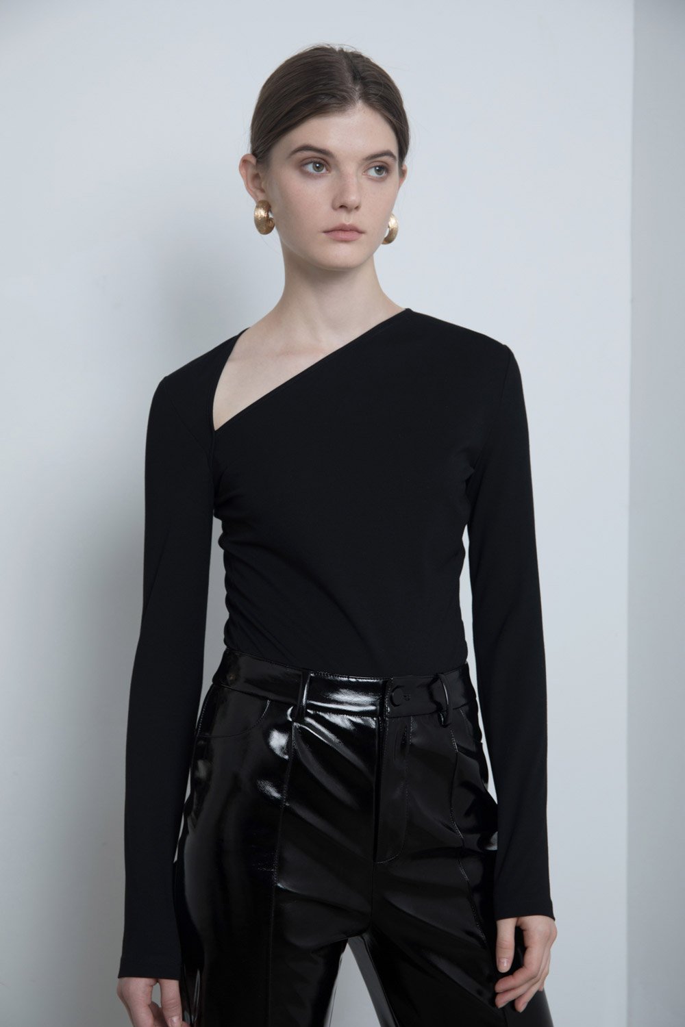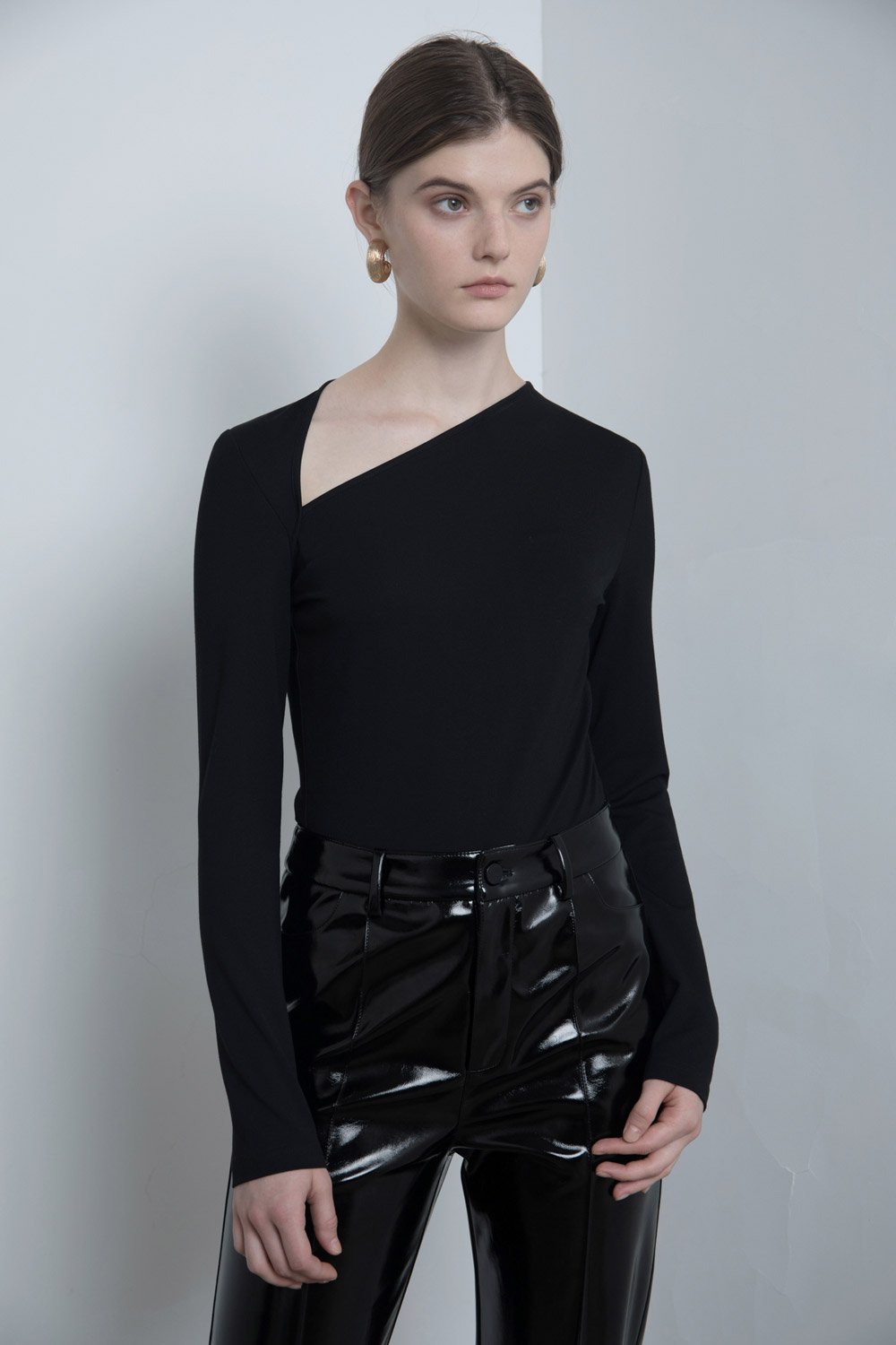 Yuel Xiang long sleeved cut-out shoulder v-neck stretch knit bodysuit in black.