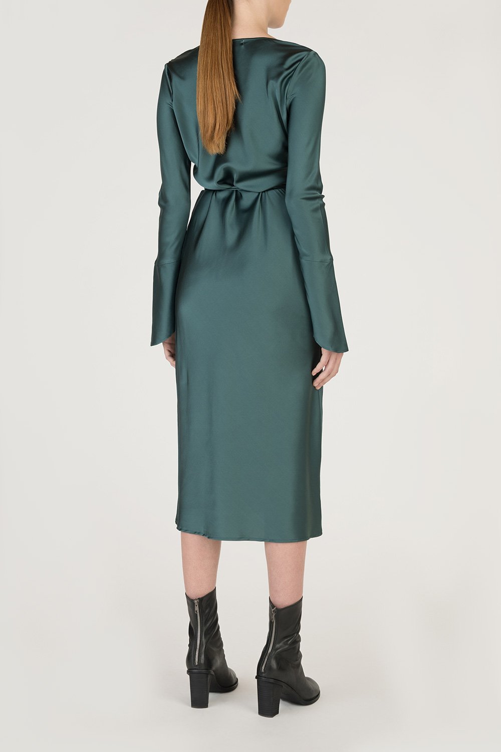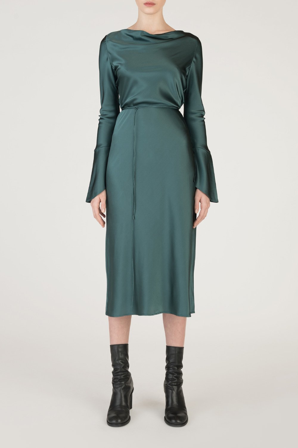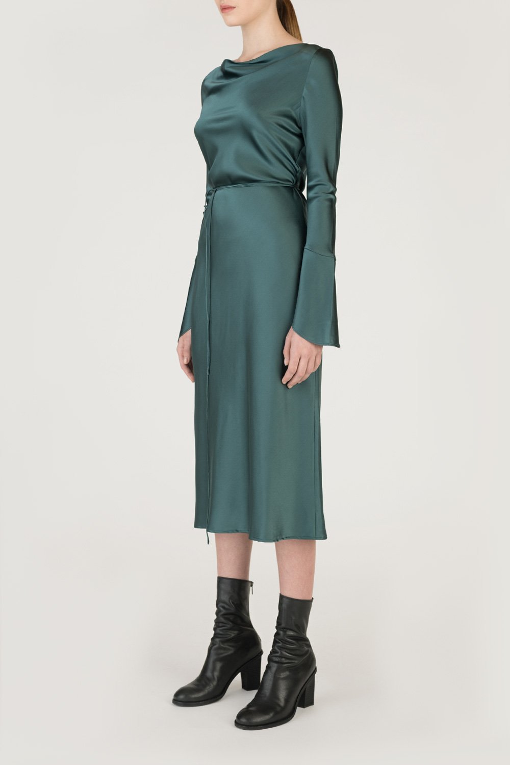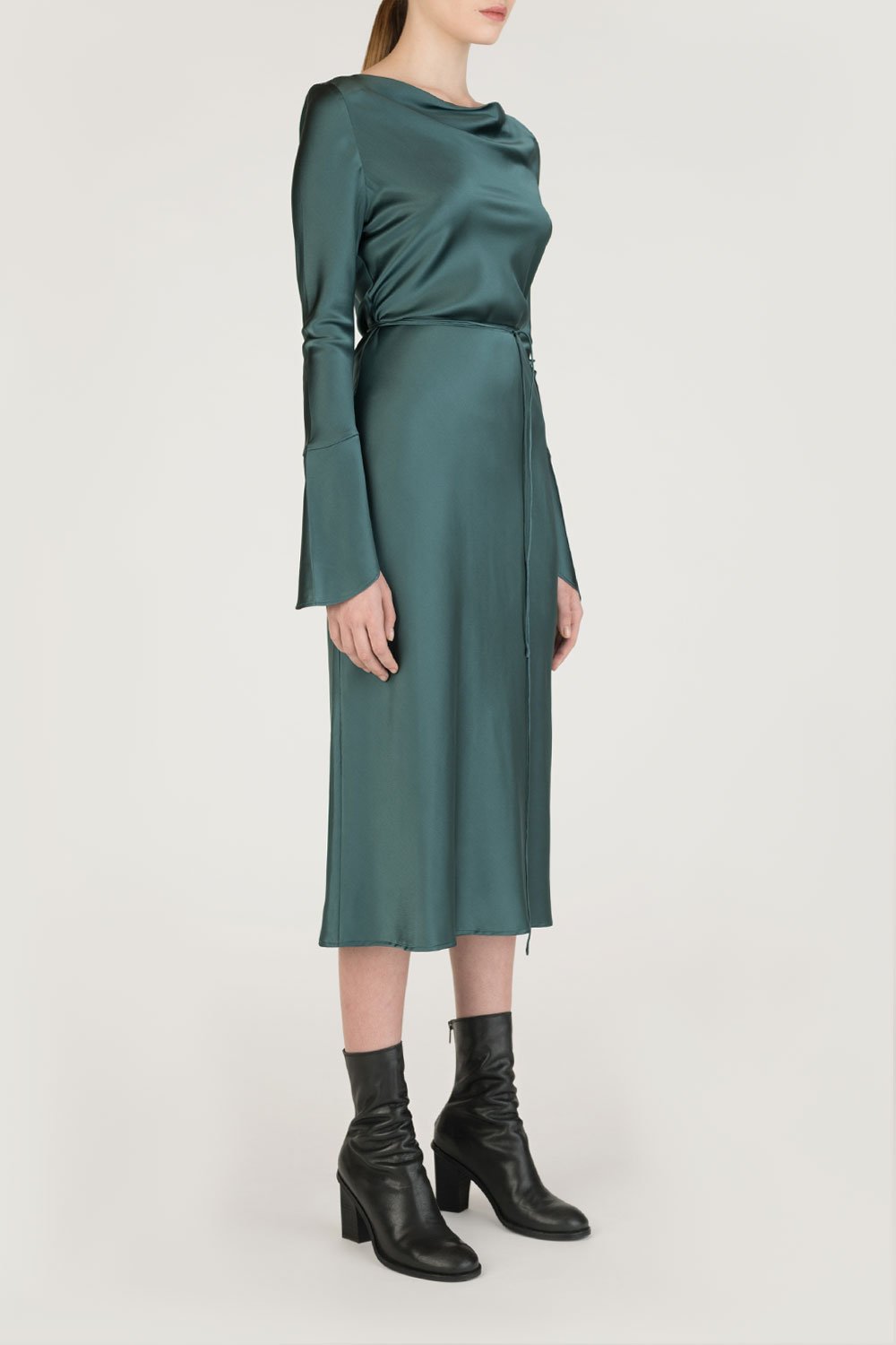 Long-sleeved midi dress in 100% pure silk, features a draped boat-neck collar line, bell-shaped sleeves with high slits, and an added long string waist belt.