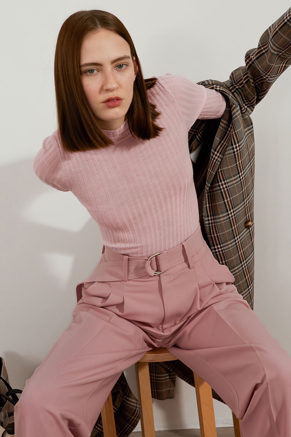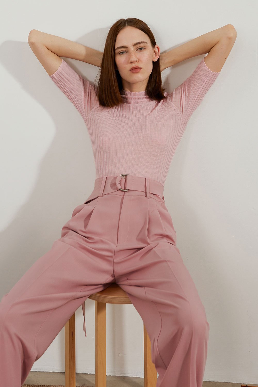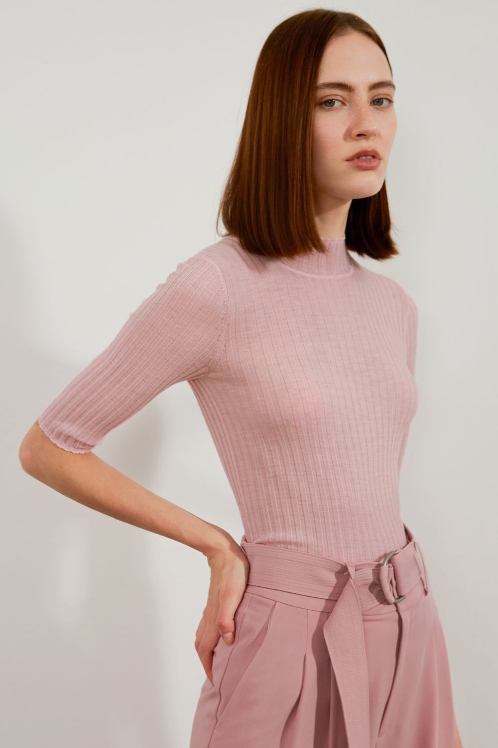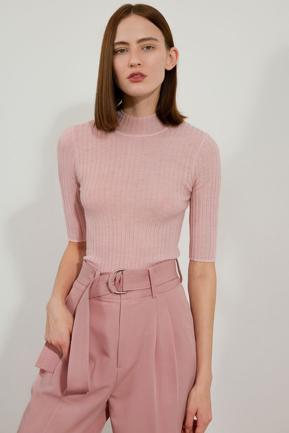 RLL Studio high-collar merino wool half-sleeve knit shirt in light pink.