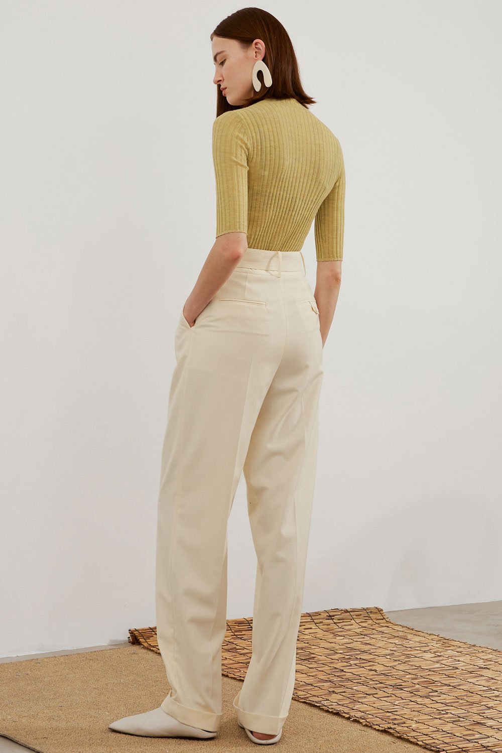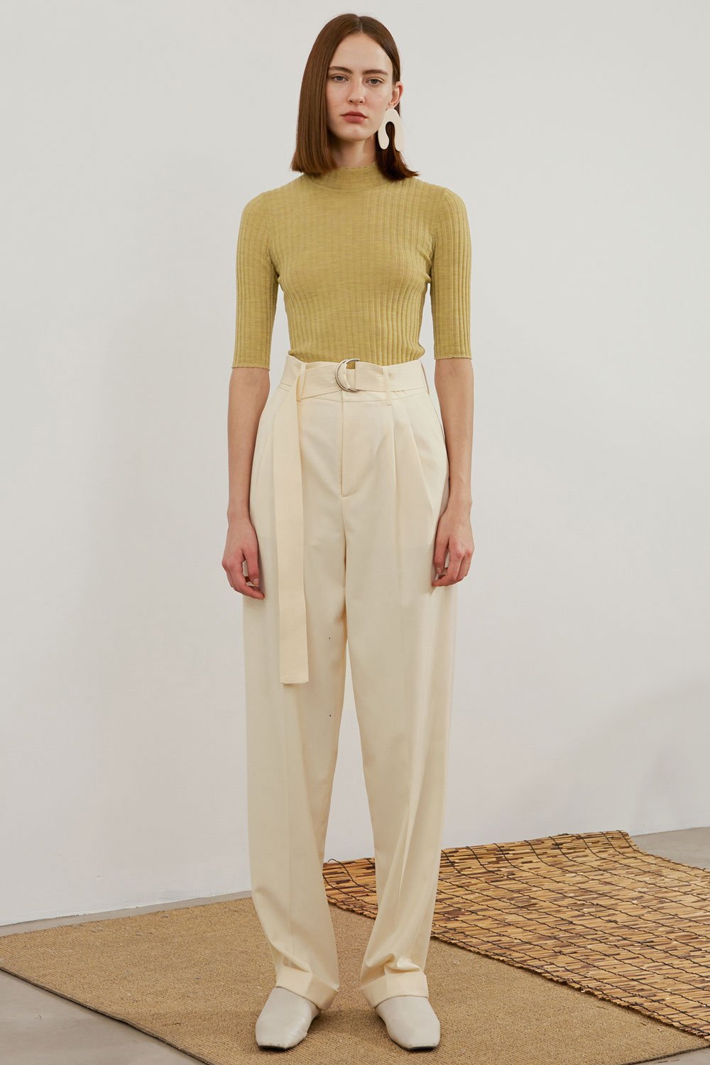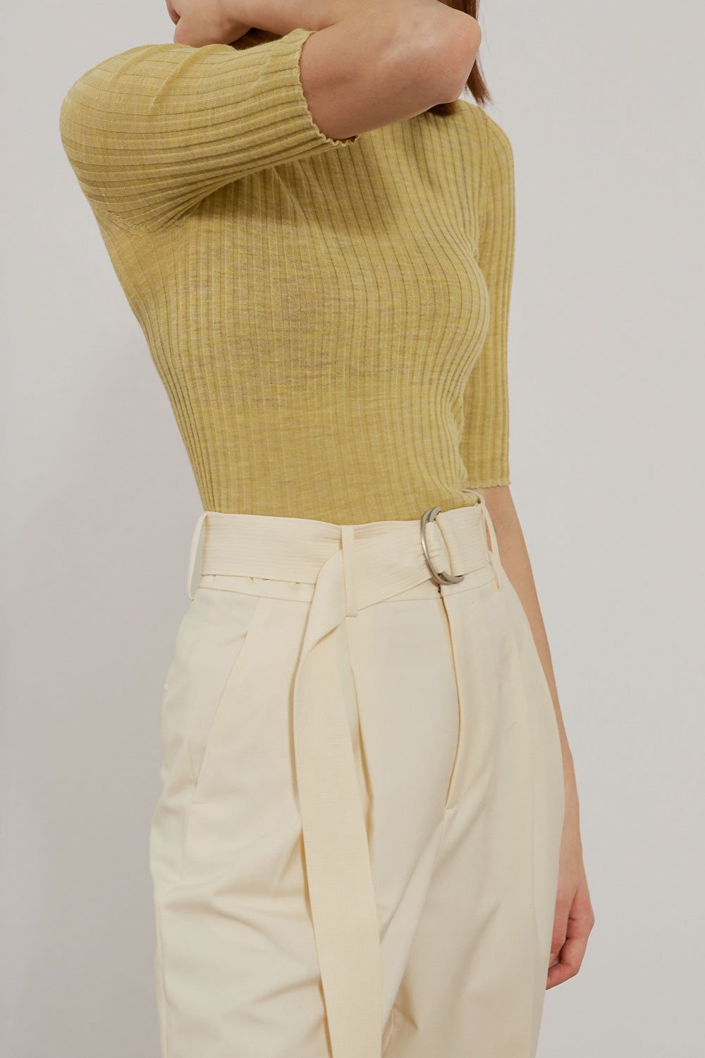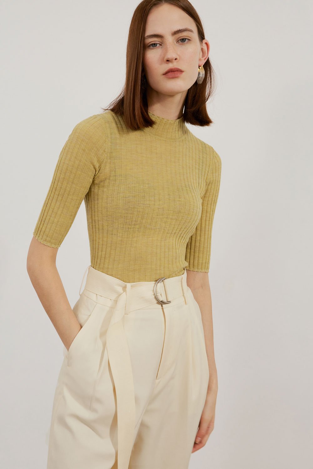 RLL Studio high-collar merino wool half-sleeve knit shirt in mustard yellow.
