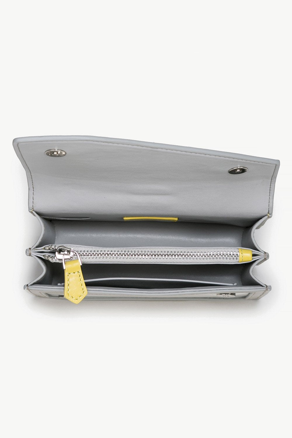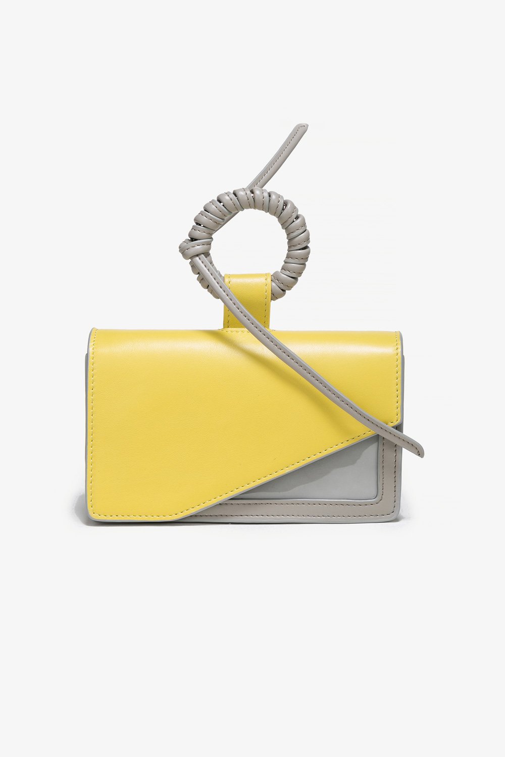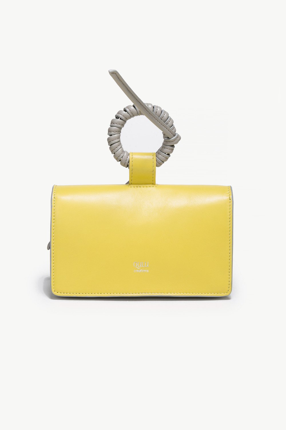 Qulu mini leather bag with top handle in yellow with detachable chain and leather shoulder strap.