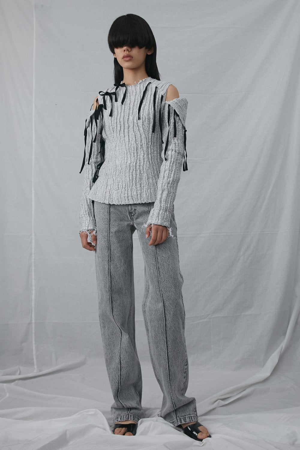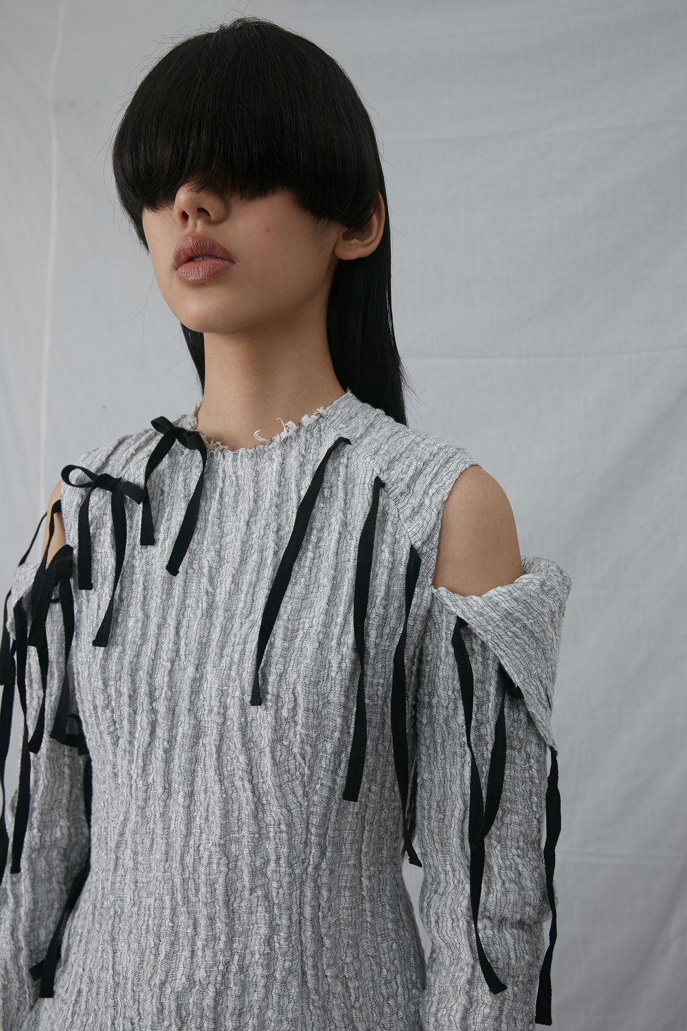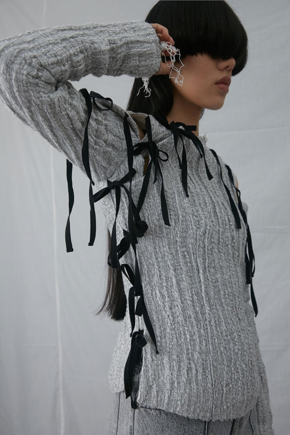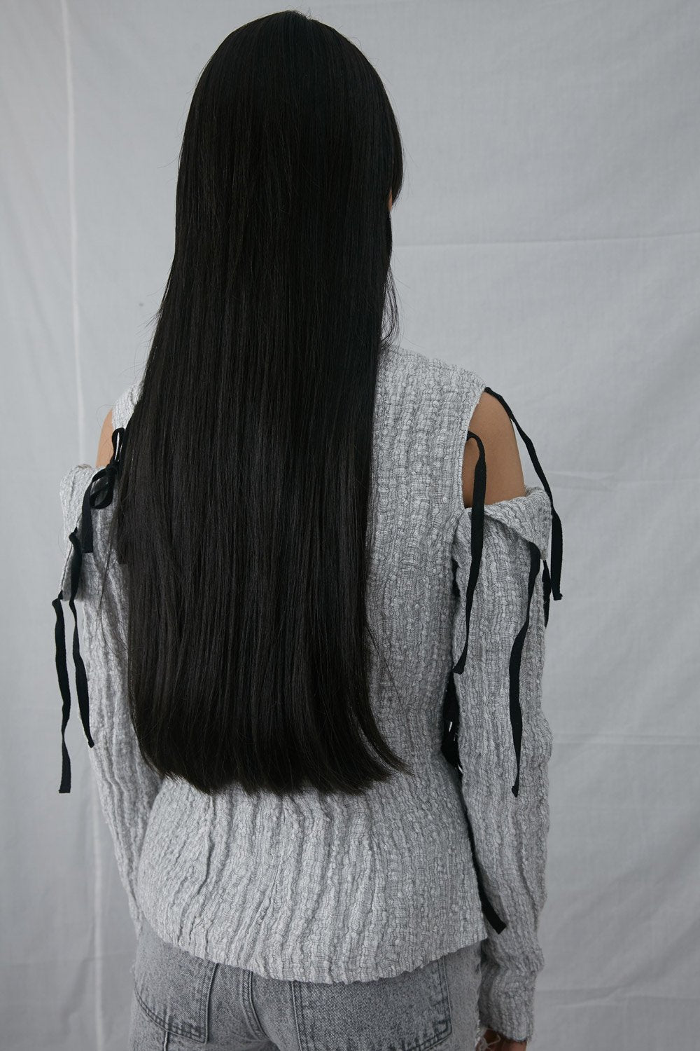 Trinite woven linen off-shoulder laced up shirt in gray.