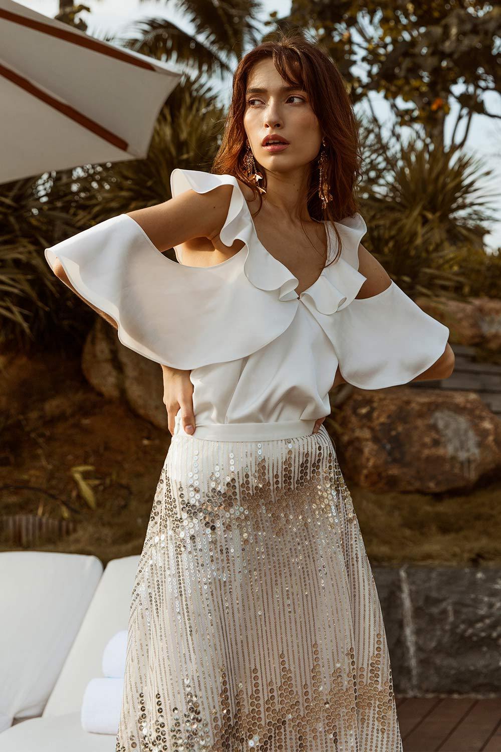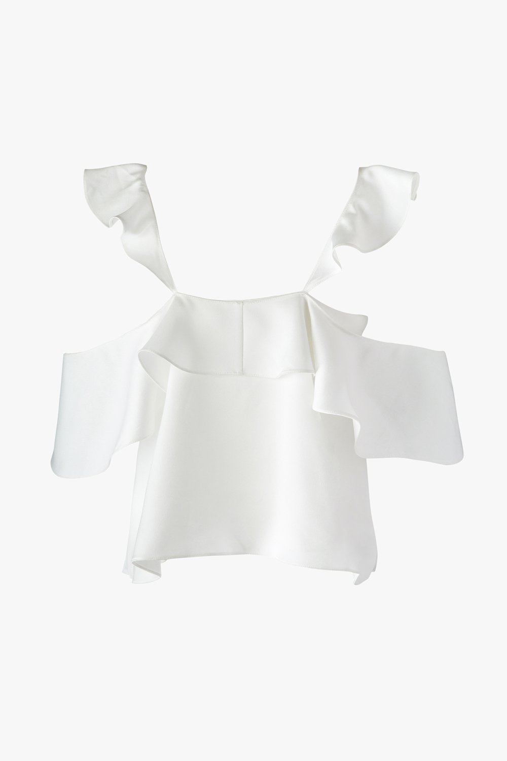 Luvon layered v-neck off-shoulder ruffled crop top in white.