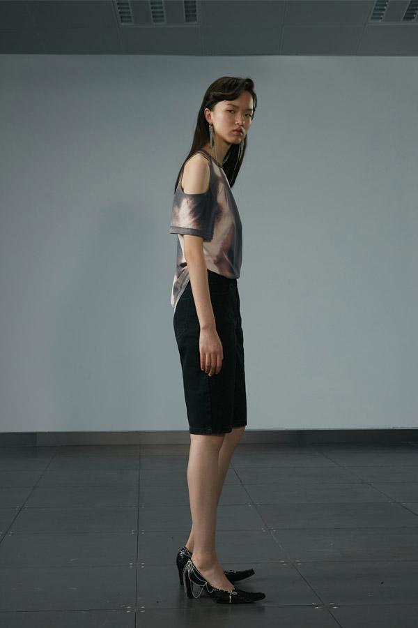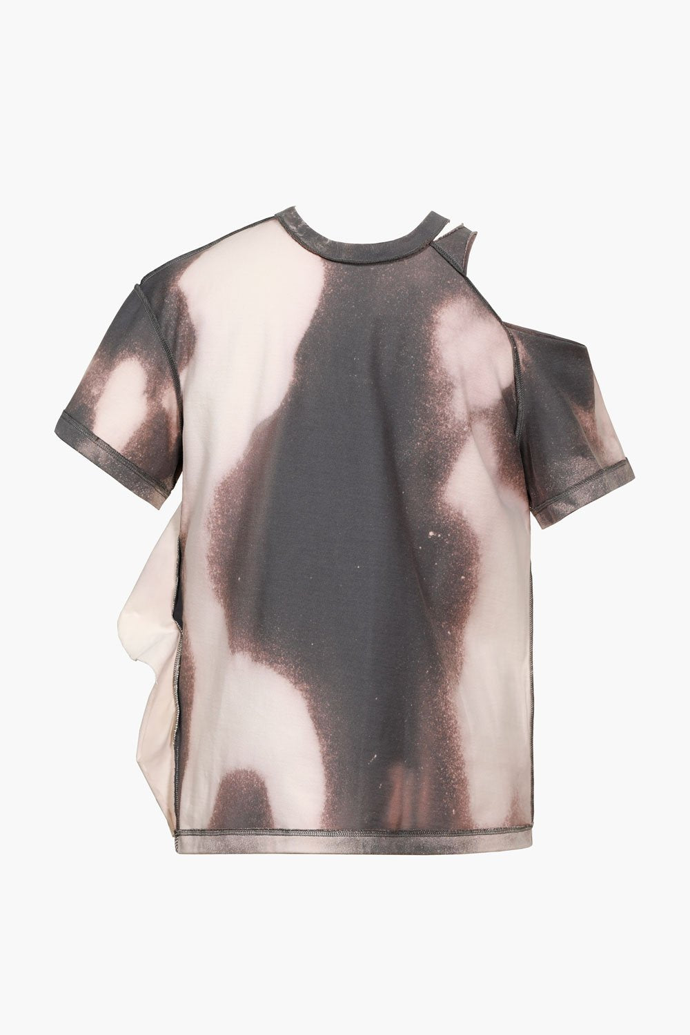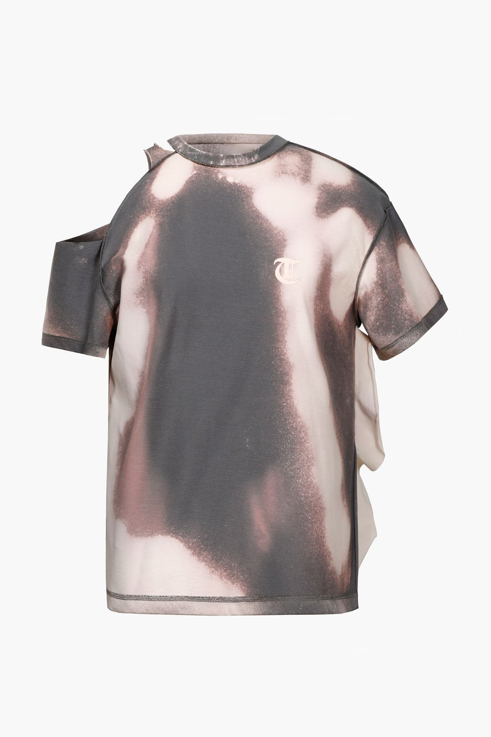 Trinite tie-dye off-shoulder side slit short-sleeved t-shirt in powder.