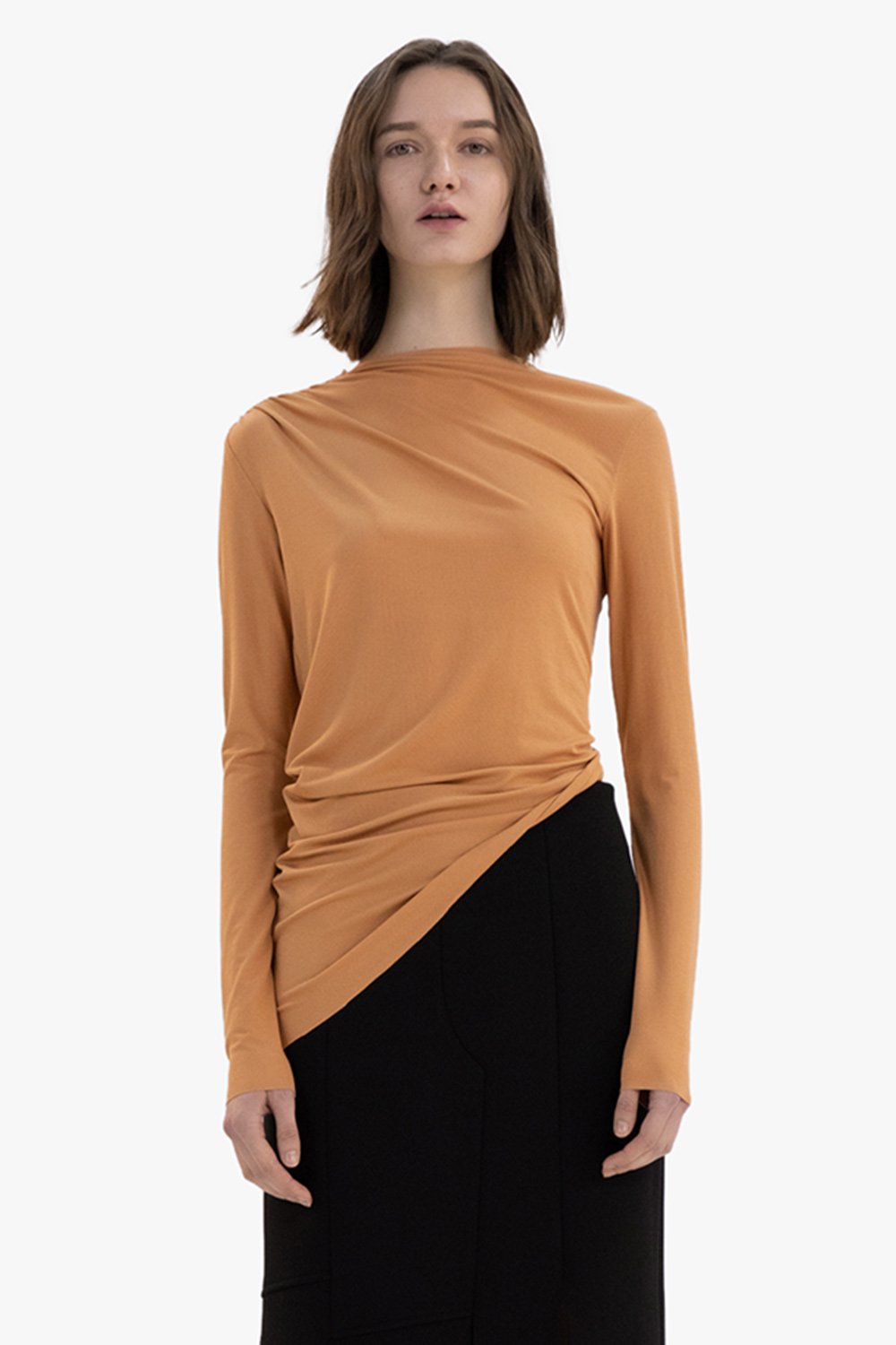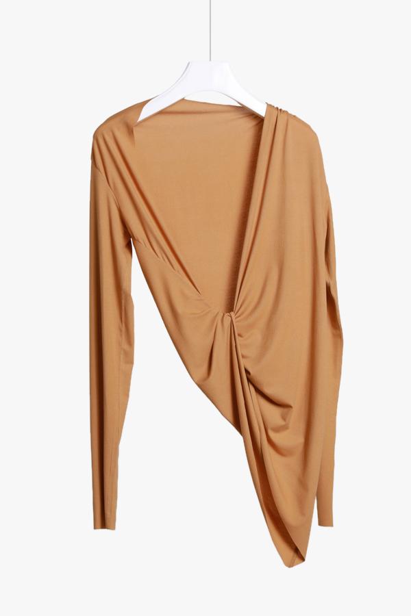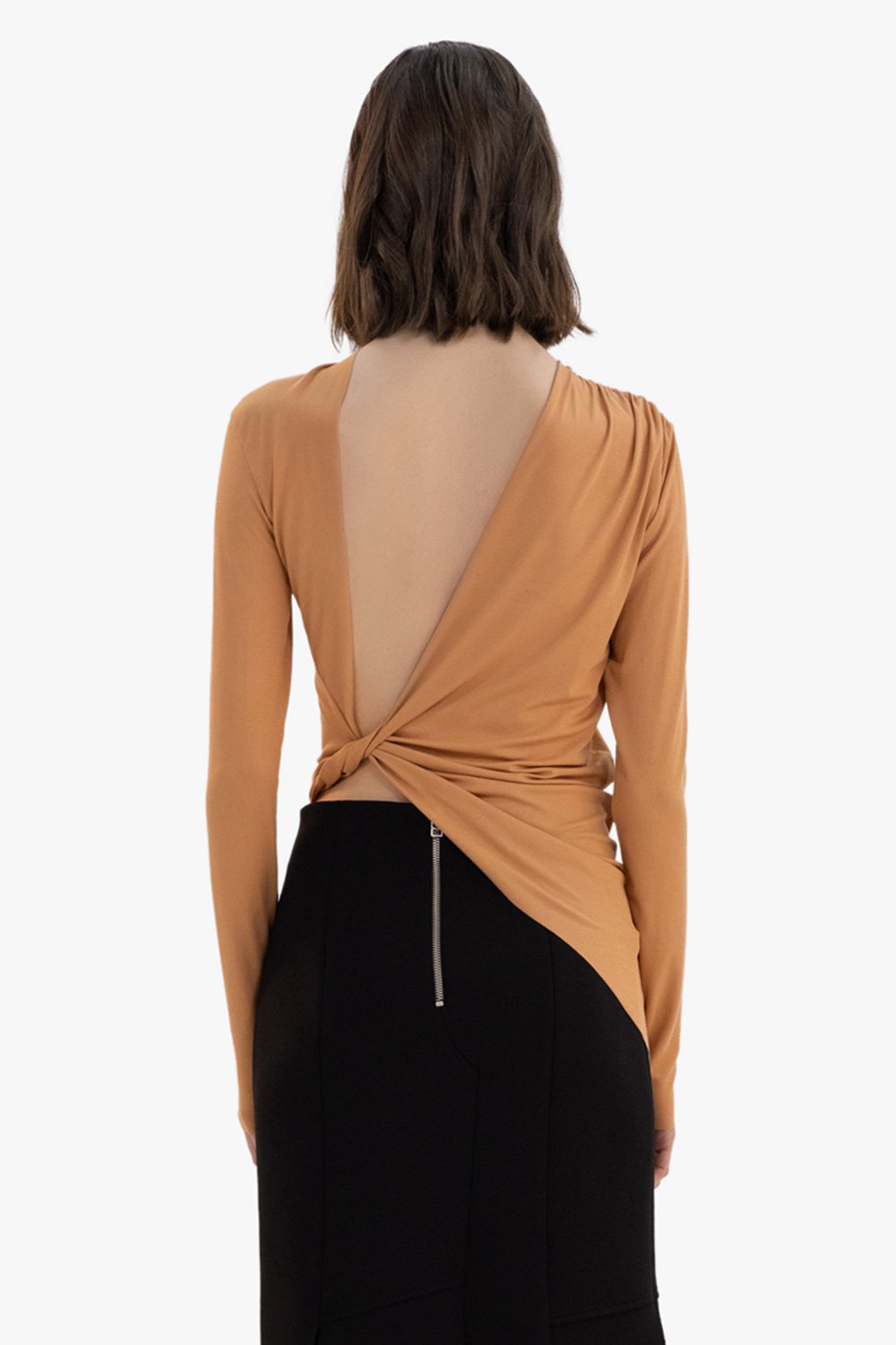 Yuel Xiang open back pleated knot stretch knit long sleeve shirt in cider.