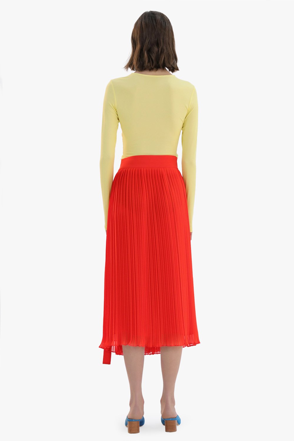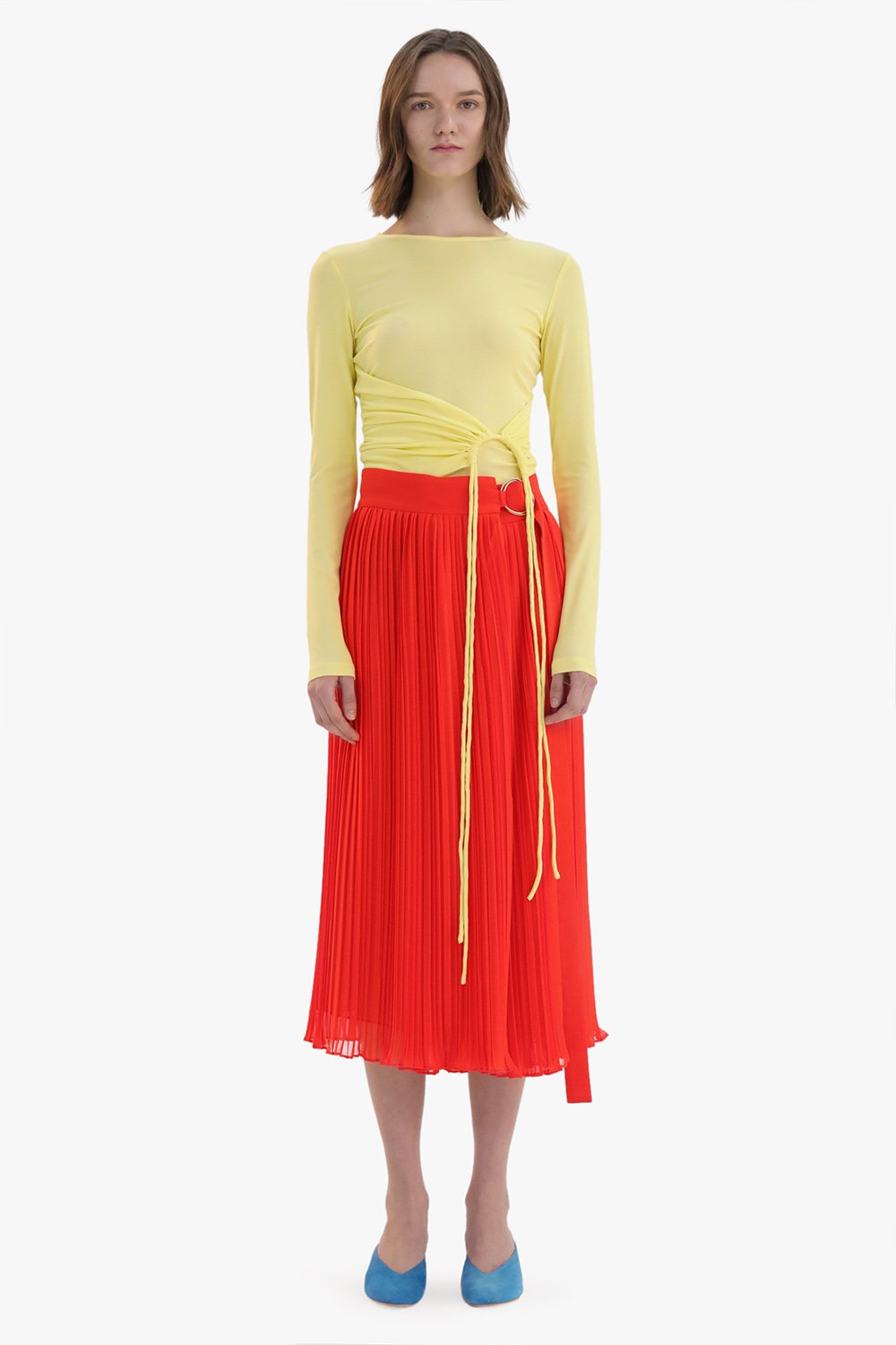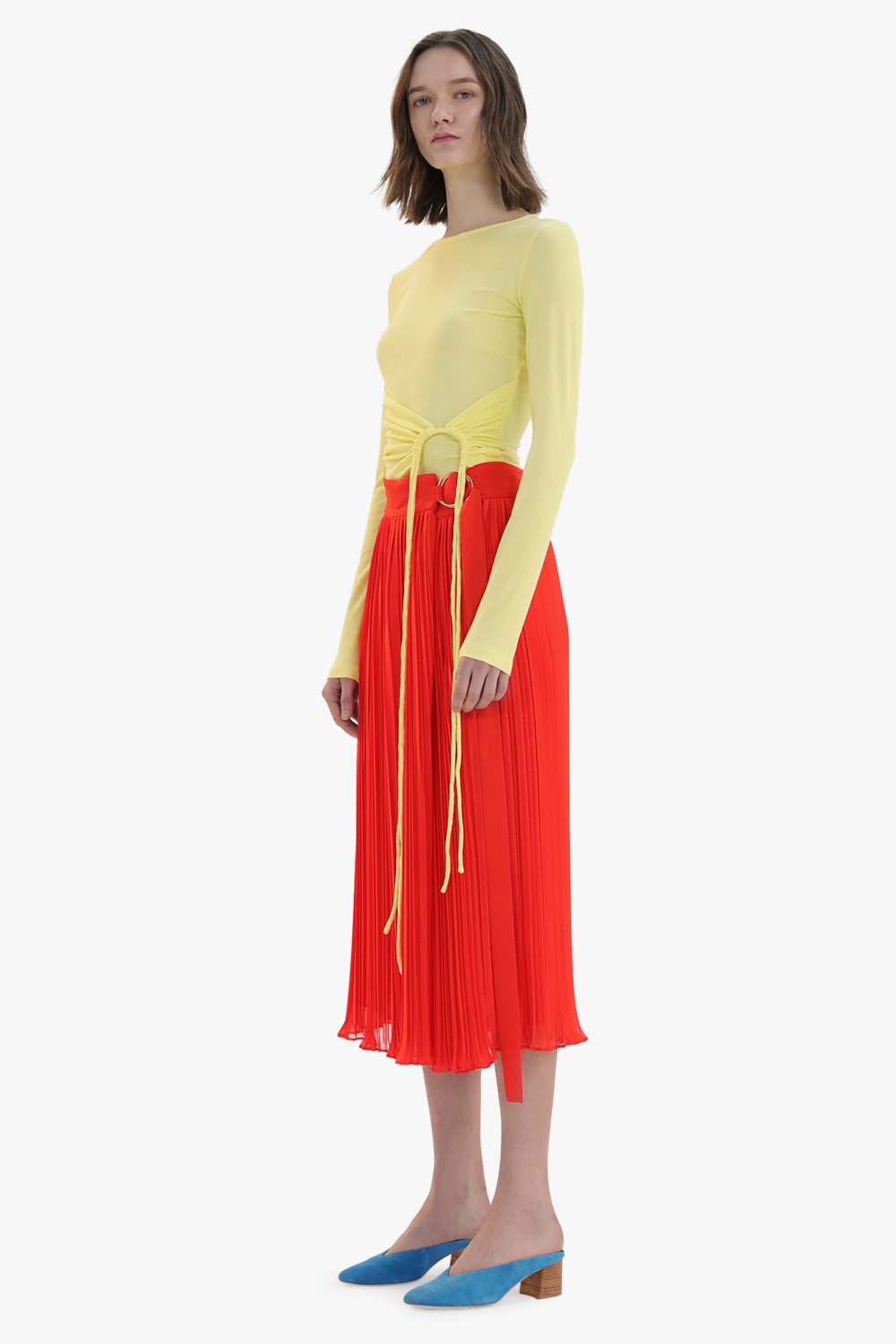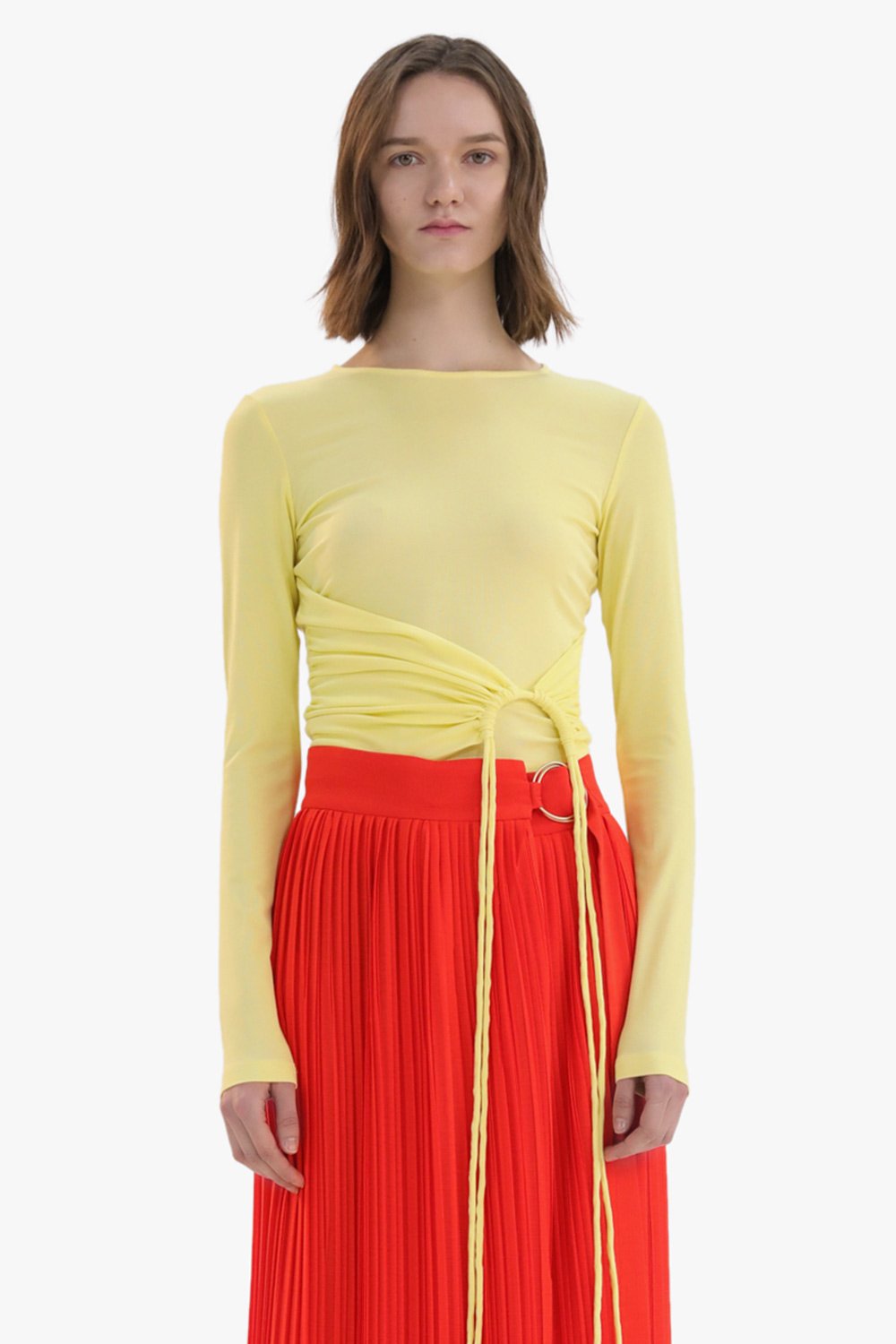 Yuel Xiang crew neck long sleeved pleated stretch knit crop shirt in yellow.