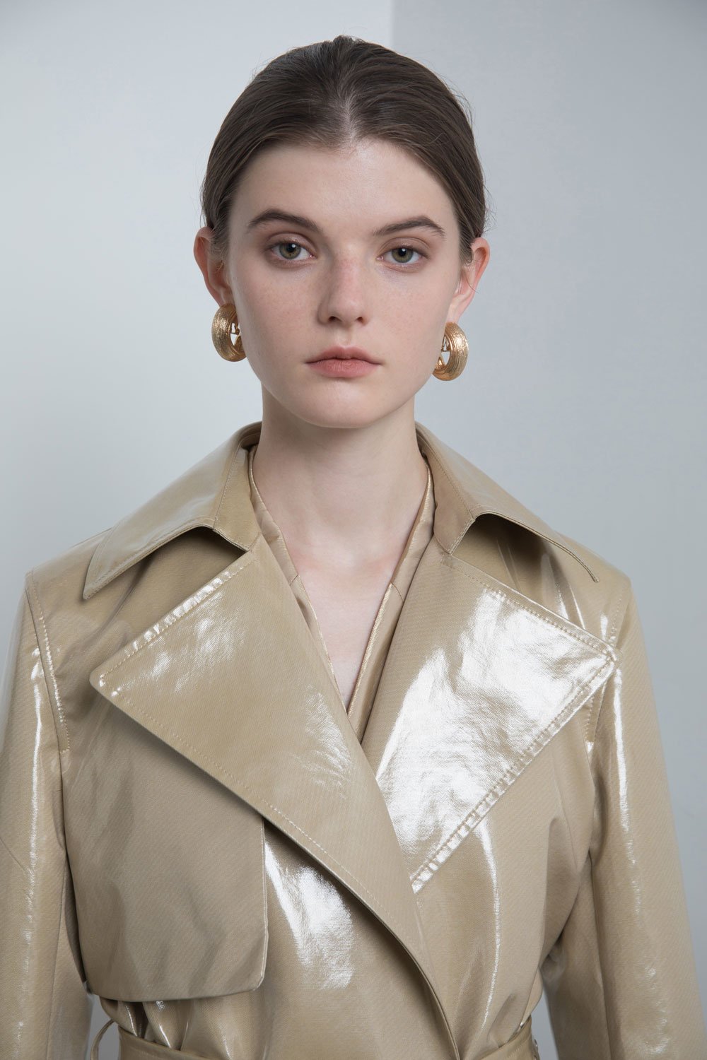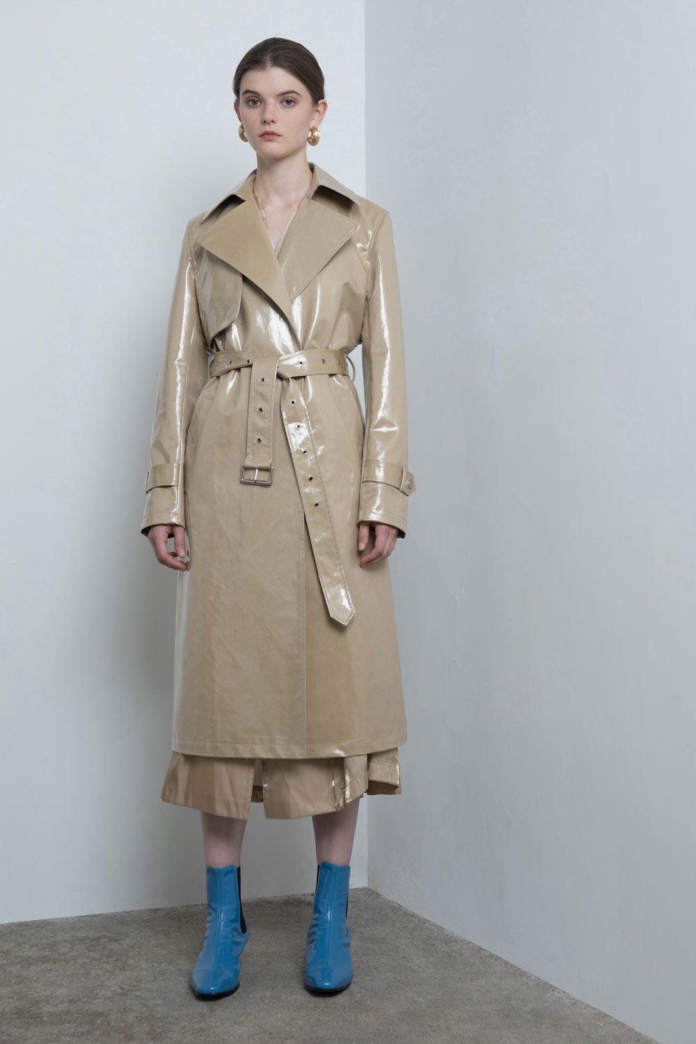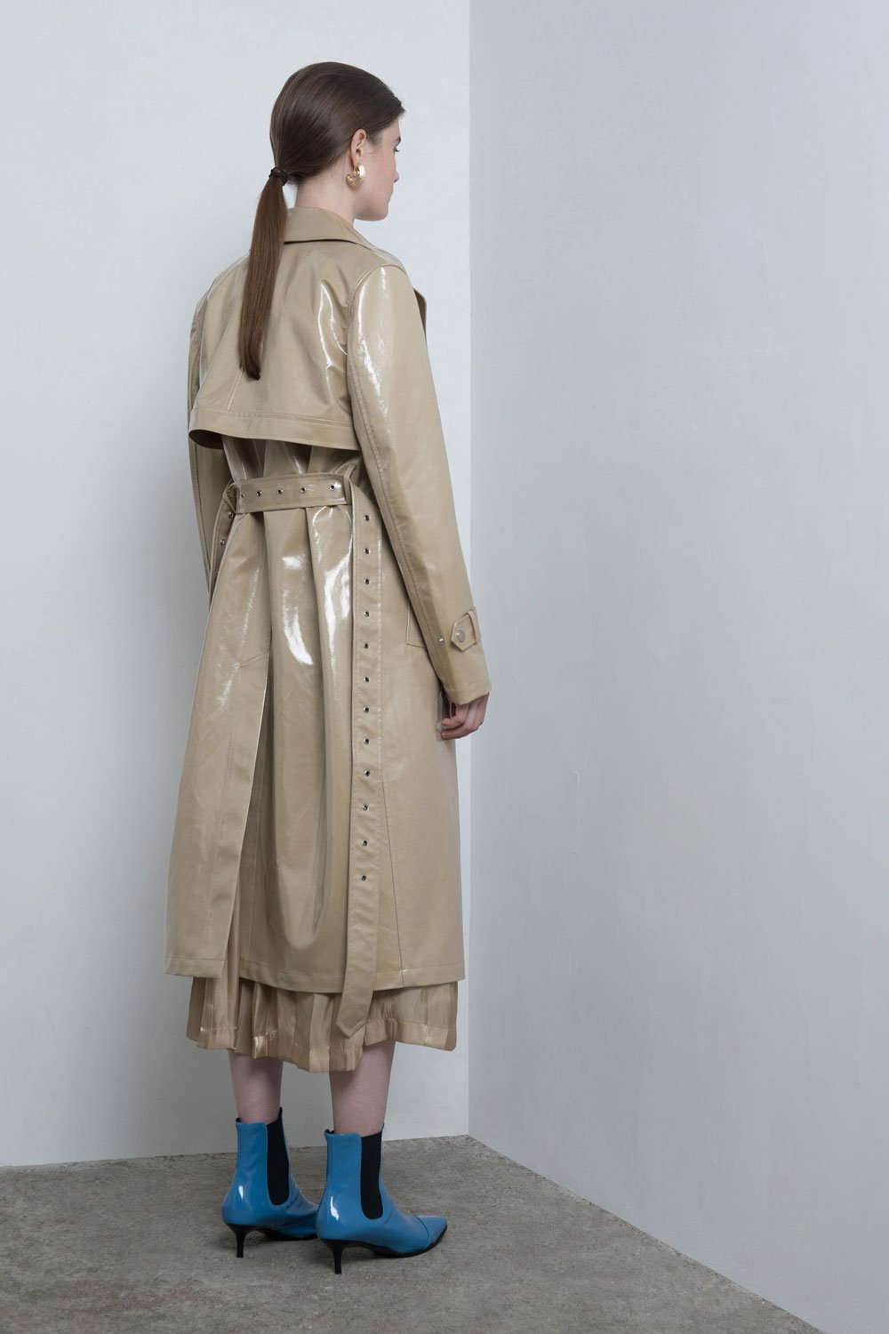 Yuel Xiang PVC trench coat in khaki features side pockets, back slit, buckle waist belt, and adjustable tic-tac cuffs.