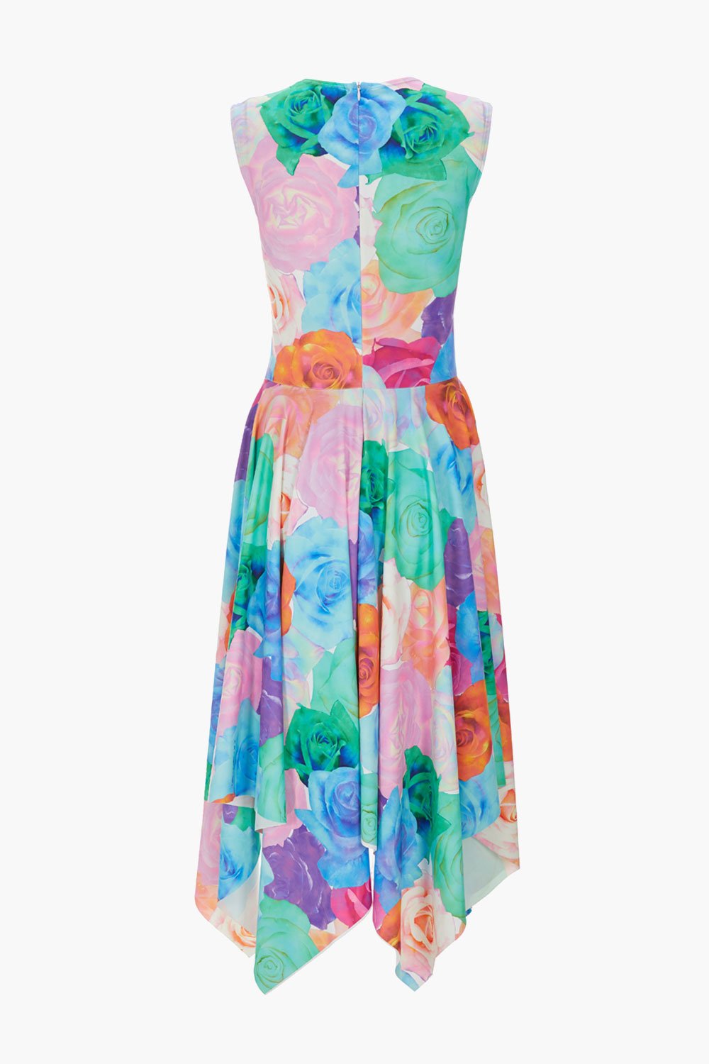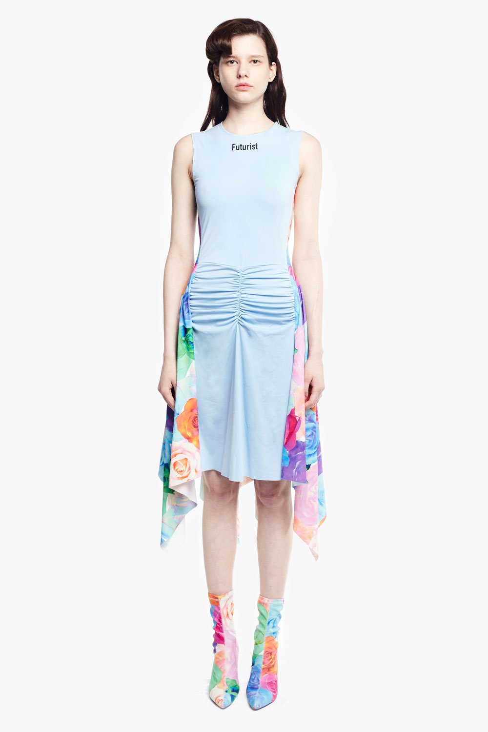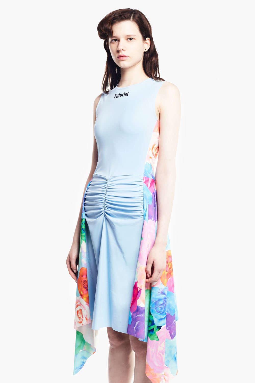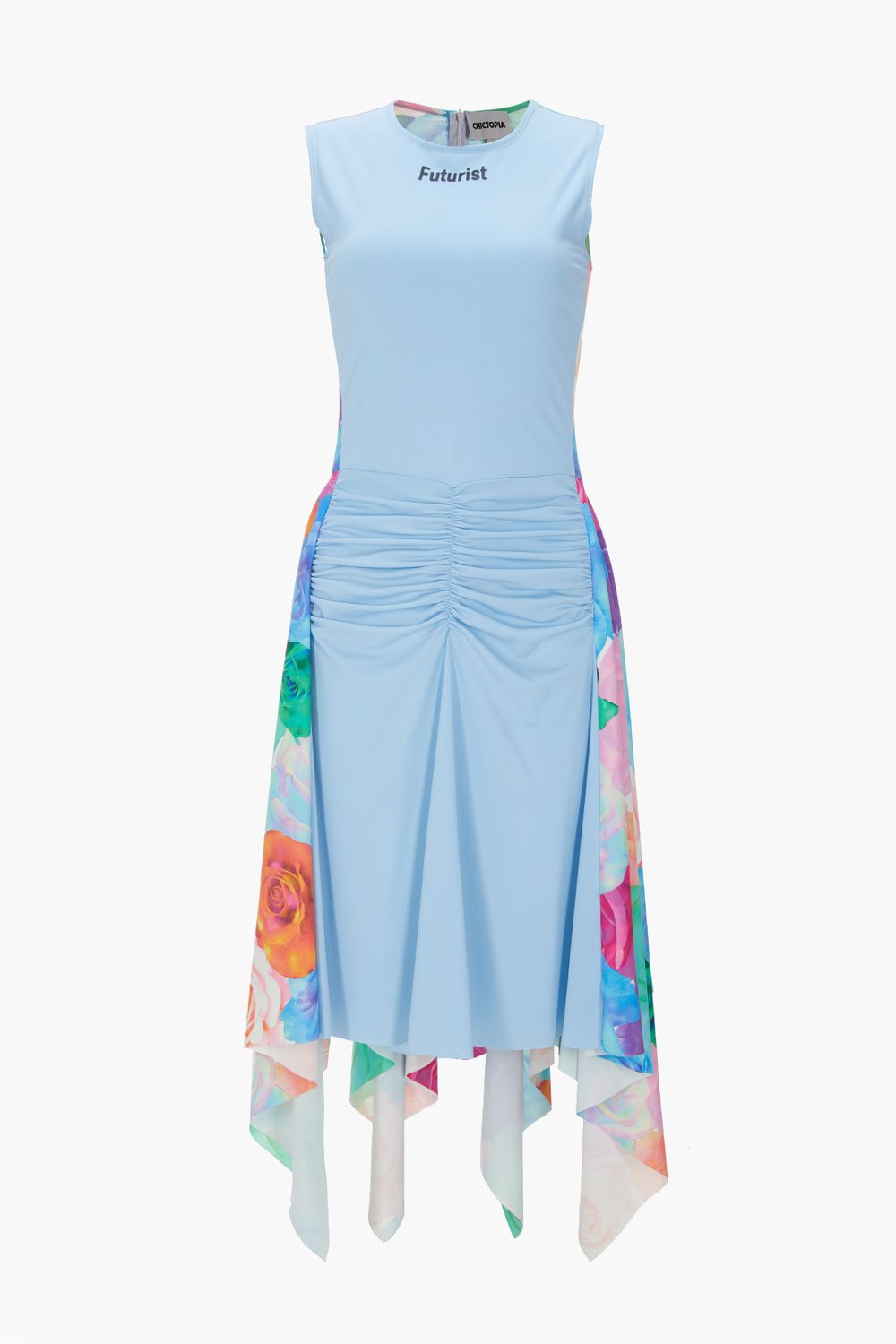 Chictopia rose print stretch knit cinched waist and side and back ruffles dress in blue.