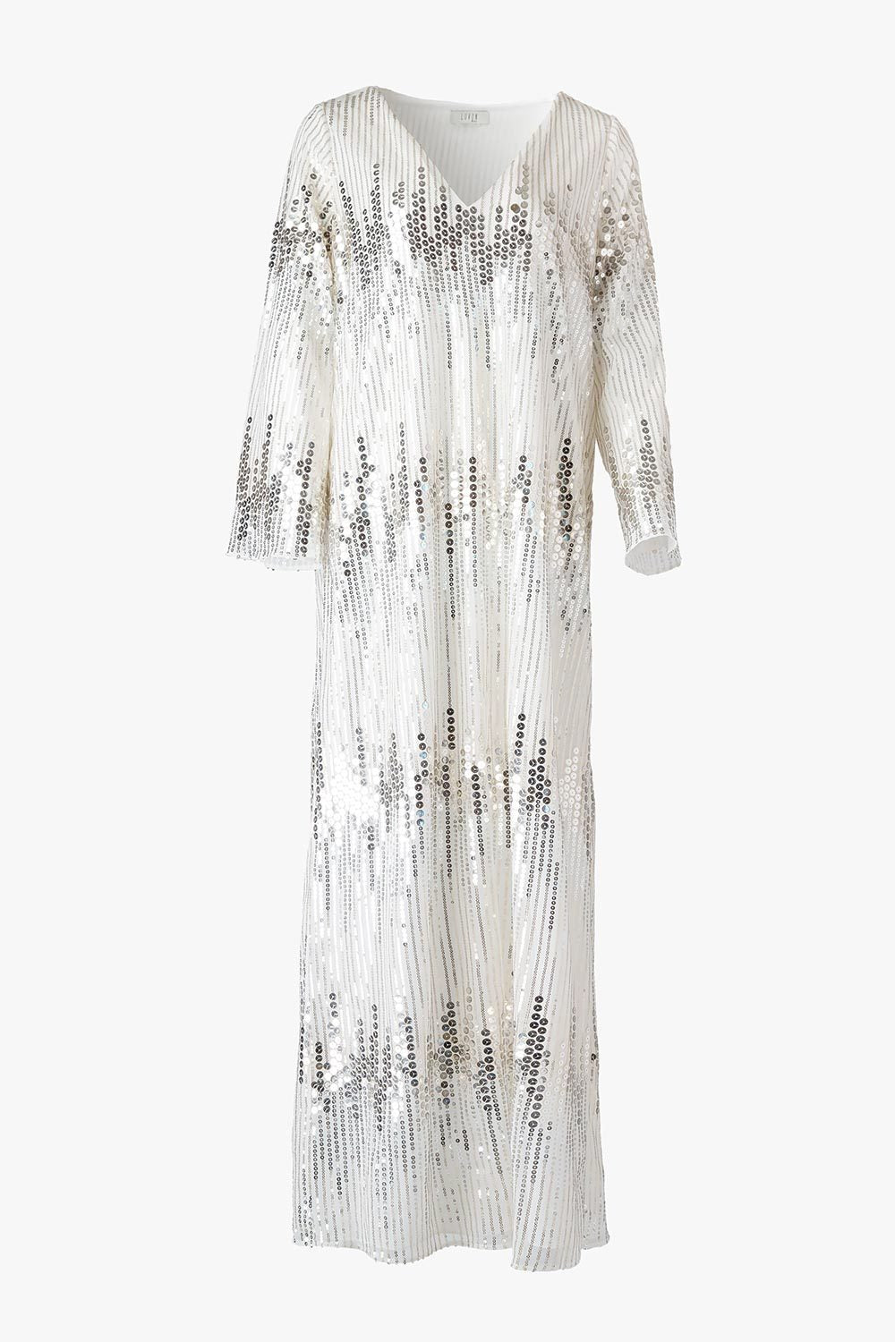 Luvon sequin v-neck bell-sleeved dress with front slit in white-silver.