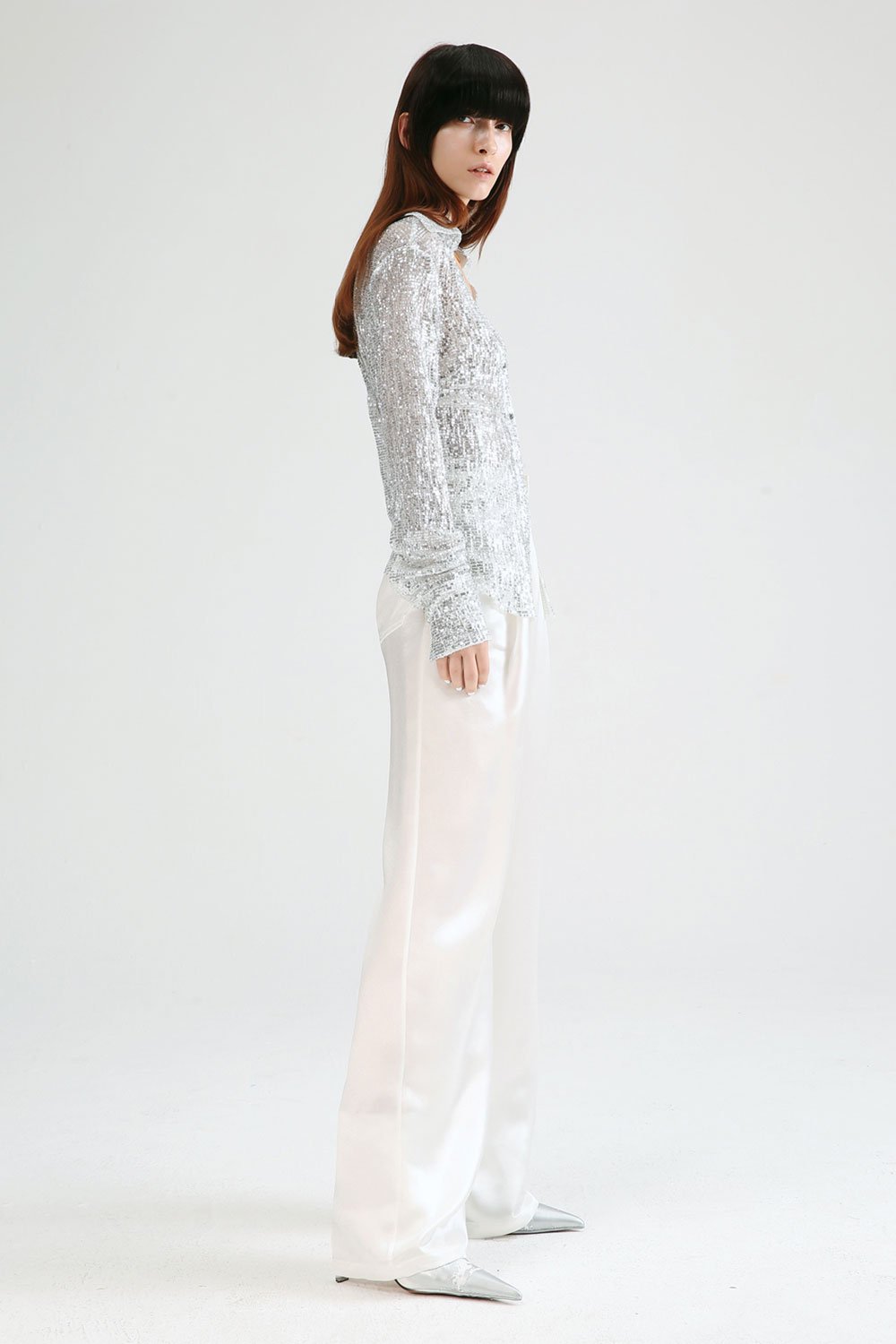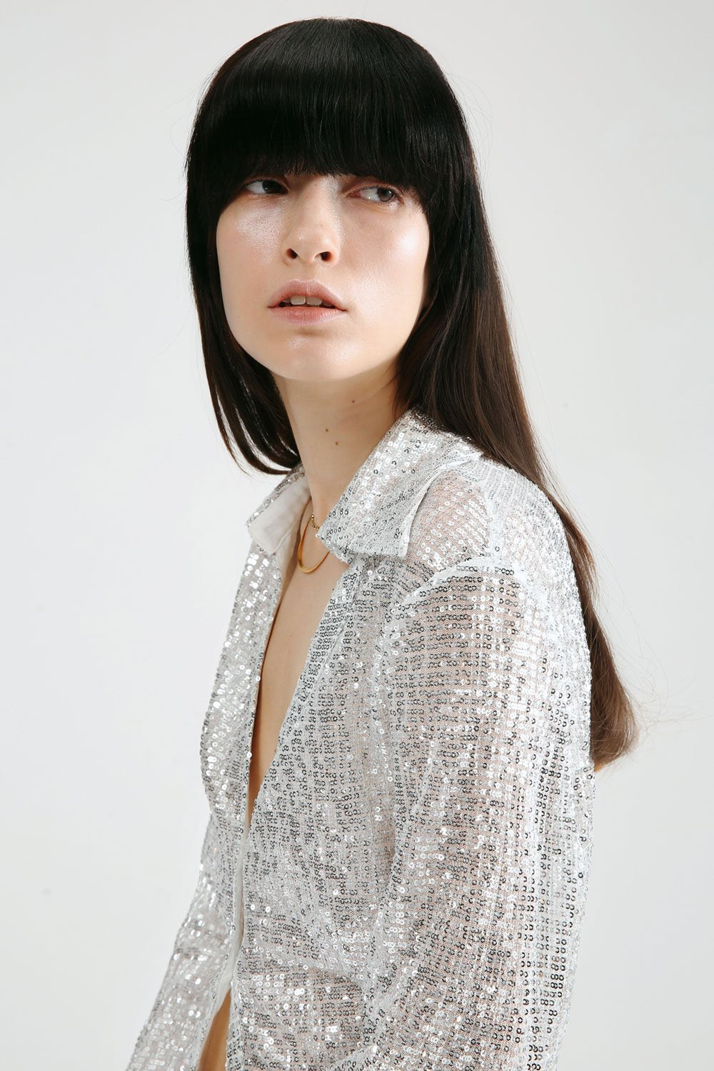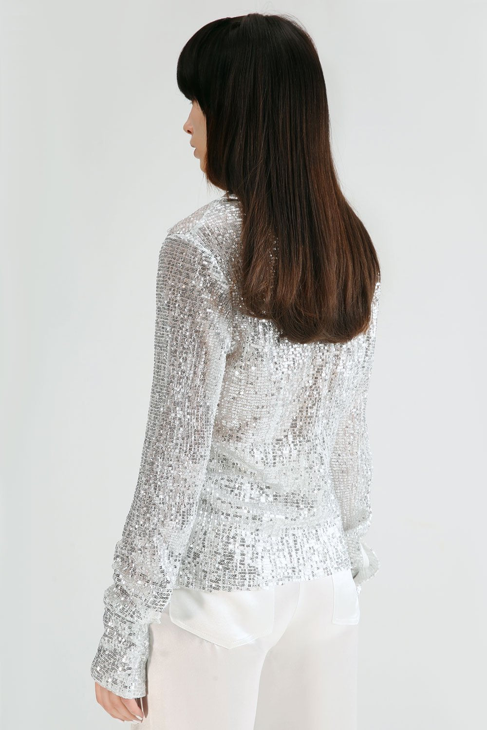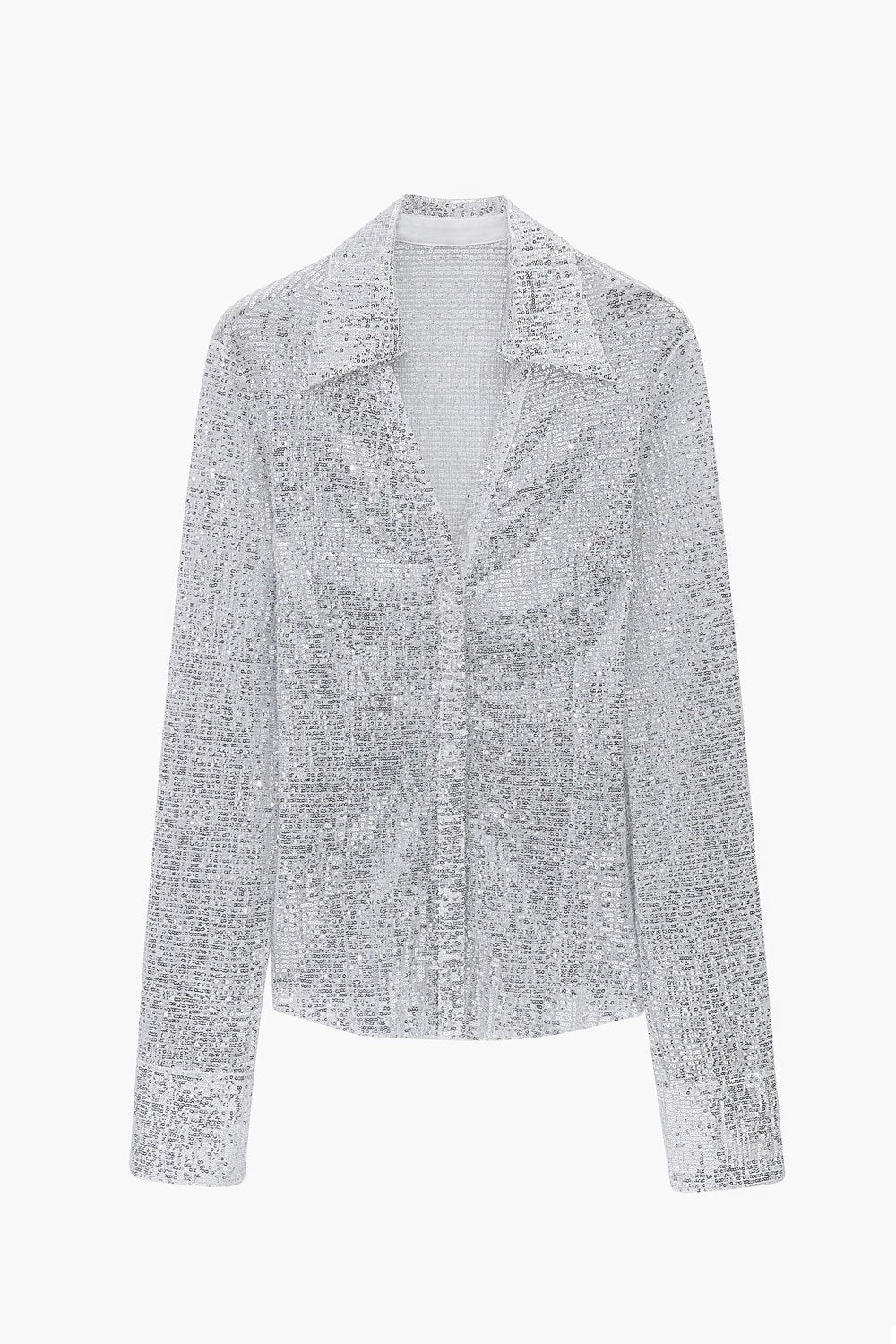 Lucency collared v-neck long-sleeve sequin shirt features a slim waist with double button closure and open front.
