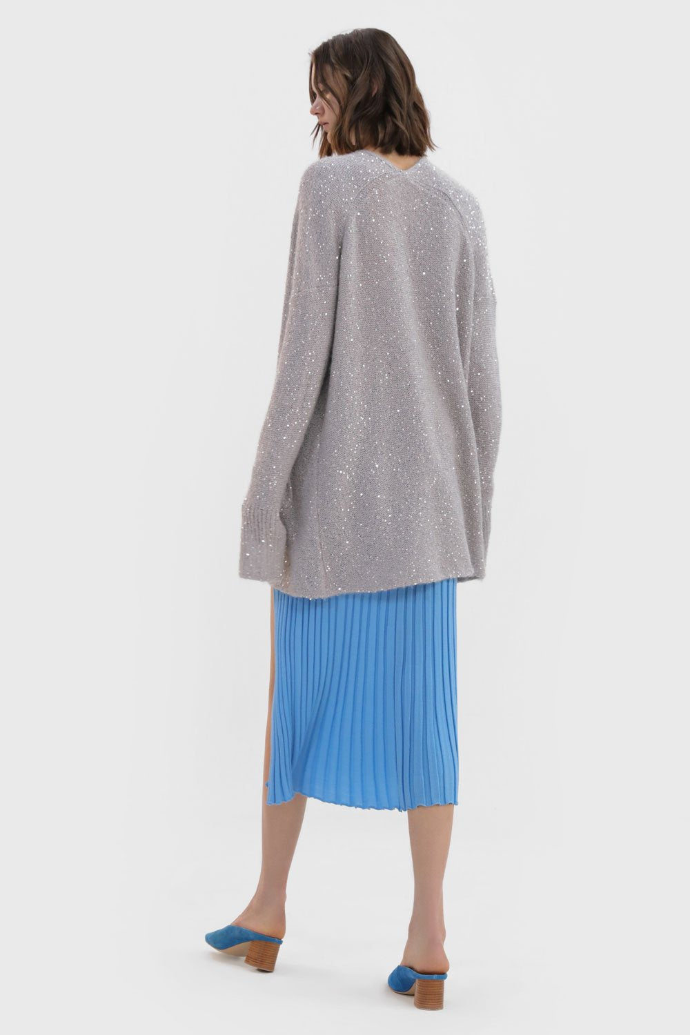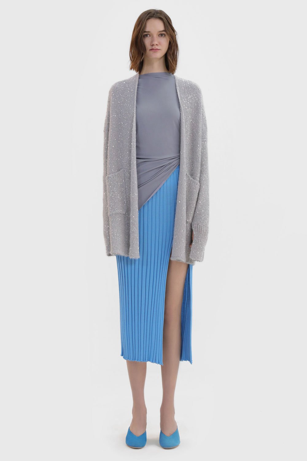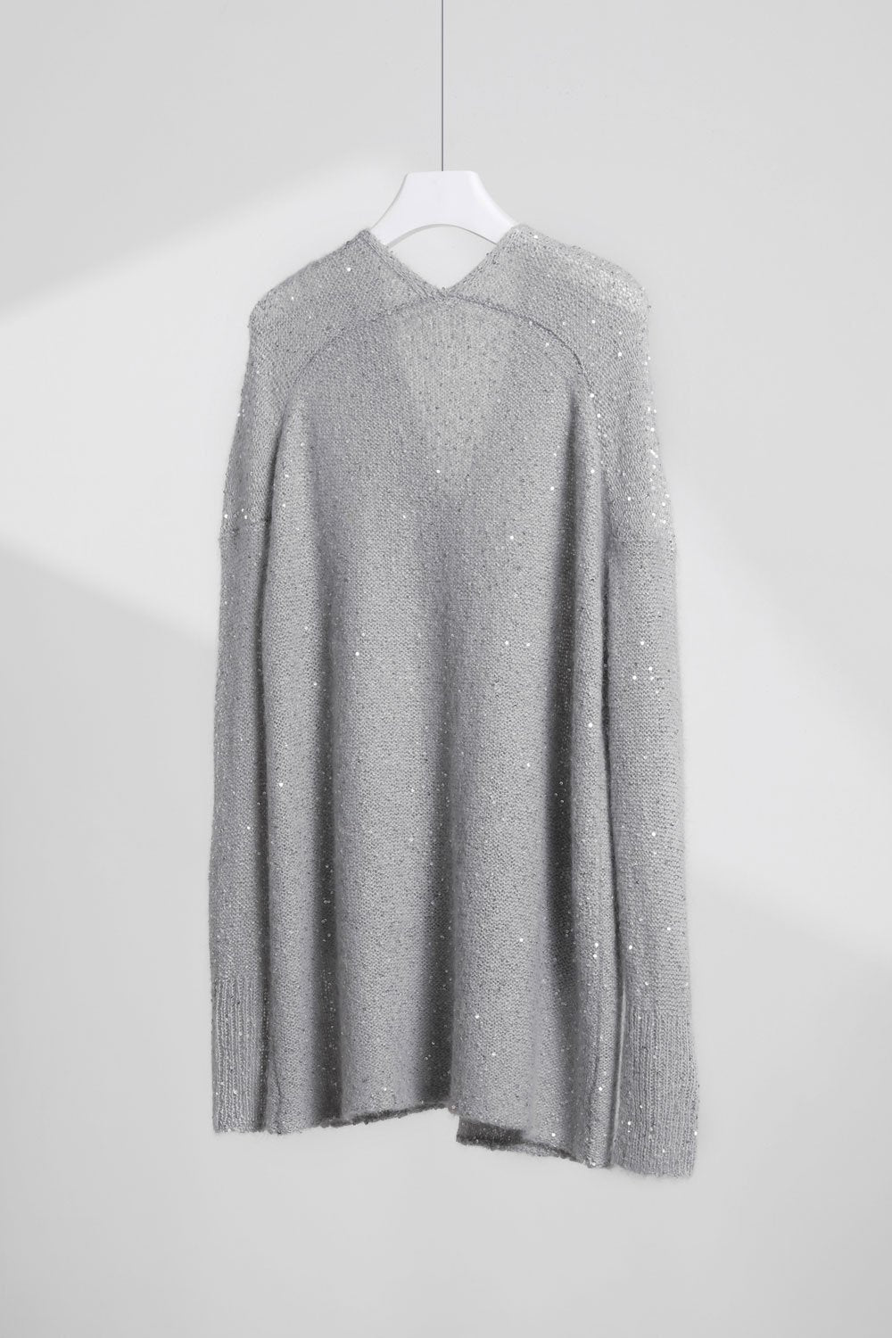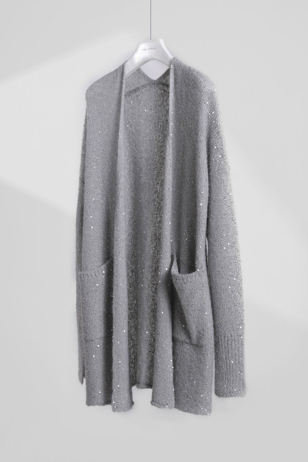 Yuel Xiang long sequined open knit cardigan in gray-silver features front pockets, slits on sleeves and ribbing detail on cuffs and bottom hem.
