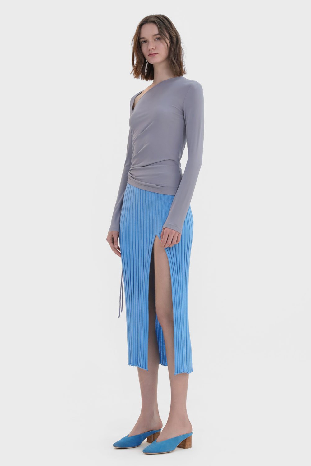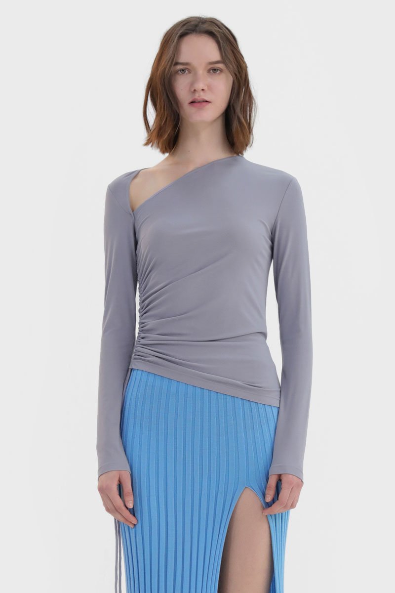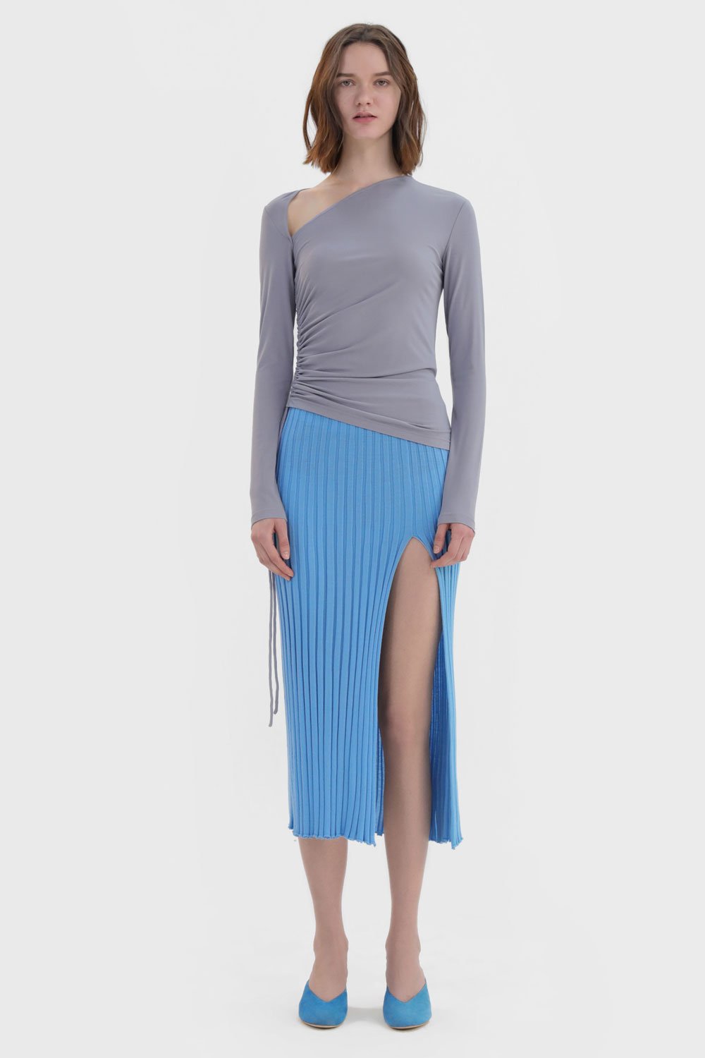 Yuel Xiang shoulder cut-out long-sleeved side drawstring shirt in smoky blue.