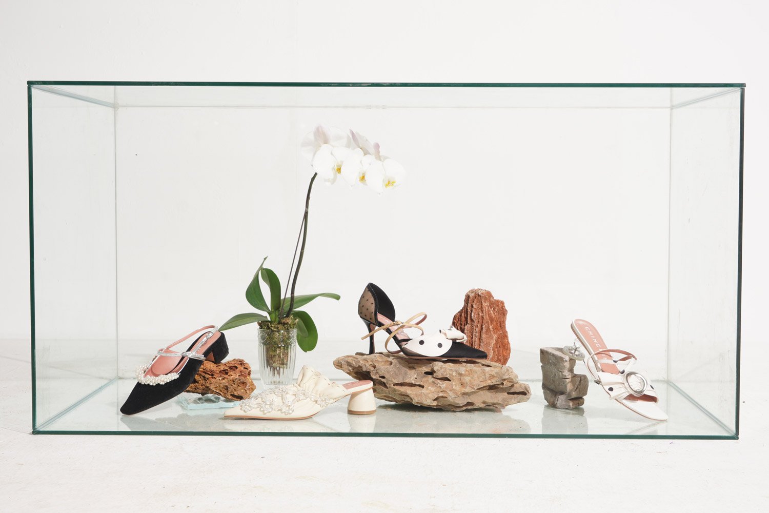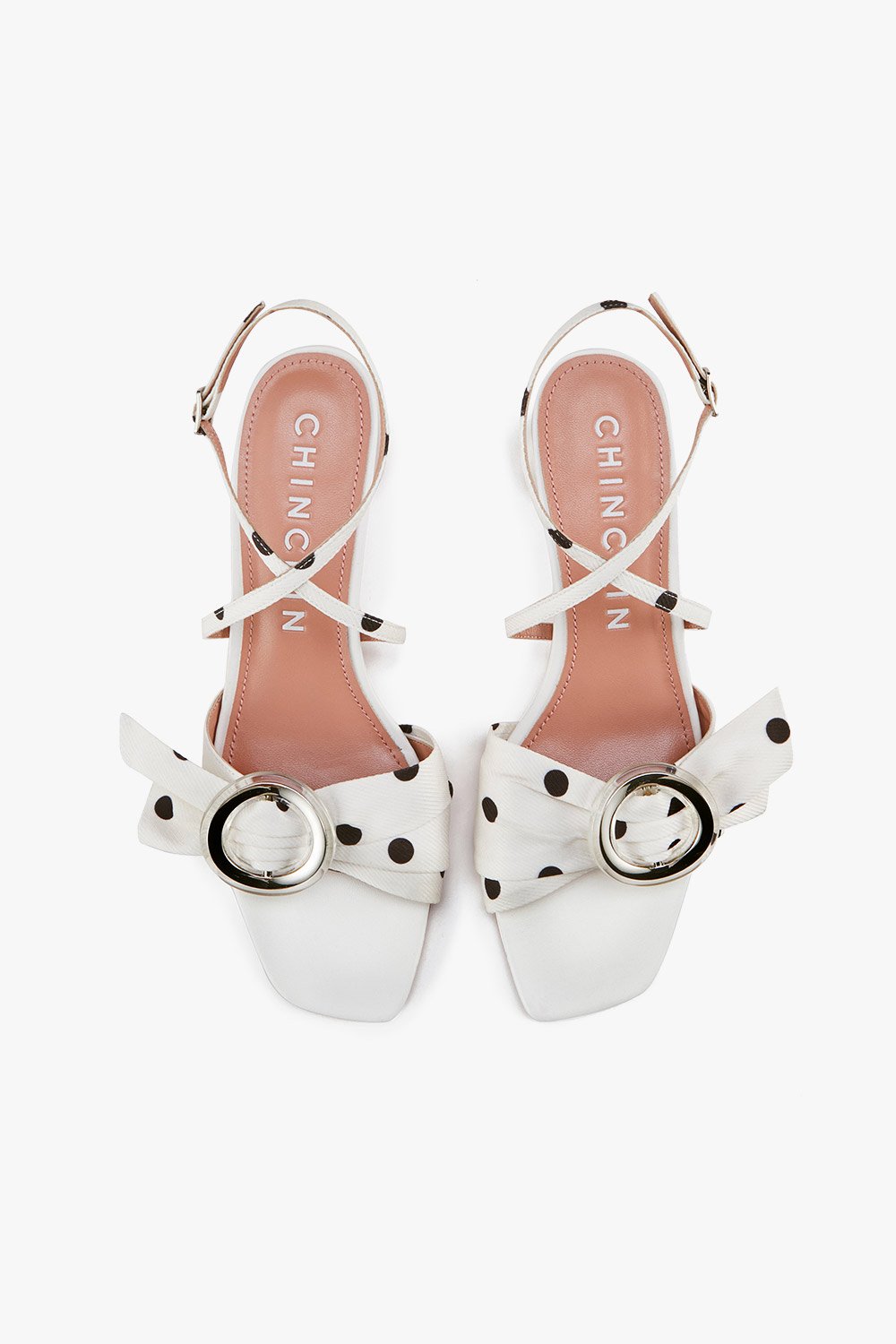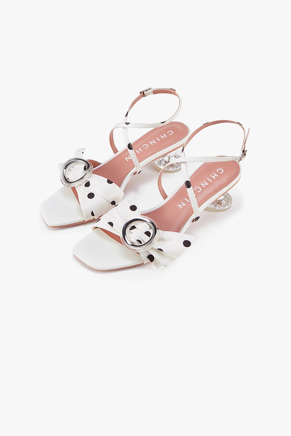 CHINCHIN polka dot silk sandal with clear buckle and crystal heel.