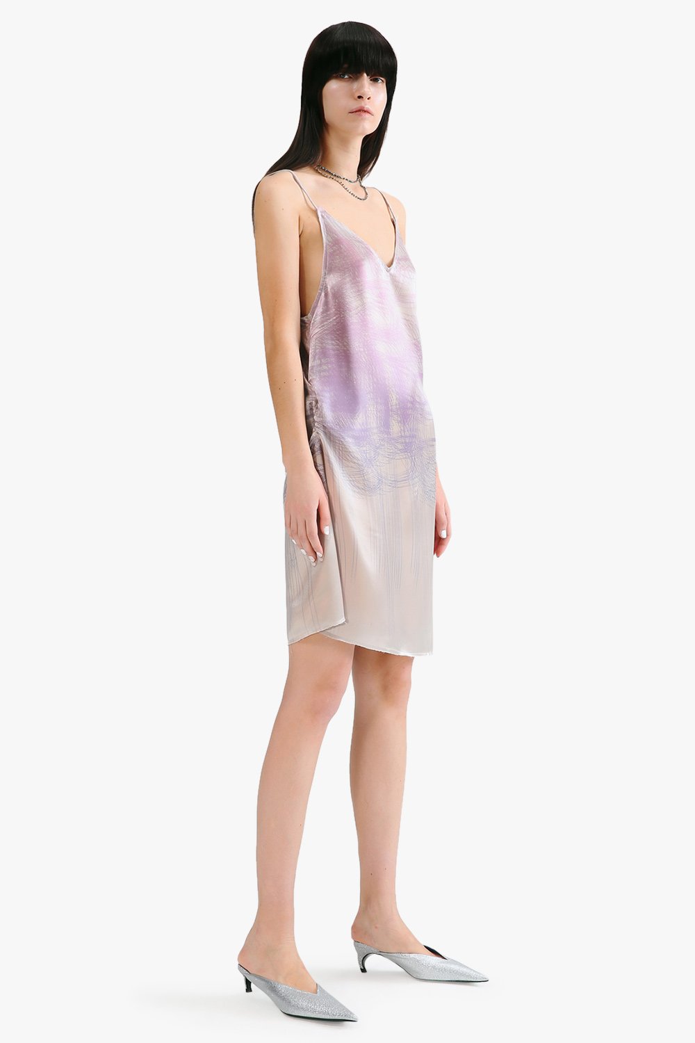 Lucency silky print sling dress with ruched sides in purple nude.