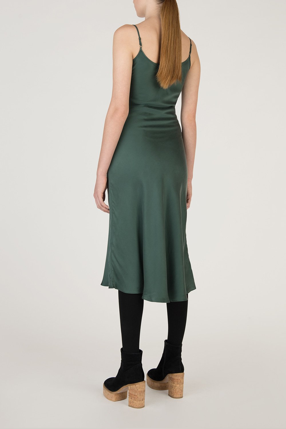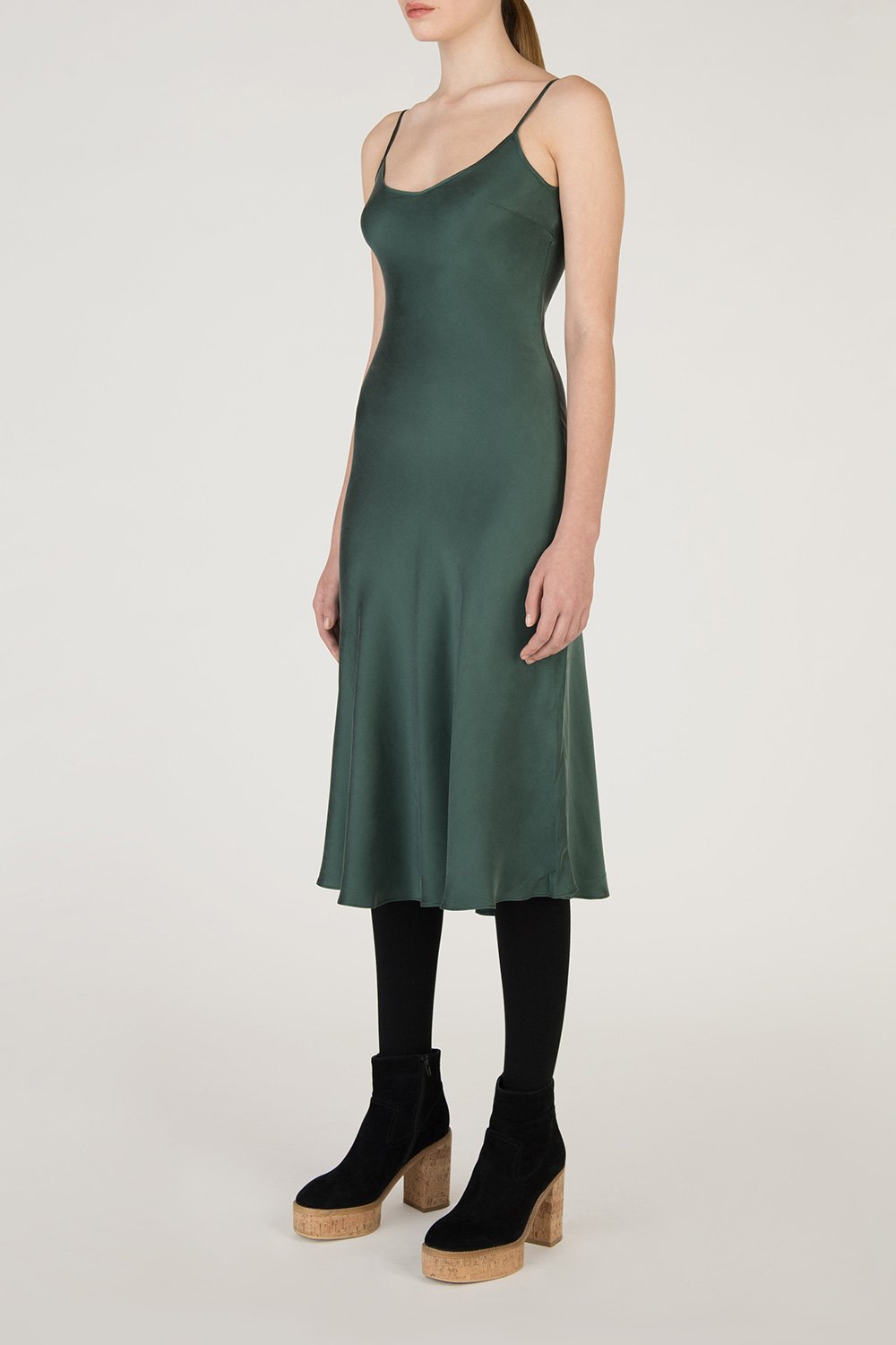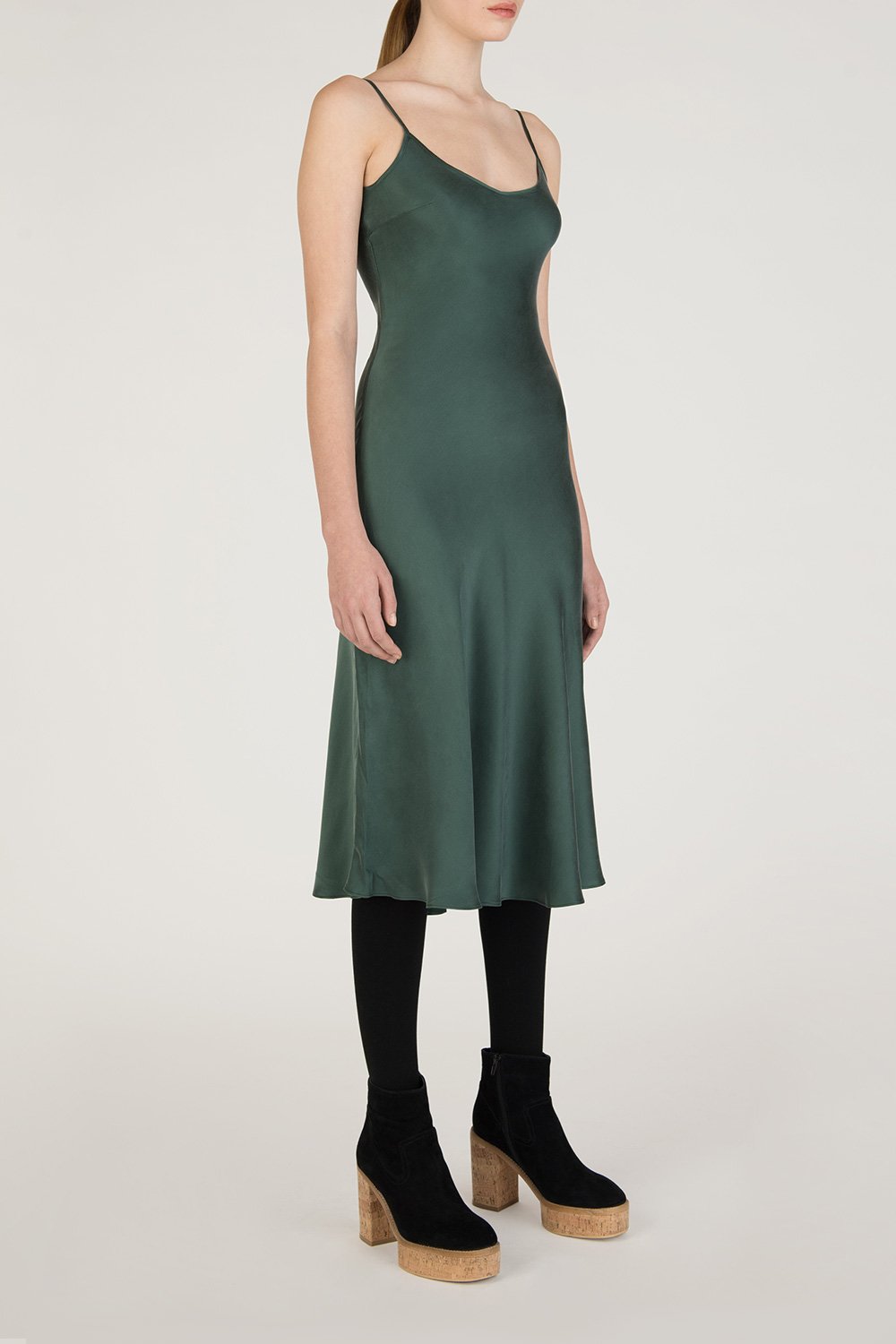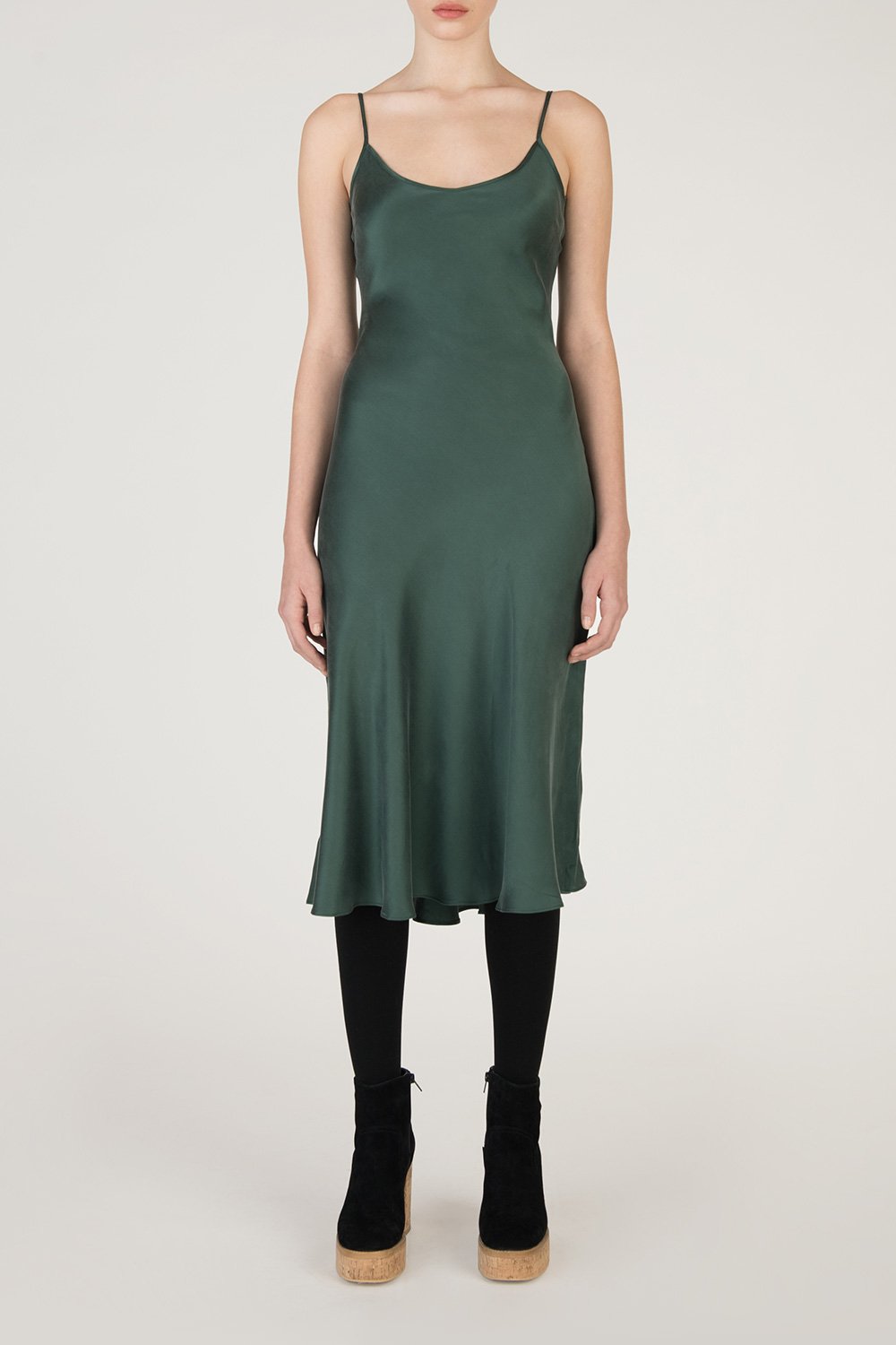 Slip-on silk dress features a texturized look and feel, lightweight, figure-hugging waist, adjustable narrow spaghetti straps, a drapey scoop-neckline, and round hem.