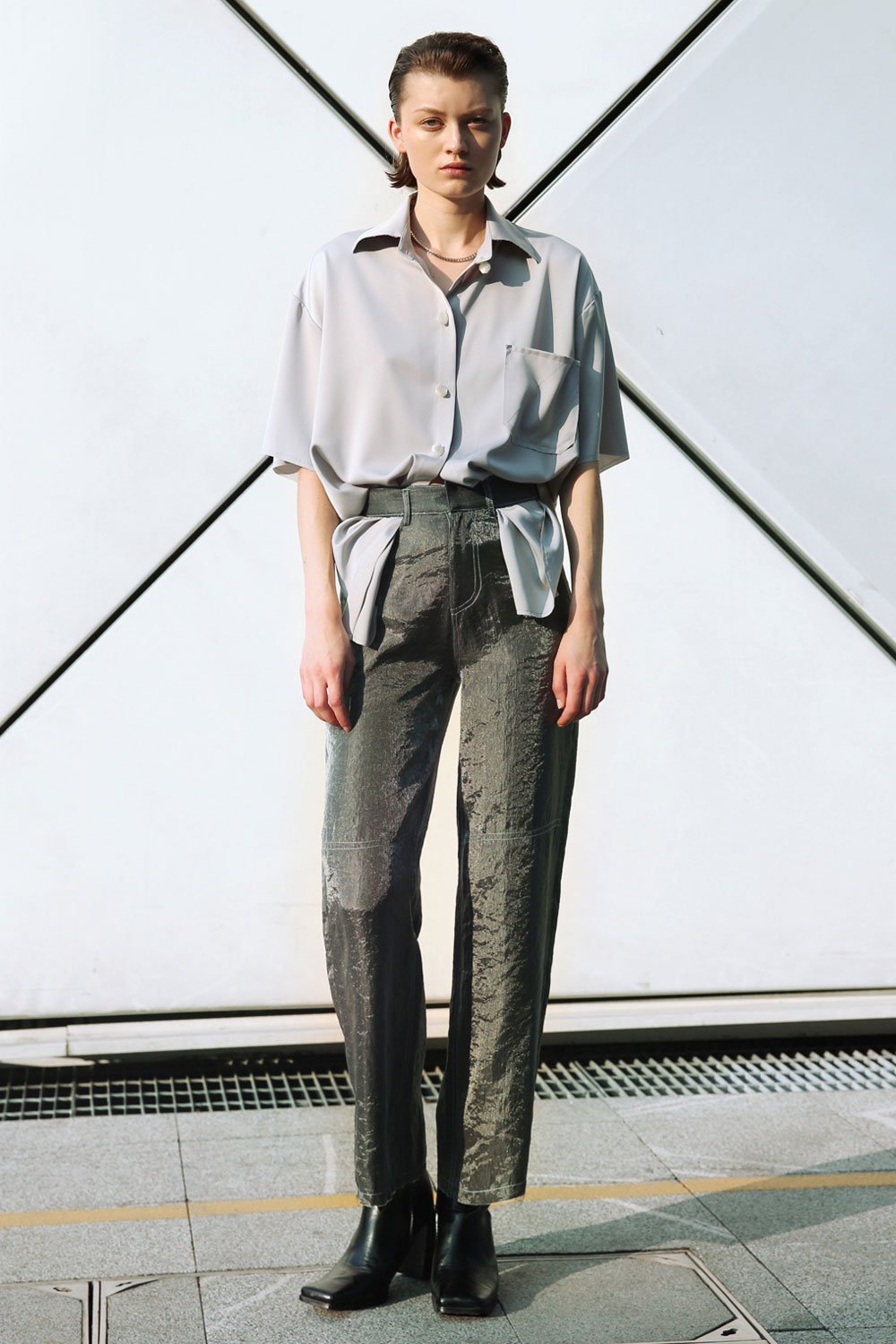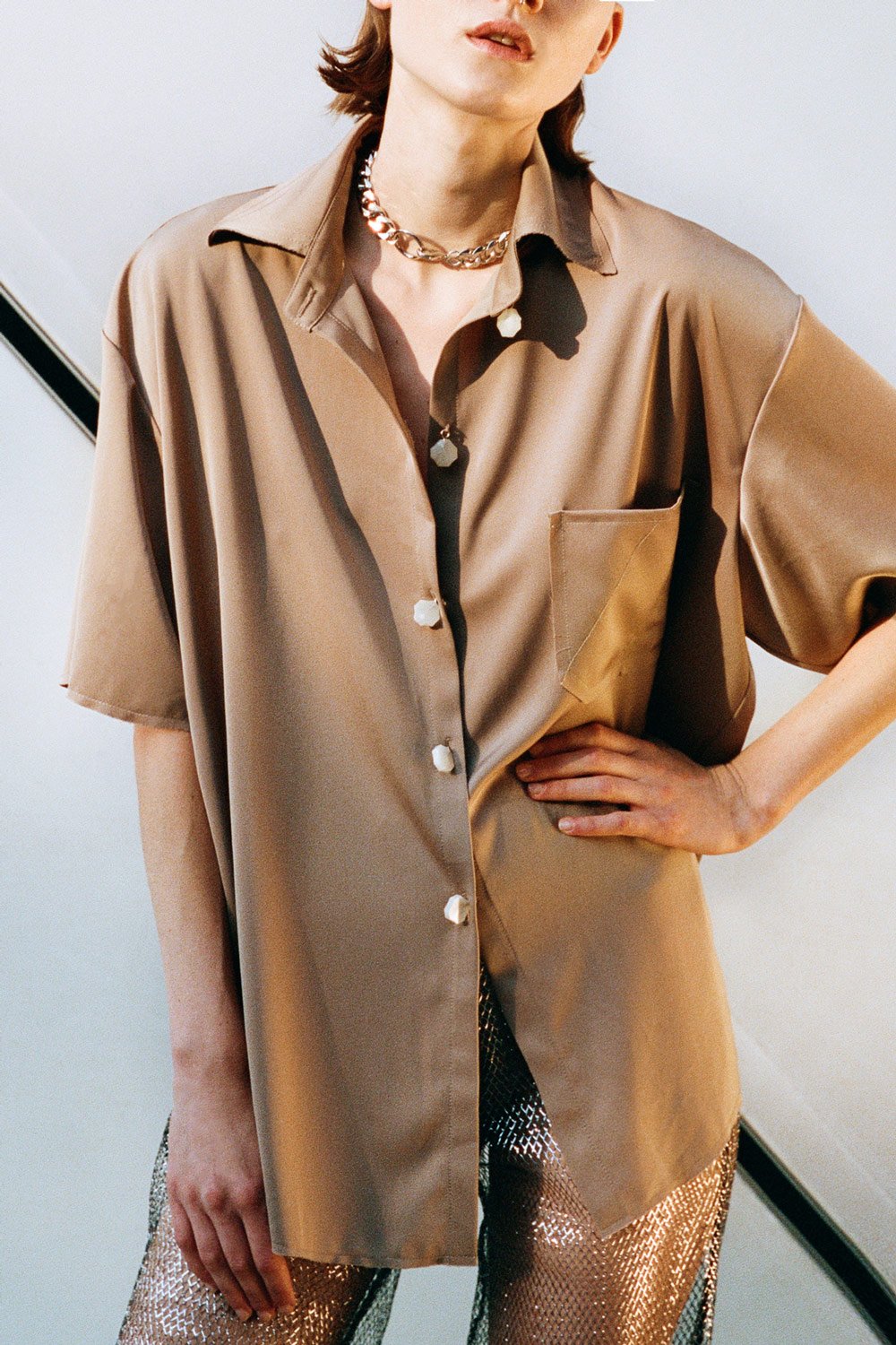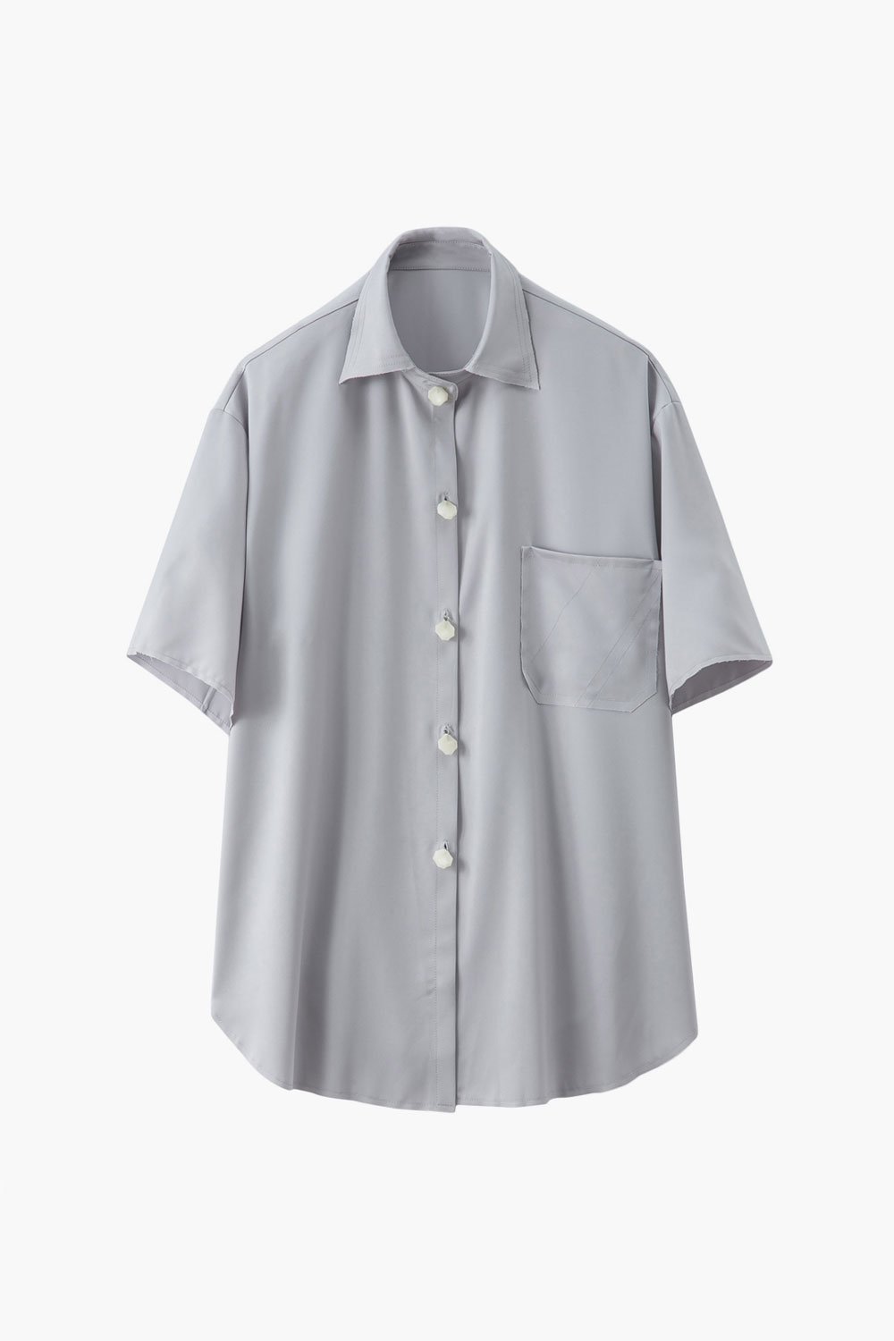 Lucency soft raw hem Hawaiian shirt in gray with floral shape shell buttons.