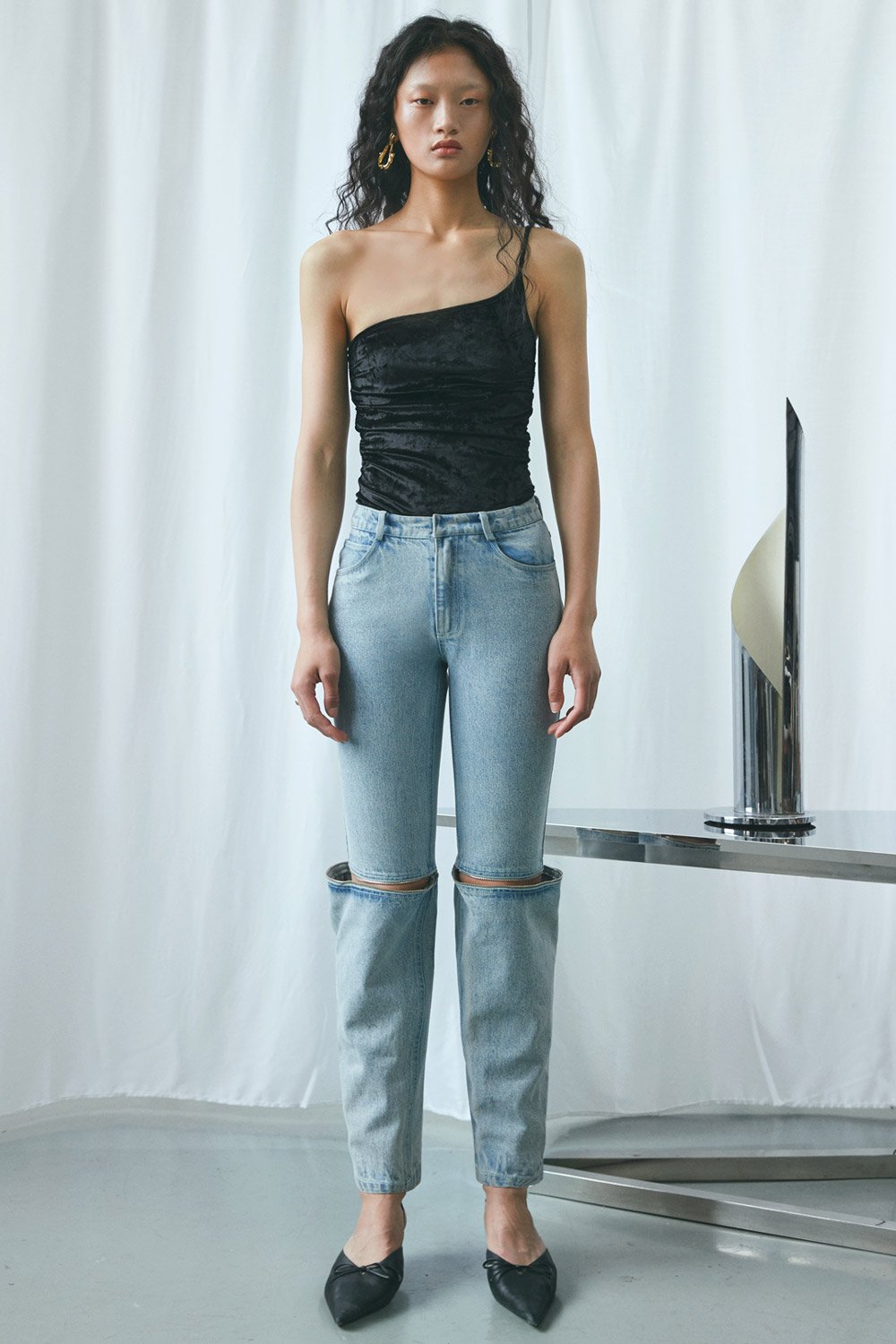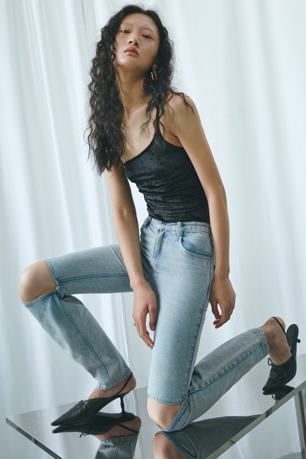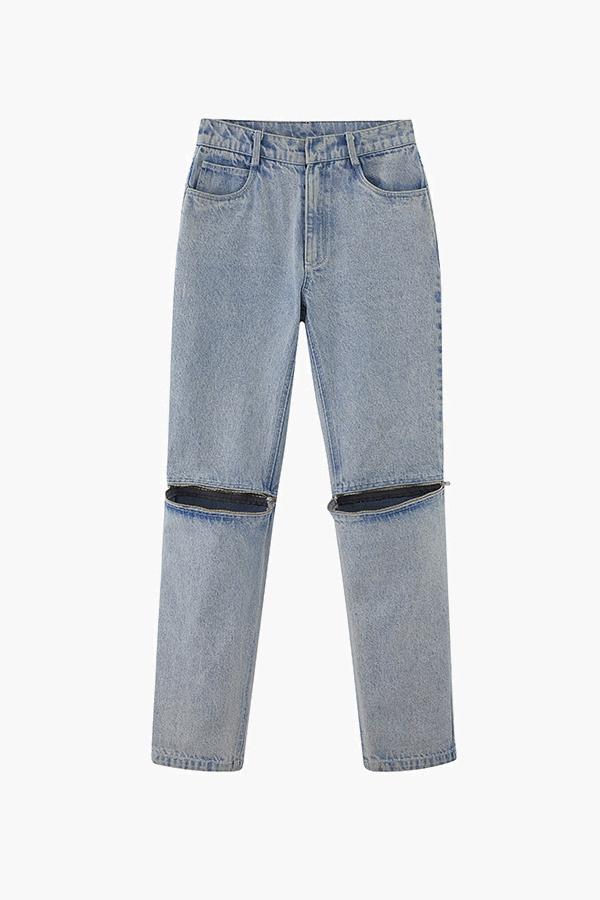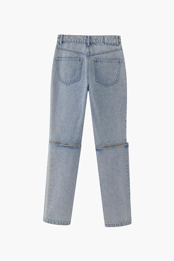 Lucency high-rise straight leg jeans with cut-out zipper detail on knees in a wash blue color.