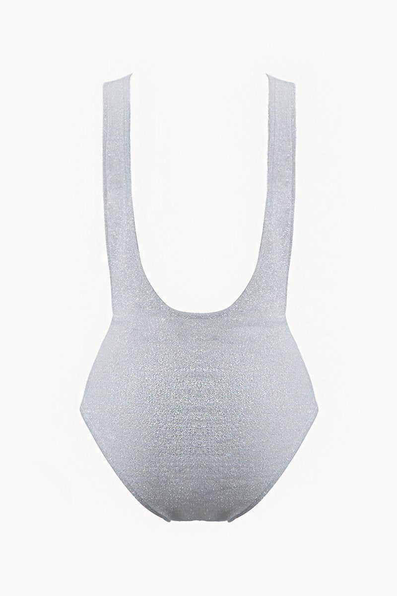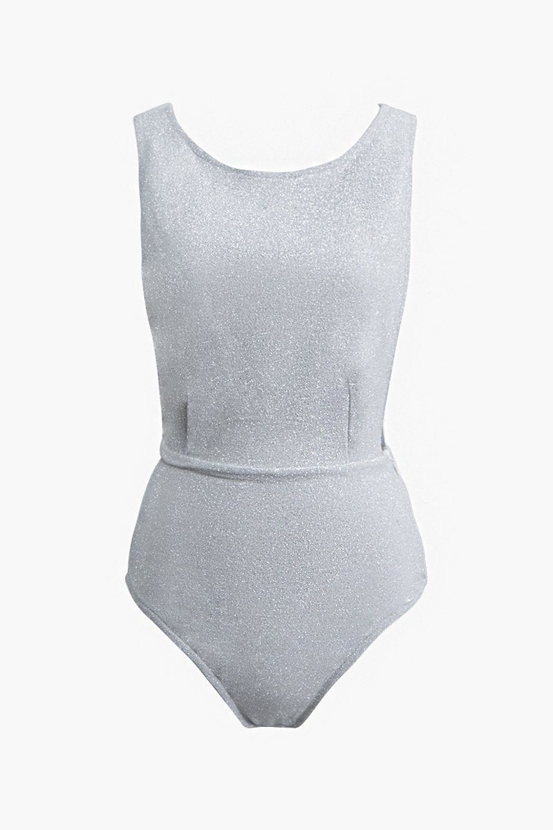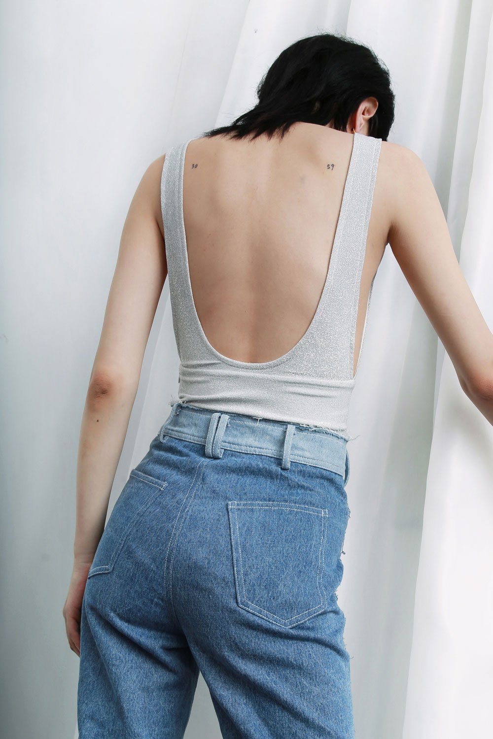 Lucency bodysuit features silver thread stitch throughout, slim fit high waistline, open U-back, hidden side zipper, and snap button closure. Subtle stretch.