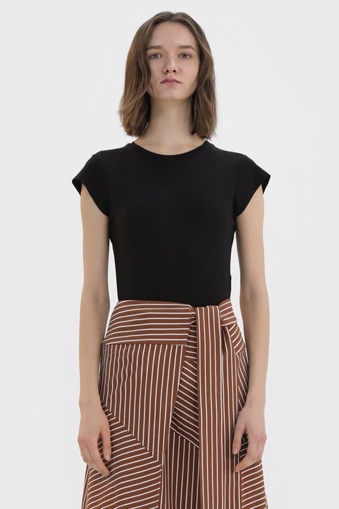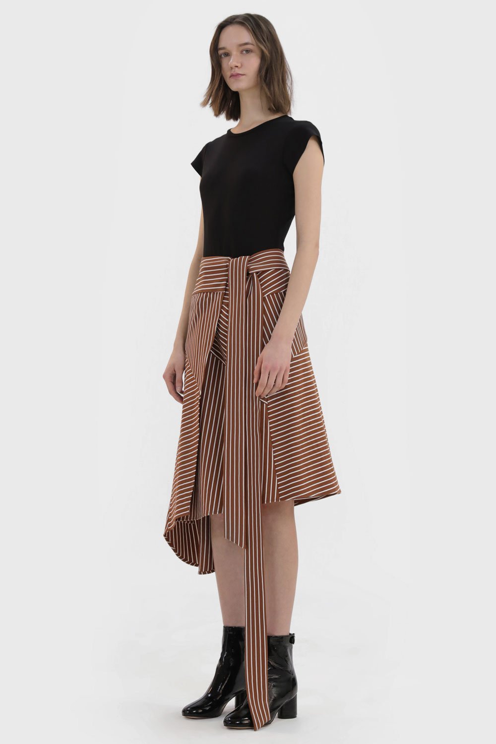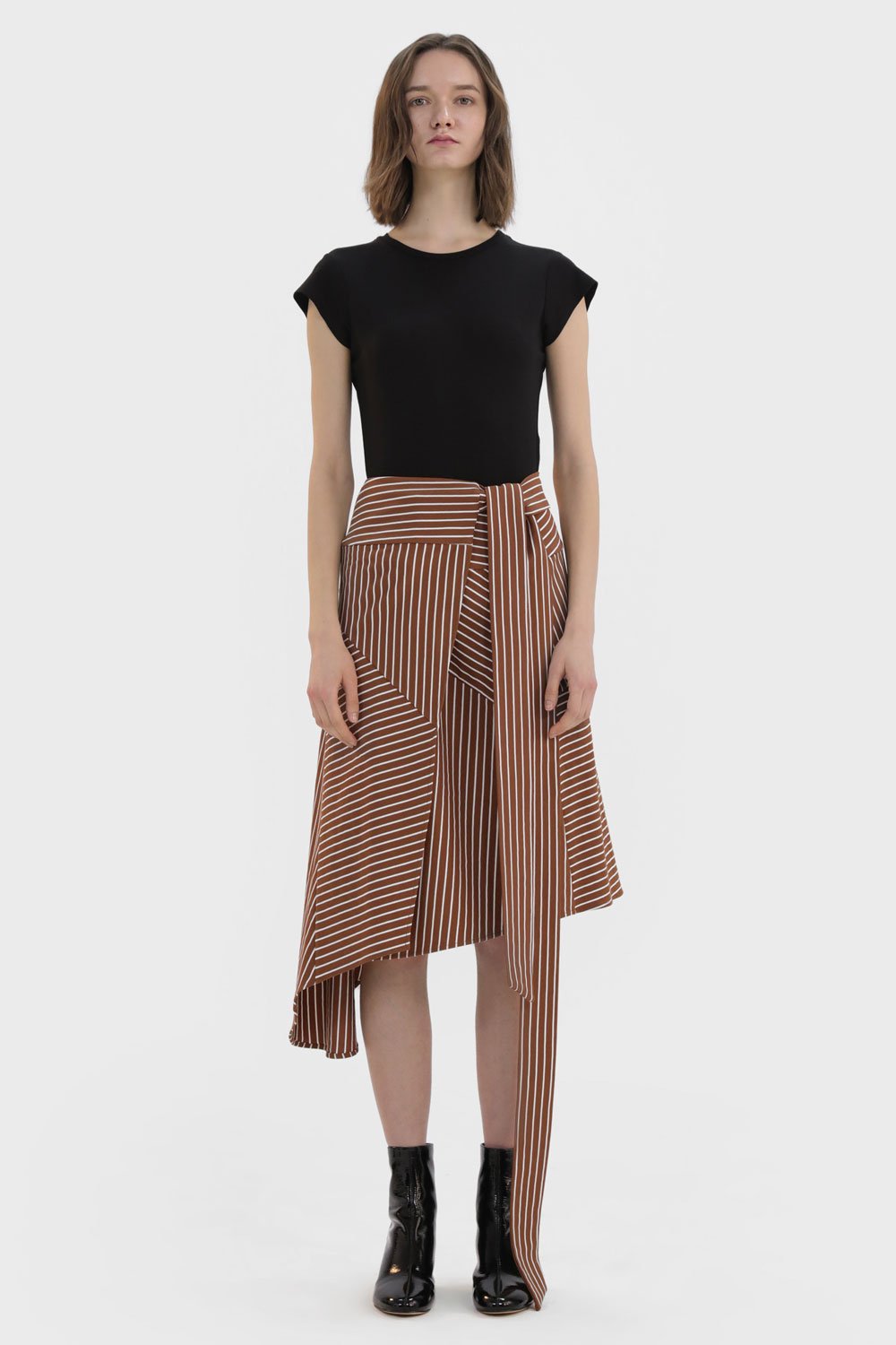 Yuel Xiang high-rise belted wrap asymmetrical hem striped midi skirt.