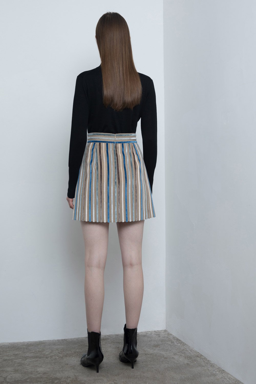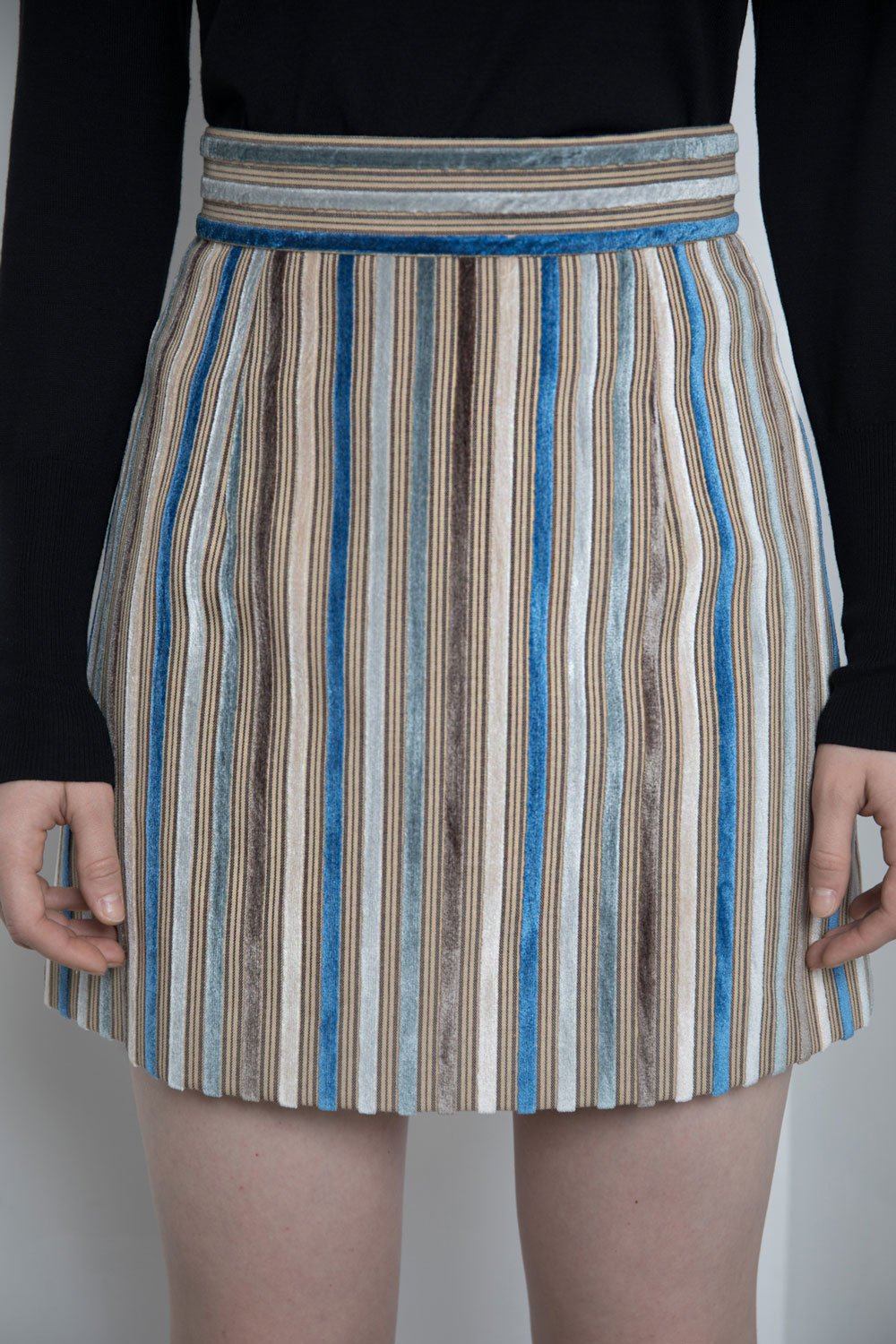 Yuel Xiang high-waisted striped velvet mini skirt.