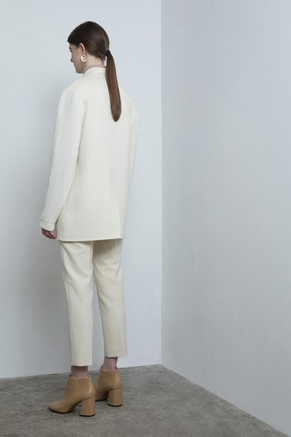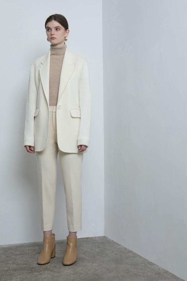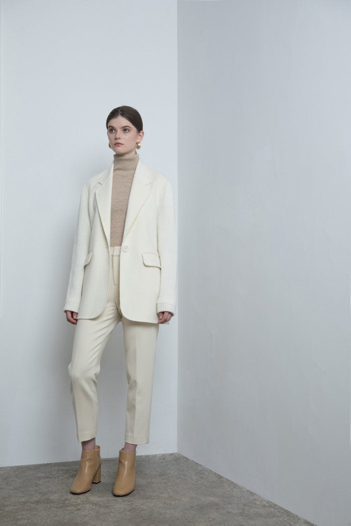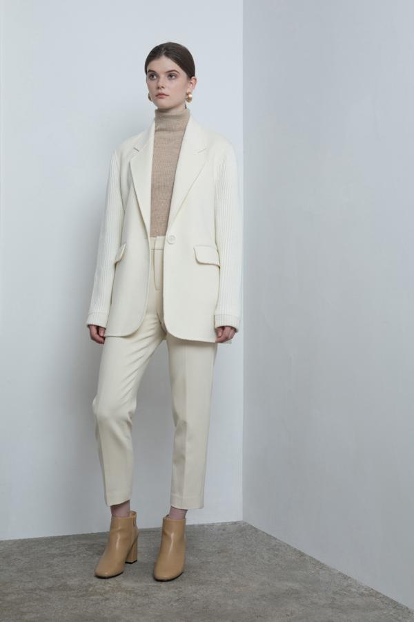 Yuel Xiang tailored wool jacket with ribbed knit sleeves in cream.