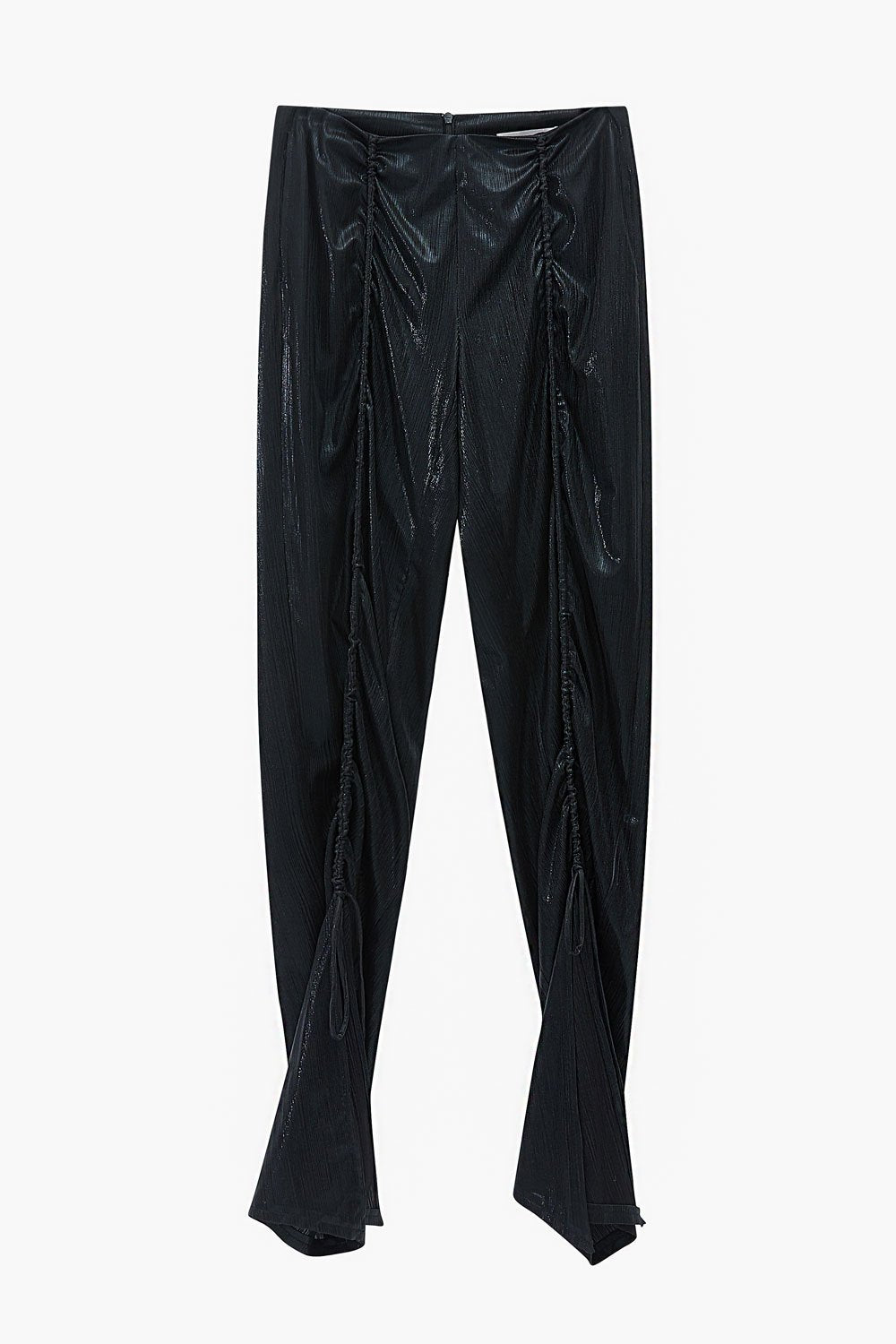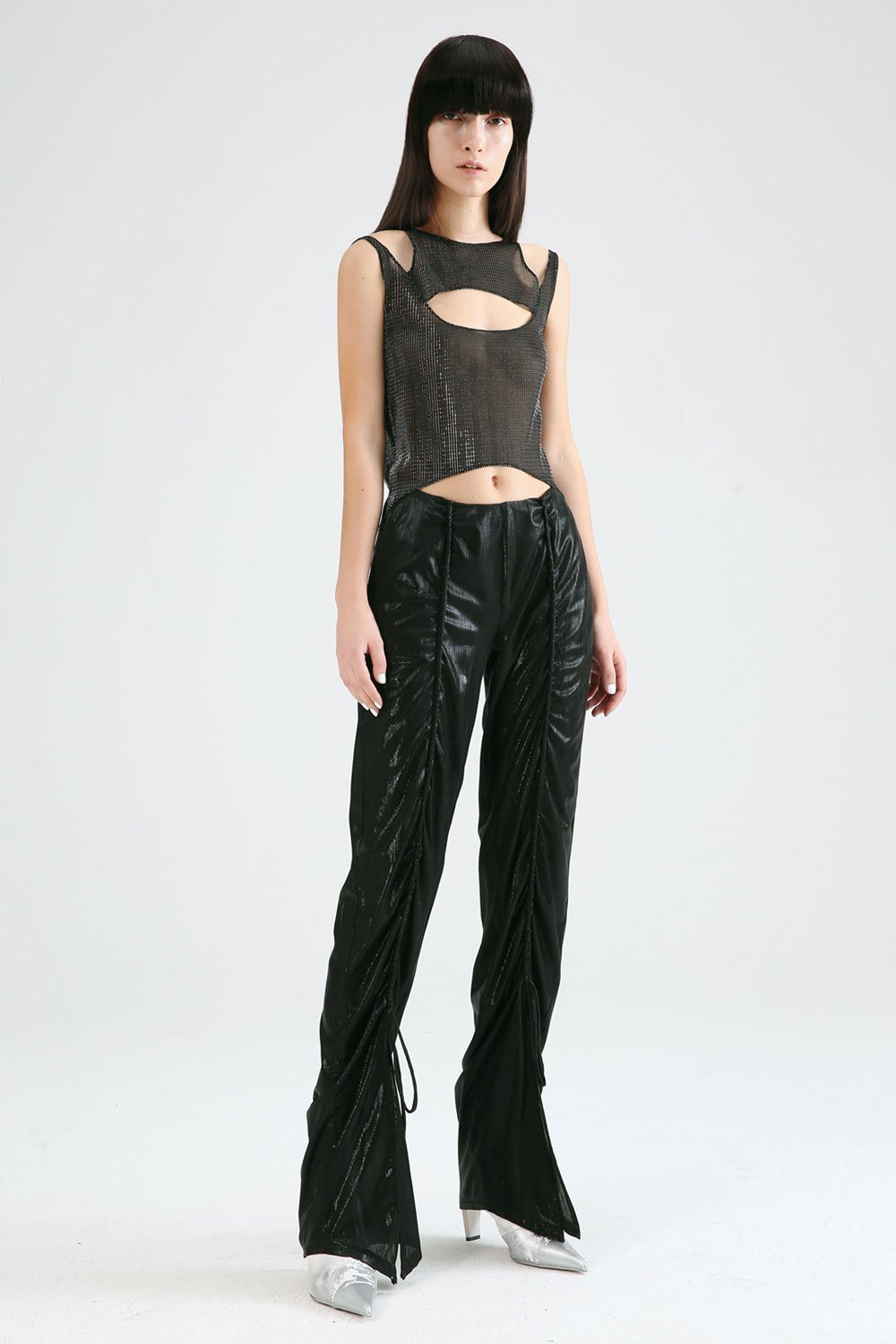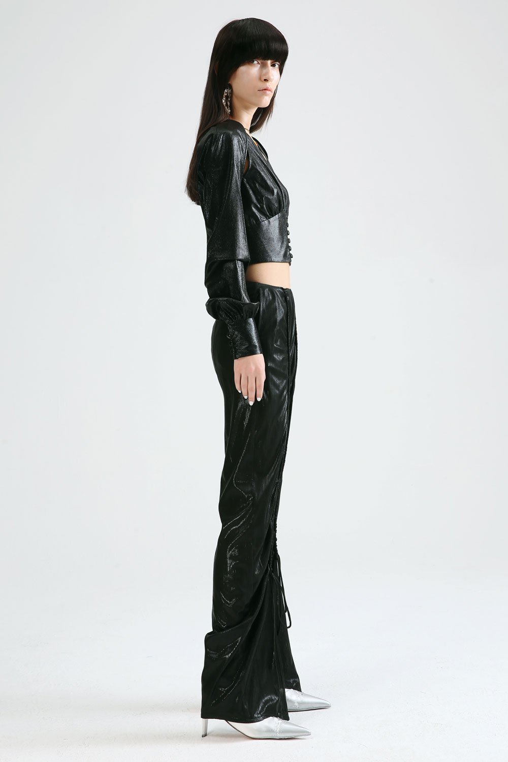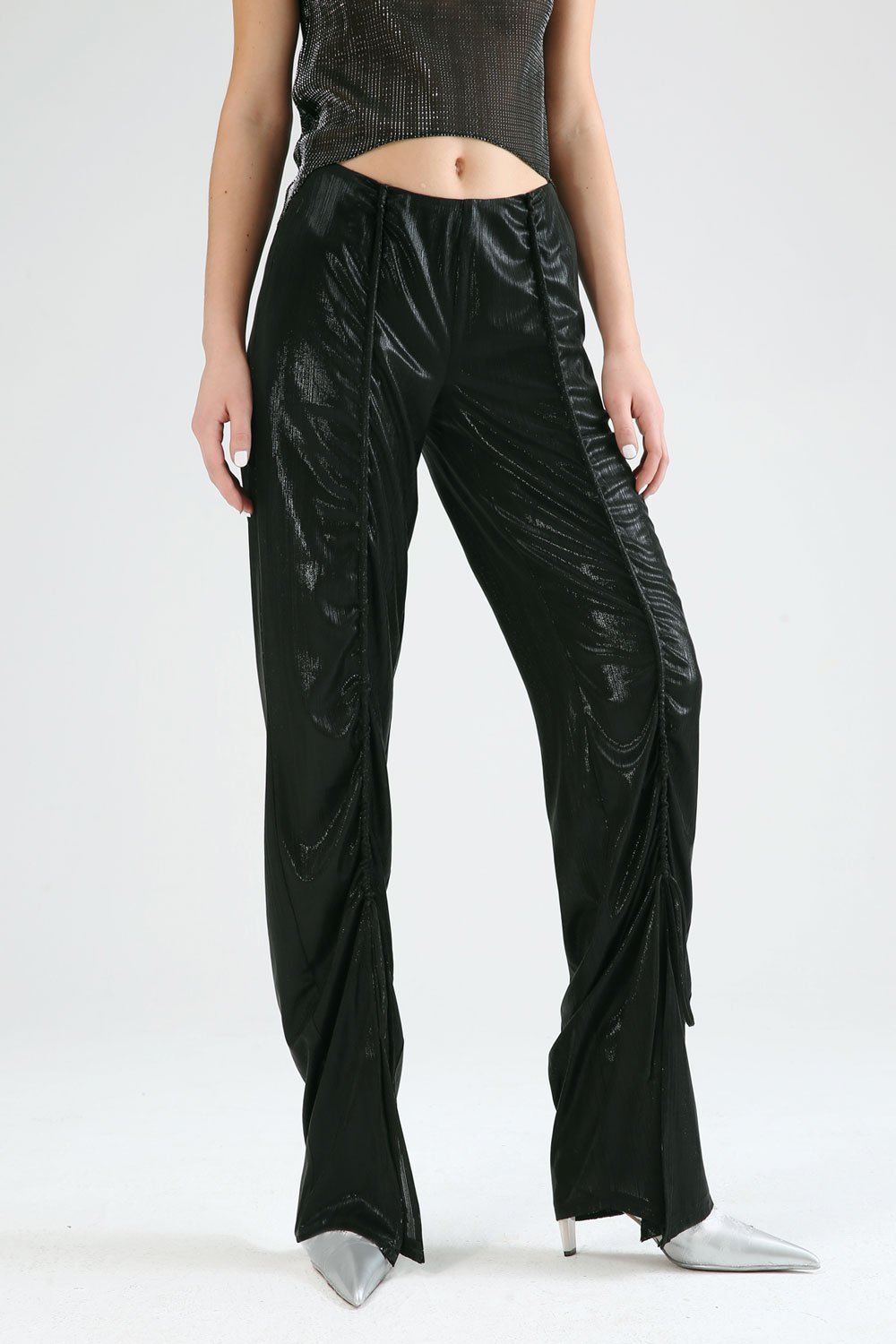 Lucency striped textured faux leather light pleated bell bottom pants in black.