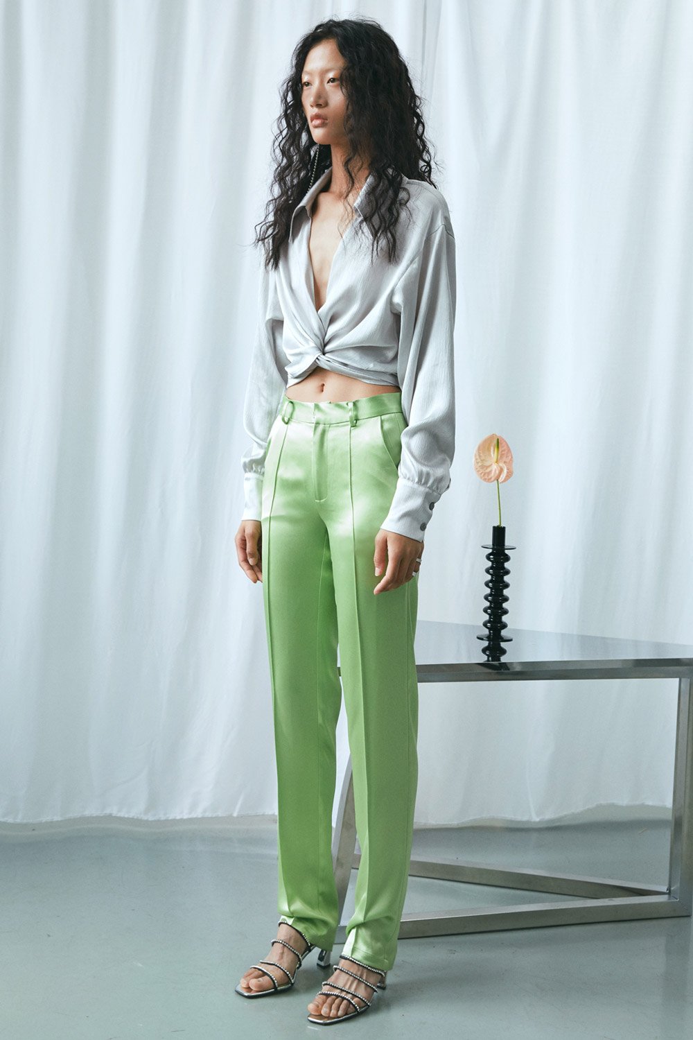 Lucency soft and thin textured v-neck crop top features a wide collar and oversized sleeves. It has a wrap design, that can be tied in the front, back or knotted in center. Color is silver with a gray tint and is slightly sheer.