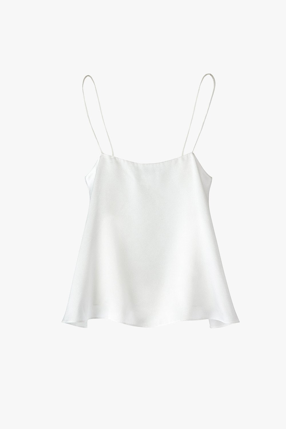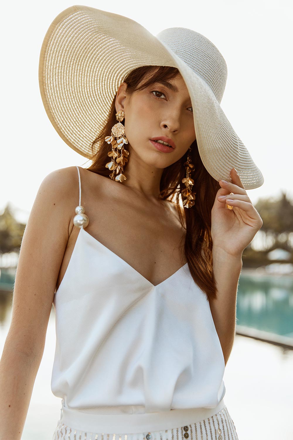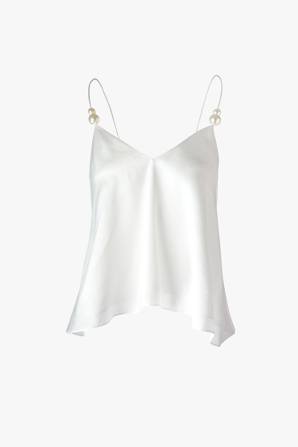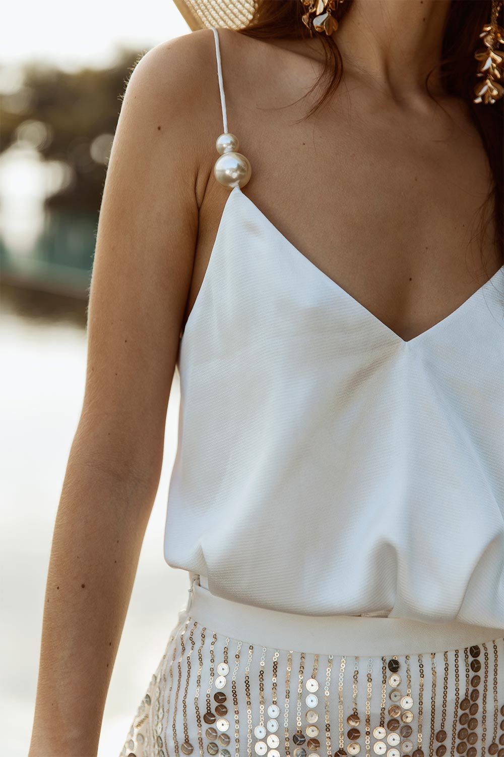 Luvon v-neck top featured a double layer, crop and flowy bottom hem with pearls on shoulder straps. Fine-line texture throughout.