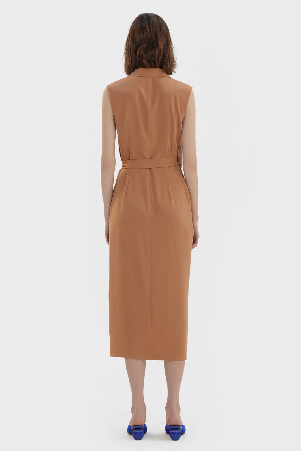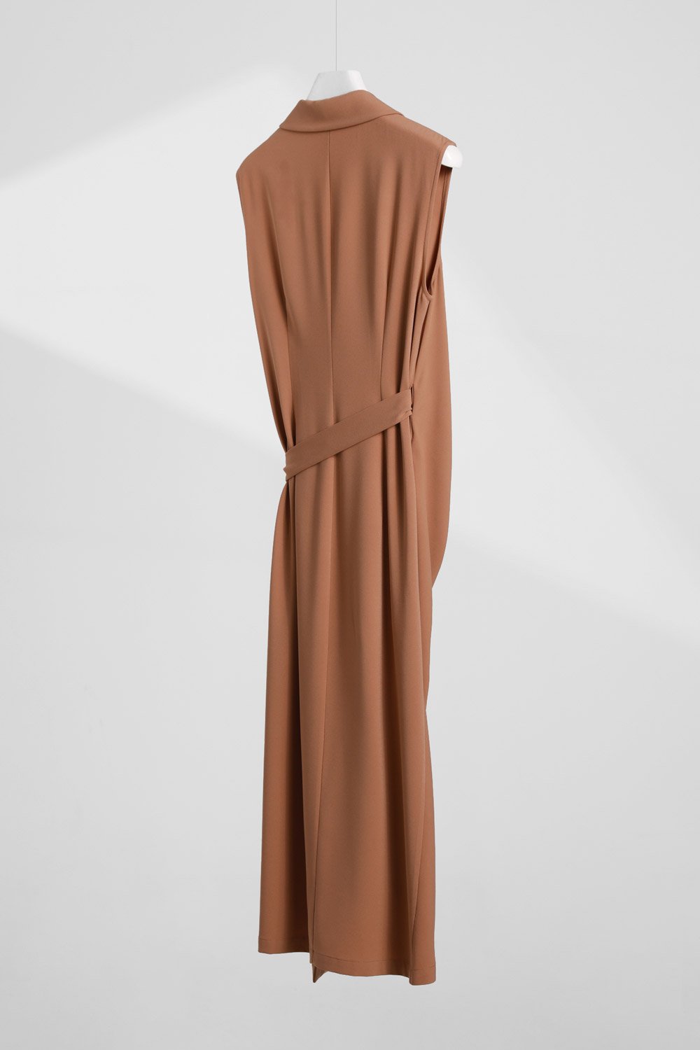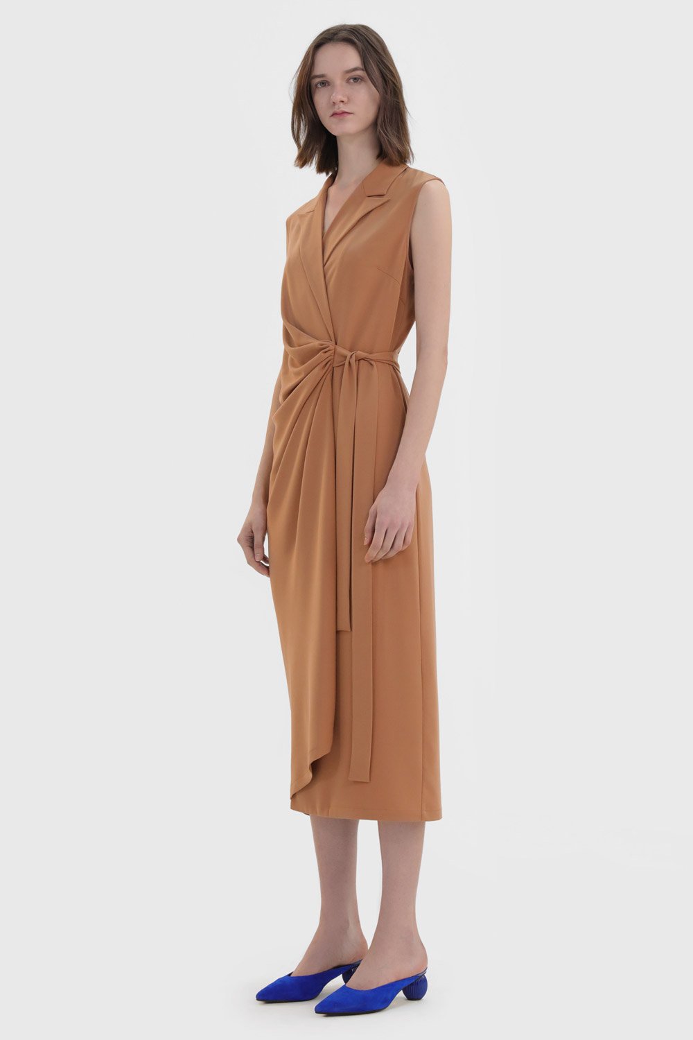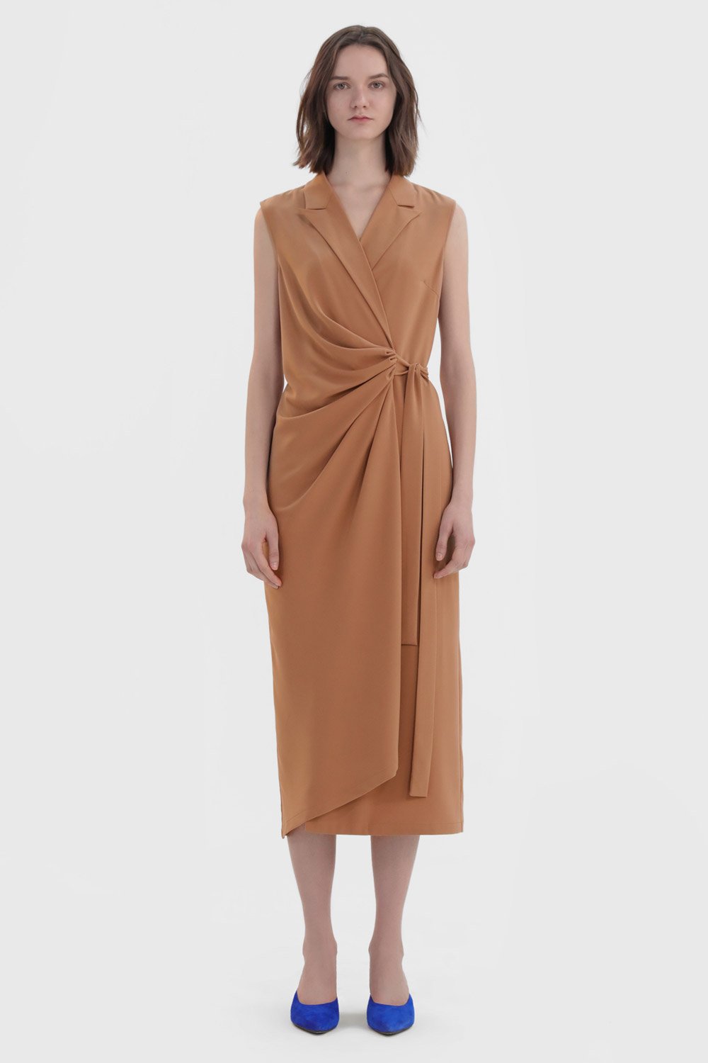 Yuel Xiang collared v-neck pleated waist wrap dress in maple.