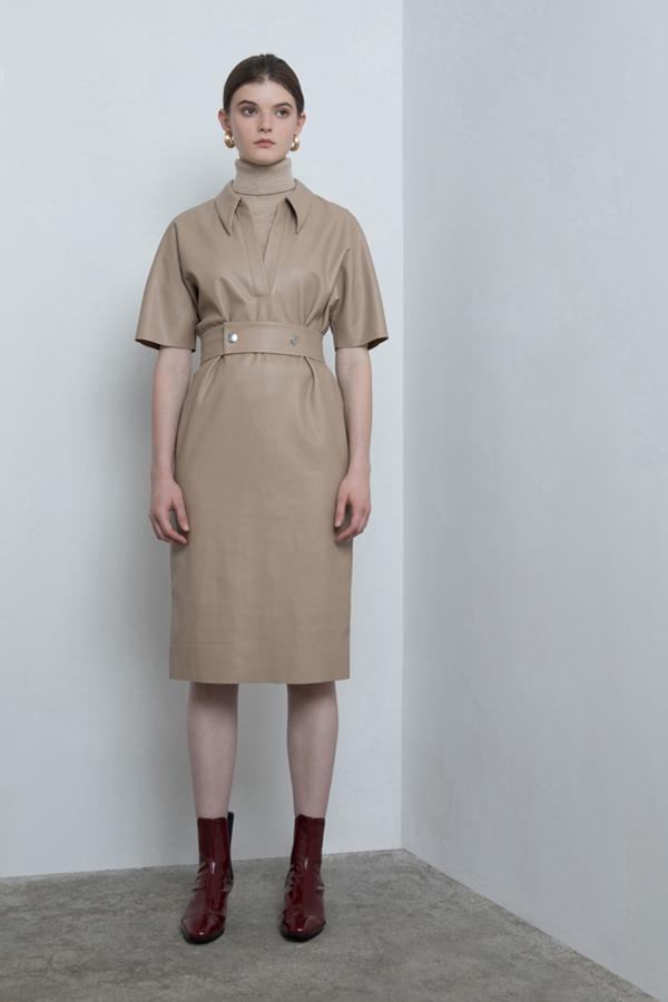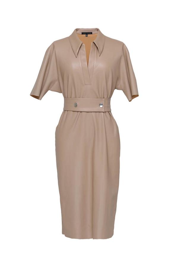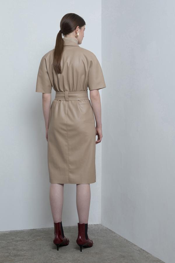 Yuel Xiang vegan faux leather V-neck short sleeve belted dress in khaki.