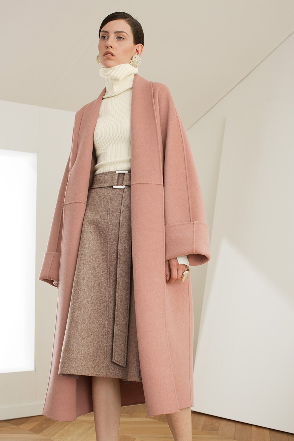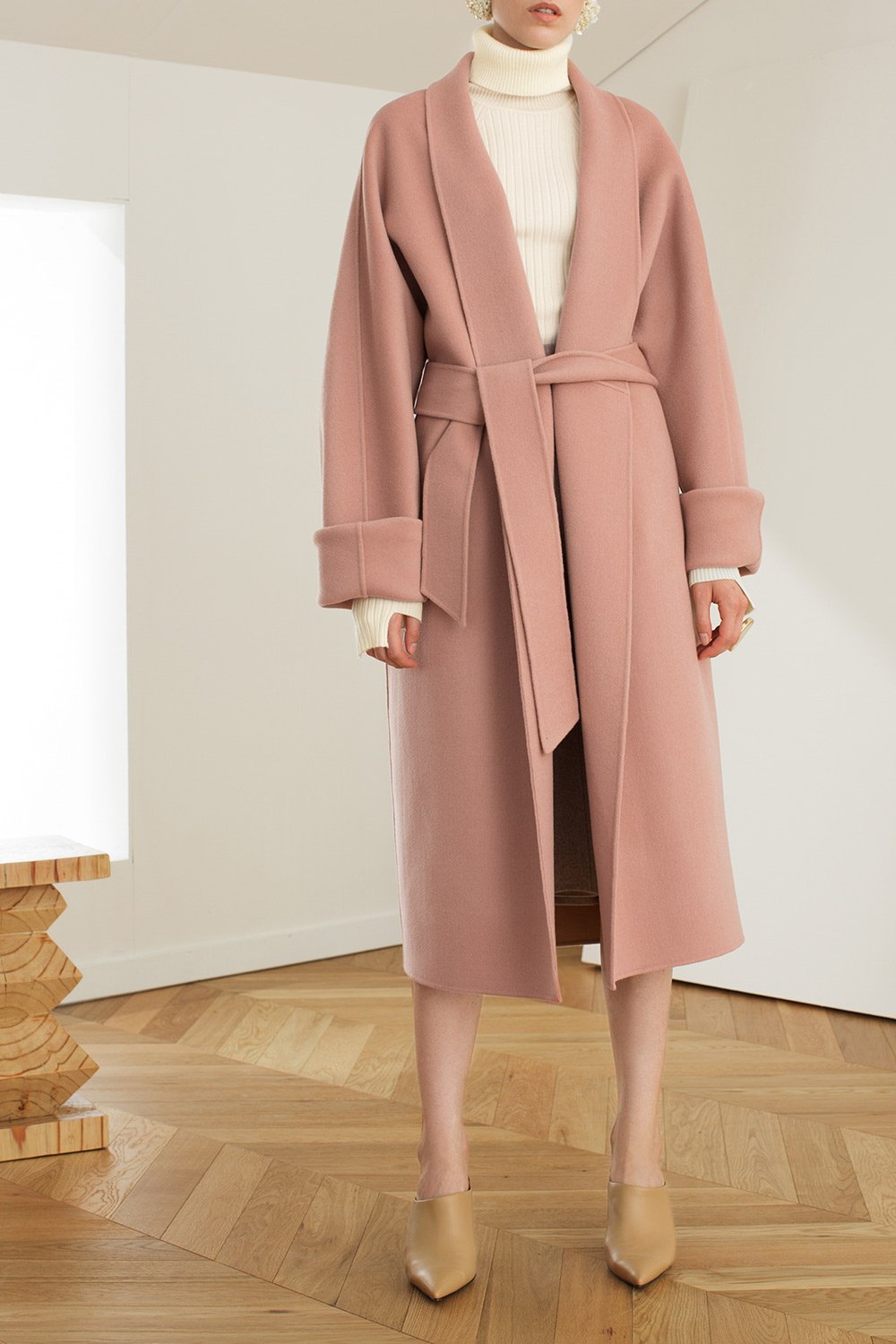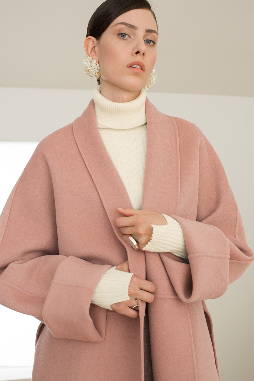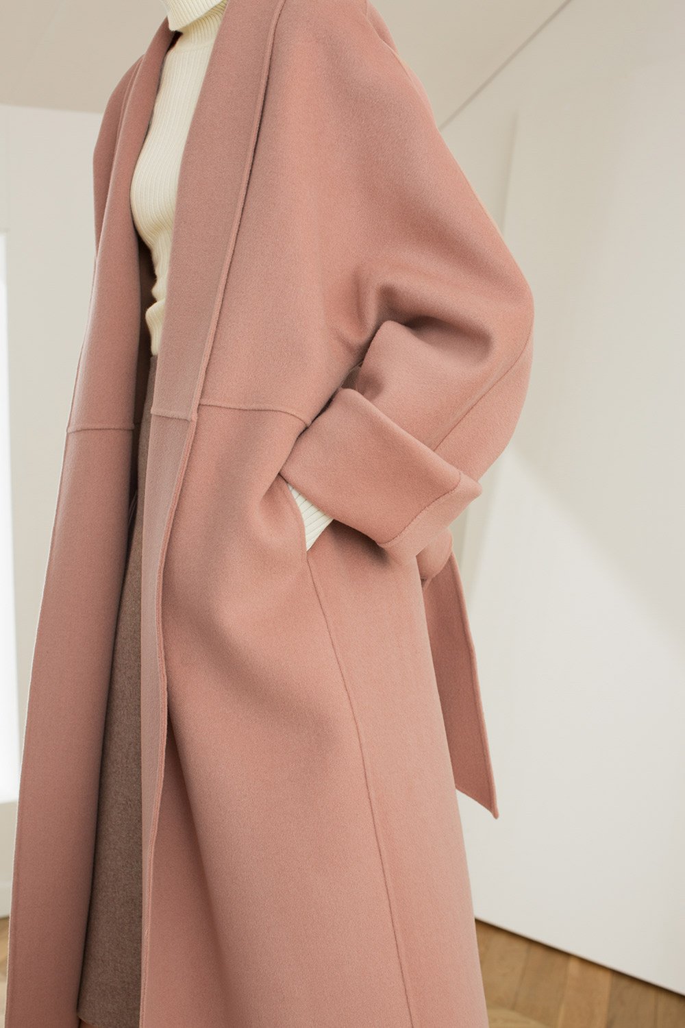 Wool blend coat features wide crop sleeves, mid-weight, straight collar, tonal belt, and loops. Sleeves are not sewn down, can be unrolled if preferred. Unlined.